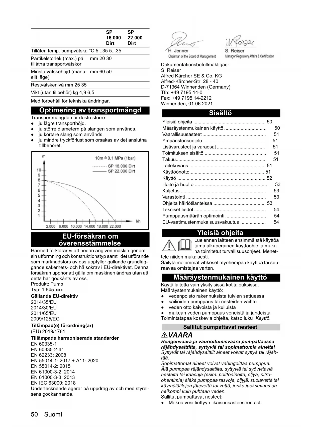 Dirt50 Suomi Med förbehåll för tekniska ändringar. Optimering av transportmängd Transportmängden är desto större: ● ju lägre transporthöjd. ● ju större diametern på slangen som används. ● ju kortare slang som används. ● ju mindre tryckförlust som orsakas av det anslutna tillbehöret. EU-försäkran om överensstämmelse Härmed förklarar vi att nedan angiven maskin genom sin utformning och konstruktionstyp samt i det utförande som marknadsförs av oss uppfyller gällande grundläg- gande säkerhets- och hälsokrav i EU-direktivet. Denna försäkran upphör att gälla om maskinen ändras utan att detta har godkänts av oss. Produkt: Pump Typ: 1.645-xxx Gällande EU-direktiv 2014/35/EU 2014/30/EU 2011/65/EU 2009/125/EG Tillämpad(e) förordning(ar) (EU) 2019/1781 Tillämpade harmoniserade standarder EN 60335-1 EN 60335-2-41 EN 62233: 2008 EN 55014-1: 2017 + A11: 2020 EN 55014-2: 2015 EN 61000-3-2: 2014 EN 61000-3-3: 2013 EN IEC 63000: 2018 Undertecknande agerar på uppdrag av och med styrel- sens godkännande. Dokumentationsbefullmäktigad: S. Reiser Alfred Kärcher SE & Co. KG Alfred-Kärcher-Str. 28 - 40 D-71364 Winnenden (Germany) Tfn: +49 7195 14-0 Fax: +49 7195 14-2212 Winnenden, 01.06.2021 Sisältö Yleisiä ohjeita Lue ennen laitteen ensimmäistä käyttöä tämä alkuperäinen käyttöohje ja muka- na toimitetut turvallisuusohjeet. Menet- tele niiden mukaisesti. Säilytä molemmat vihkoset myöhempää käyttöä tai seu- raavaa omistajaa varten. Määräystenmukainen käyttö Käytä laitetta vain yksityisissä kotitalouksissa. Määräystenmukainen käyttö: ● vedenpoisto rakennuksista tulvien sattuessa ● säiliöiden pumppaus tai nesteiden vaihto ● veden otto kaivoista ja kuiluista ● makean veden pumppaus veneistä ja jahdeista Toimintatapaa koskevia ohjeita, katso luku Käyttö. Sallitut pumpattavat nesteet VAARA Hengenvaara ja vaurioitumisvaara pumpattaessa räjähdysalttiita, syttyviä tai sopimattomia aineita! Syttyvät tai räjähdysalttiit aineet voivat syttyä tai räjäh- tää. Sopimattomat aineet voivat vahingoittaa pumppua. Älä pumppaa räjähdysalttiita, syttyviä tai syövyttäviä nesteitä tai kaasuja (esim. polttoaineita, öljyä, nitro- ohentimia) äläkä pumppaa rasvoja, öljyjä, suolavettä tai käymälätilojen jätevettä tai vettä, jonka juoksevuus on heikompi kuin puhtaan veden. Sallitut pumpattavat nesteet: ● Makea vesi tiettyyn likaisuusasteeseen asti. Tillåten temp. pumpvätska °C 5...35 5...35 Partikelstorlek (max.) på tillåtna transportvätskor mm 20 30 Minsta vätskehöjd (manu- ellt läge) mm 60 50 Restvätskenivå mm 25 35 Vikt (utan tillbehör) kg 4,9 6,5