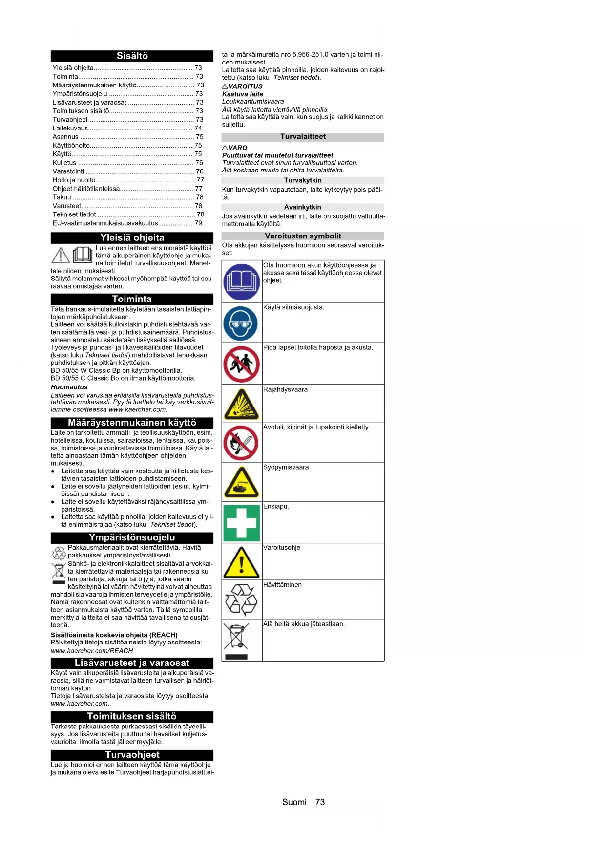 • dB(A) 84,1 84,1 BD 50/55 W Classic Bp BD 50/55 C Classic Bp Chairman of the Board of Management Director Regulatory Affairs & Certification H. Jenner S. ReiserSuomi 73 Sisältö Yleisiä ohjeita Lue ennen laitteen ensimmäistä käyttöä tämä alkuperäinen käyttöohje ja muka- na toimitetut turvallisuusohjeet. Menet- tele niiden mukaisesti. Säilytä molemmat vihkoset myöhempää käyttöä tai seu- raavaa omistajaa varten. Toiminta Tätä hankaus-imulaitetta käytetään tasaisten lattiapin- tojen märkäpuhdistukseen. Laitteen voi säätää kulloistakin puhdistustehtävää var- ten säätämällä vesi- ja puhdistusainemäärä. Puhdistus- aineen annostelu säädetään lisäyksellä säiliössä. Työleveys ja puhdas- ja likavesisäiliöiden tilavuudet (katso luku Tekniset tiedot) mahdollistavat tehokkaan puhdistuksen ja pitkän käyttöajan. BD 50/55 W Classic Bp on käyttömoottorilla. BD 50/55 C Classic Bp on ilman käyttömoottoria. Huomautus Laitteen voi varustaa erilaisilla lisävarusteilla puhdistus- tehtävän mukaisesti. Pyydä luettelo tai käy verkkosivuil- lamme osoitteessa www.kaercher.com. Määräystenmukainen käyttö Laite on tarkoitettu ammatti- ja teollisuuskäyttöön, esim. hotelleissa, kouluissa, sairaaloissa, tehtaissa, kaupois- sa, toimistoissa ja vuokrattavissa toimitiloissa. Käytä lai- tetta ainoastaan tämän käyttöohjeen ohjeiden mukaisesti. ● Laitetta saa käyttää vain kosteutta ja kiillotusta kes- tävien tasaisten lattioiden puhdistamiseen. ● Laite ei sovellu jäätyneiden lattioiden (esim. kylmi- öissä) puhdistamiseen. ● Laite ei sovellu käytettäväksi räjähdysalttiissa ym- päristöissä. ● Laitetta saa käyttää pinnoilla, joiden kaltevuus ei yli- tä enimmäisrajaa (katso luku Tekniset tiedot). Ympäristönsuojelu Pakkausmateriaalit ovat kierrätettäviä. Hävitä pakkaukset ympäristöystävällisesti. Sähkö- ja elektroniikkalaitteet sisältävät arvokkai- ta kierrätettäviä materiaaleja tai rakenneosia ku- ten paristoja, akkuja tai öljyjä, jotka väärin käsiteltyinä tai väärin hävitettyinä voivat aiheuttaa mahdollisia vaaroja ihmisten terveydelle ja ympäristölle. Nämä rakenneosat ovat kuitenkin välttämättömiä lait- teen asianmukaista käyttöä varten. Tällä symbolilla merkittyjä laitteita ei saa hävittää tavallisena talousjät- teenä. Sisältöaineita koskevia ohjeita (REACH) Päivitettyjä tietoja sisältöaineista löytyy osoitteesta: www.kaercher.com/REACH Lisävarusteet ja varaosat Käytä vain alkuperäisiä lisävarusteita ja alkuperäisiä va- raosia, sillä ne varmistavat laitteen turvallisen ja häiriöt- tömän käytön. Tietoja lisävarusteista ja varaosista löytyy osoitteesta www.kaercher.com. Toimituksen sisältö Tarkasta pakkauksesta purkaessasi sisällön täydelli- syys. Jos lisävarusteita puuttuu tai havaitset kuljetus- vaurioita, ilmoita tästä jälleenmyyjälle. Turvaohjeet Lue ja huomioi ennen laitteen käyttöä tämä käyttöohje ja mukana oleva esite Turvaohjeet harjapuhdistuslaittei- ta ja märkäimureita nro 5.956-251.0 varten ja toimi nii- den mukaisesti. Laitetta saa käyttää pinnoilla, joiden kaltevuus on rajoi- tettu (katso luku Tekniset tiedot). 몇 VAROITUS Kaatuva laite Loukkaantumisvaara Älä käytä laitetta viettävillä pinnoilla. Laitetta saa käyttää vain, kun suojus ja kaikki kannet on suljettu. Turvalaitteet 몇 VARO Puuttuvat tai muutetut turvalaitteet Turvalaitteet ovat sinun turvallisuuttasi varten. Älä koskaan muuta tai ohita turvalaitteita. Turvakytkin Kun turvakytkin vapautetaan, laite kytkeytyy pois pääl- tä. Avainkytkin Jos avainkytkin vedetään irti, laite on suojattu valtuutta- mattomalta käytöltä. Varoitusten symbolit Ota akkujen käsittelyssä huomioon seuraavat varoituk- set: Yleisiä ohjeita p. 73