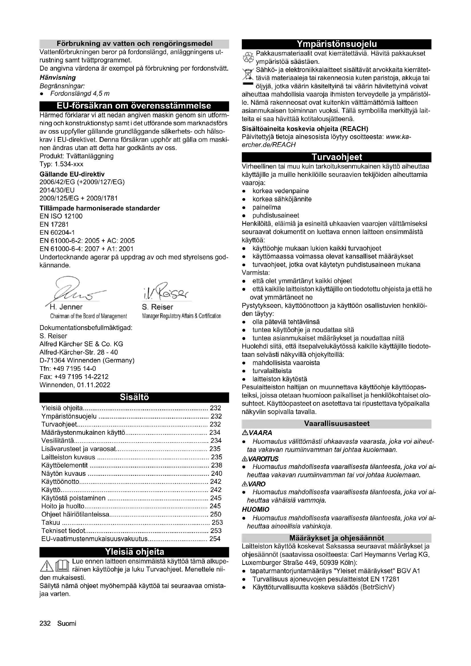 Takuu Jokaisessa maassa ovat voimassa vastaavan myyntiyhtiön jul- kaisemat takuuehdot. Korjaamme laitteessa mahdollisesti ilme- nevät häiriöt takuuajan kuluessa maksutta, jos häiriöiden syynä ovat olleet materiaali- tai valmistusvirheet. Takuutapauksessa pyydämme ottamaan yhteyttä ostotositteen kanssa jälleenmyy- jään tai lähimpään valtuutettuun asiakaspalveluun. (Osoite, katso takasivu) Tekniset tiedot Oikeus teknisiin muutoksiin pidätetään. CW 3 / CW 5 (CWB 3/1) CW 3 / CW 5 (CWB 3/2) CW 3 / CW 5 (CWB 3/3) Laitteiston mitat Pesukorkeus mm 2100, 2200, 2300 2400, 2500, 2600 2700, 2800, 2900 Rungon korkeus mm 2900 3200 3500 Kokonaiskorkeus mm 2930, 3030, 3130 3230, 3330, 3430 3530, 3630, 3730 Rungon leveys mm 3500 3500 3500 Kokonaisleveys, sivuharjat mm 4040 4040 4040 Kokonaisleveys, roiskesuoja mm 4060 4060 4060 Rungon syvyys / syvyys pyörivillä harjoilla mm 1600 / 2170 1600 / 2170 1600 / 2170 Kokonaispituus, lyhyt halli mm 2070 2070 2070 Laitteiston leveys peilin korkeudella mm 2450 2450 2450 Laitteiston leveys pyöränpesun alueella mm 2100 2100 2100 Kaistan leveys, ajokiskot mm 2550, 2700, 2800 2550, 2700, 2800 2550, 2700, 2800 Hallin leveys mukaan lukien turvaväli mm 4500 4500 4500 Pesuharjat Harjan halkaisija, sivu mm 975 975 975 Harjan pyörintänopeus, sivu 1/min 107 107 107 Harjan halkaisija, katto mm 975 975 975 Harjan pyörintänopeus, katto 1/min 127 127 127 Portaalinopeus m/min 0 - 24 0 - 24 0 - 24 Sähköliitäntä Verkkojännite V 400 400 400 Taajuus Hz505050 Liitäntäteho kW 10-16 10-16 10-16 Ohjauksen maks. sulake A 35-50 35-50 35-50 Vesiliitäntä Nimellissuuruus Tuuma 1 1 1 Virtauspaine DIN 1988:n mukaan (kun 100 l/min) MPa 0,4 - 0,6 0,4 - 0,6 0,4 - 0,6 Maksimilämpötila °C505050 Paineilmaliitäntä Nimellissuuruus Tuuma 1/2 1/2 1/2 Paine MPa 0,6 - 0,8 0,6 - 0,8 0,6 - 0,8 Kulutus/pesu (ilman jäätymisenestolaitteita, ohjelmasta riip- puen ajoneuvon pituudella 4,5 m) l505050 Kulutus jäätymisenestolla, n. l 700 700 700 Määritetyt arvot EN 60335-2-79 mukaan Melutaso, pesu ja kuivaus dB(A) 87 87 87 Melutaso, vain kuivainkäyttö dB(A) 91 91 91 Äänitaso korkeapainemoduuli dB(A) 86 86 86 Ääniteho, pesu ja kuivaus dB(A) 101 101 101 Ääniteho, vain kuivainkäyttö dB(A) 105 105 105 Ääniteho, korkeapainemoduuli dB(A) 101 101 101 Epävarmuus dB(A) 3 3 3254 Ελληνικά Veden- ja puhdistusaineenkulutus Vedenkulutus riippuu ajoneuvon pituudesta, laitteiston varuste- lusta ja pesuohjelmasta. Annetut arvot ovat esimerkkejä pesukertakohtaisesta kulutuk- sesta. Huomautus Reunaehdot: ● Ajoneuvon pituus 4,5 m EU-vaatimustenmukaisuusvakuutus Täten vakuutamme, että jäljempänä kuvattu kone vastaa suun- nittelultaan ja rakenteeltaan sekä meidän markkinoille tuoma- namme mallina EU-direktiivien olennaisia turvallisuus- ja terveysvaatimuksia. Jos konetta muutetaan ilman meidän hyväk- syntäämme, tämän vakuutuksen voimassaolo raukeaa. Tuote: Pesujärjestelmä Tyyppi: 1.534-xxx Sovellettavat EU-direktiivit 2006/42/EY (+2009/127/EY) 2014/30/EU 2009/125/EY + 2009/1781 Sovelletut yhdenmukaistetut standardit EN ISO 12100 EN 17281 EN 60204-1 EN 61000-6-2: 2005 + AC: 2005 EN 61000-6-4: 2007 + A1: 2001 Allekirjoittaneet toimivat yrityksen johtokunnan puolesta ja sen valtakirjalla. Dokumentointivastaava: S. Reiser Alfred Kärcher SE & Co. KG Alfred-Kärcher-Str. 28 - 40 71364 Winnenden (Germany) Puh.: +49 7195 14-0 Faksi: +49 7195 14-2212 Winnenden, 1.11.2022 Περιεχόμενα Γενικές υποδείξεις Πριν από την πρώτη χρήση της συσκευής, διαβάστε αυτές τις γνήσιες οδηγίες χρήσης και το κεφάλαιο Υποδείξεις ασφαλείας. Εφαρμόζετε αυτές τις οδηγίες. Φυλάξτε αυτές τις οδηγίες για μεταγενέστερη χρήση ή για τον επόμενο ιδιοκτήτη. Προστασία του περιβάλλοντος Τα υλικά συσκευασίας είναι ανακυκλώσιμα. Ανακυκλώνετε τις συσκευασίες με περιβαλλοντικά ορθό τρόπο. Οι ηλεκτρικές και οι ηλεκτρονικές συσκευές περιέχουν πολύτιμα ανακυκλώσιμα υλικά και, συχνά, επίσης εξαρτήματα όπως απλές και επαναφορτιζόμενες μπαταρίες ή λάδια, που σε περίπτωση λανθασμένης χρήσης ή απόρριψης μπορούν να θέσουν σε κίνδυνο την ανθρώπινη υγεία και το