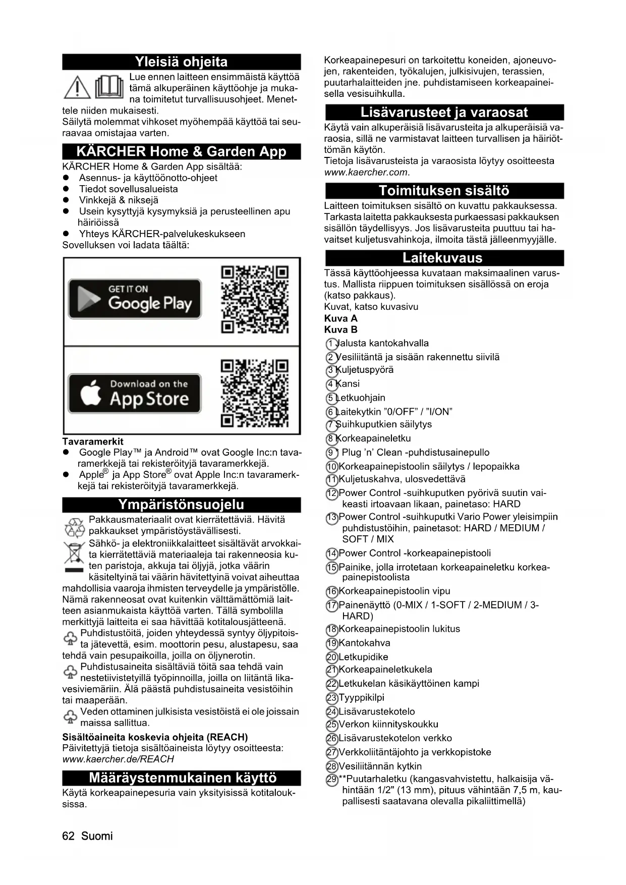- EU-vaatimustenmukaisuusvakuutus Chairman of the Board of Management Director Regulatory Affairs & Certification H. Jenner S. Reiser62 Suomi Yleisiä ohjeita Lue ennen laitteen ensimmäistä käyttöä tämä alkuperäinen käyttöohje ja muka- na toimitetut turvallisuusohjeet. Menet- tele niiden mukaisesti. Säilytä molemmat vihkoset myöhempää käyttöä tai seu- raavaa omistajaa varten. KÄRCHER Home & Garden App KÄRCHER Home & Garden App sisältää: Asennus- ja käyttöönotto-ohjeet Tiedot sovellusalueista Vinkkejä & niksejä Usein kysyttyjä kysymyksiä ja perusteellinen apu häiriöissä Yhteys KÄRCHER-palvelukeskukseen Sovelluksen voi ladata täältä: Tavaramerkit Google Play™ ja Android™ ovat Google Inc:n tava- ramerkkejä tai rekisteröityjä tavaramerkkejä. Apple p. 66