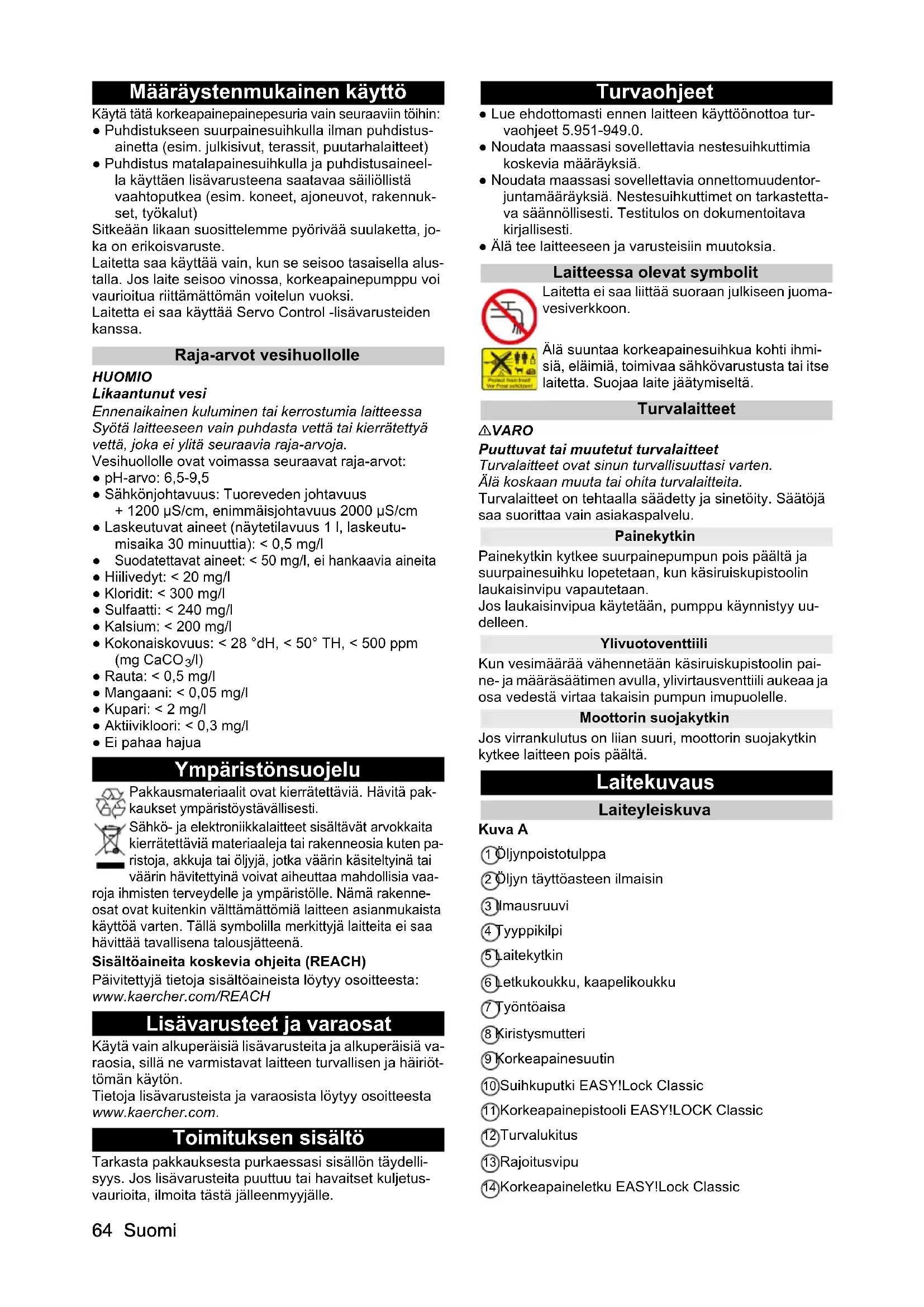 /l) ● Rauta: < 0,5 mg/l ● Mangaani: < 0,05 mg/l ● Kupari: < 2 mg/l ● Aktiivikloori: < 0,3 mg/l ● Ei pahaa hajua Ympäristönsuojelu Pakkausmateriaalit ovat kierrätettäviä. Hävitä pak- kaukset ympäristöystävällisesti. Sähkö- ja elektroniikkalaitteet sisältävät arvokkaita kierrätettäviä materiaaleja tai rakenneosia kuten pa- ristoja, akkuja tai öljyjä, jotka väärin käsiteltyinä tai väärin hävitettyinä voivat aiheuttaa mahdollisia vaa- roja ihmisten terveydelle ja ympäristölle. Nämä rakenne- osat ovat kuitenkin välttämättömiä laitteen asianmukaista käyttöä varten. Tällä symbolilla merkittyjä laitteita ei saa hävittää tavallisena talousjätteenä. Sisältöaineita koskevia ohjeita (REACH) Päivitettyjä tietoja sisältöaineista löytyy osoitteesta: www.kaercher.com/REACH Lisävarusteet ja varaosat Käytä vain alkuperäisiä lisävarusteita ja alkuperäisiä va- raosia, sillä ne varmistavat laitteen turvallisen ja häiriöt- tömän käytön. Tietoja lisävarusteista ja varaosista löytyy osoitteesta www.kaercher.com. Toimituksen sisältö Tarkasta pakkauksesta purkaessasi sisällön täydelli- syys. Jos lisävarusteita puuttuu tai havaitset kuljetus- vaurioita, ilmoita tästä jälleenmyyjälle. Turvaohjeet ● Lue ehdottomasti ennen laitteen käyttöönottoa tur- vaohjeet 5.951-949.0. ● Noudata maassasi sovellettavia nestesuihkuttimia koskevia määräyksiä. ● Noudata maassasi sovellettavia onnettomuudentor- juntamääräyksiä. Nestesuihkuttimet on tarkastetta- va säännöllisesti. Testitulos on dokumentoitava kirjallisesti. ● Älä tee laitteeseen ja varusteisiin muutoksia. Laitteessa olevat symbolit Laitetta ei saa liittää suoraan julkiseen juoma- vesiverkkoon. Älä suuntaa korkeapainesuihkua kohti ihmi- siä, eläimiä, toimivaa sähkövarustusta tai itse laitetta. Suojaa laite jäätymiseltä. Turvalaitteet 몇 VARO Puuttuvat tai muutetut turvalaitteet Turvalaitteet ovat sinun turvallisuuttasi varten. Älä koskaan muuta tai ohita turvalaitteita. Turvalaitteet on tehtaalla säädetty ja sinetöity. Säätöjä saa suorittaa vain asiakaspalvelu. Painekytkin Painekytkin kytkee suurpainepumpun pois päältä ja suurpainesuihku lopetetaan, kun käsiruiskupistoolin laukaisinvipu vapautetaan. Jos laukaisinvipua käytetään, pumppu käynnistyy uu- delleen. Ylivuotoventtiili Kun vesimäärää vähennetään käsiruiskupistoolin pai- ne- ja määräsäätimen avulla, ylivirtausventtiili aukeaa ja osa vedestä virtaa takaisin pumpun imupuolelle. Moottorin suojakytkin Jos virrankulutus on liian suuri, moottorin suojakytkin kytkee laitteen pois päältä. Laitekuvaus Laiteyleiskuva Kuva A 1 Öljynpoistotulppa 2 Öljyn täyttöasteen ilmaisin 3 Ilmausruuvi 4 Tyyppikilpi 5 Laitekytkin 6 Letkukoukku, kaapelikoukku 7 Työntöaisa 8 Kiristysmutteri 9 Korkeapainesuutin 10 Suihkuputki EASY!Lock Classic 11 Korkeapainepistooli EASY!LOCK Classic 12 Turvalukitus 13 Rajoitusvipu 14 Korkeapaineletku EASY!Lock ClassicSuomi 65 15 Suihkuputken pidike 16 Varustelokero 17 Paine-/määräsäädin 18 Korkeapaineliitäntä EASY!Lock 19 Hienosuodatin 20 Vesiliitäntä Värimerkintä ● Puhdistusprosessin käyttöelementit ovat keltaisia. ● Huollon ja kunnossapidon käyttöelementit ovat kirk- kaan harmaita. Asennus Työntöaisan kiinnittäminen