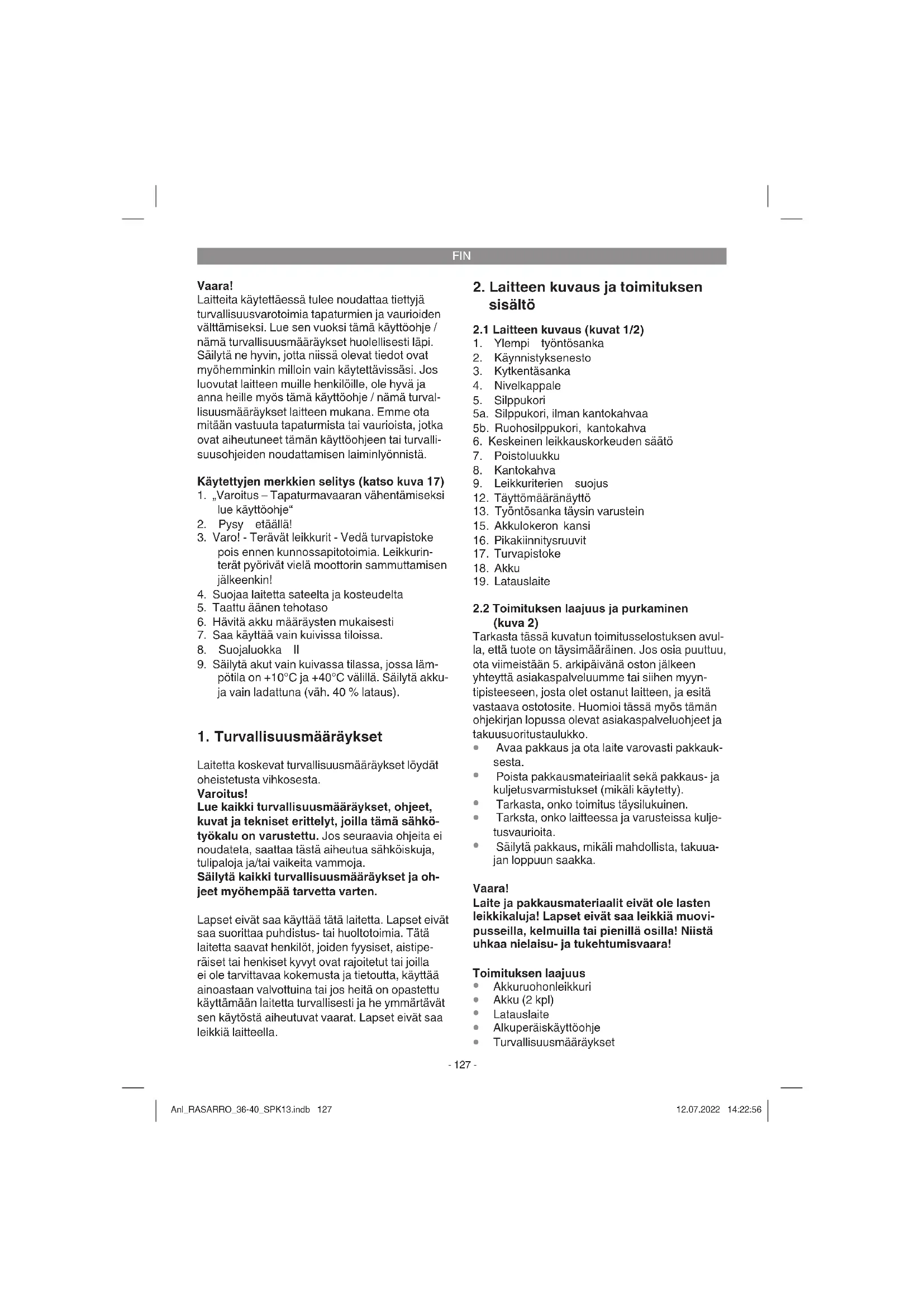 kon, josta selviävät latauslaitteen LED-näytön merkitykset. Latauksen aikana akku saattaa lämmetä hieman. Tämä on kuitenkin normaalia. Anl_RASARRO_36-40_SPK13.indb 129Anl_RASARRO_36-40_SPK13.indb 129 12.07.2022 14:22:5612.07.2022 14:22:56FIN