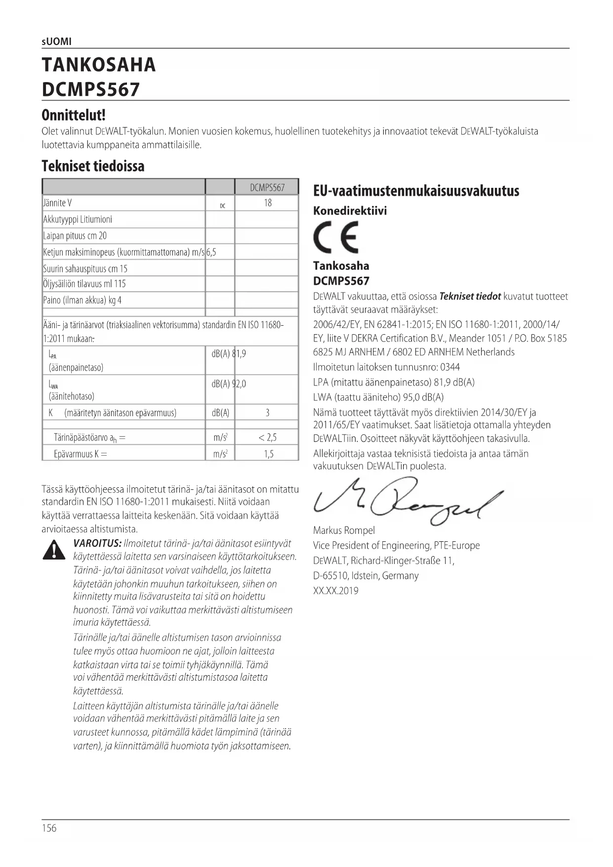 EY, liite V DEKRA Certification B.V., Meander 1051 / P.O. Box 5185 6825 MJ ARNHEM / 6802 ED ARNHEM Netherlands Ilmoitetun laitoksen tunnusnro: 0344 LPA (mitattu äänenpainetaso) 81,9 dB(A) LWA (taattu ääniteho) 95,0 dB(A) Nämä tuotteet täyttävät myös direktiivien 2014/30/EY ja 2011/65/EY vaatimukset. Saat lisätietoja ottamalla yhteyden DeWALTiin. Osoitteet näkyvät käyttöohjeen takasivulla. Allekirjoittaja vastaa teknisistä tiedoista ja antaa tämän vakuutuksen DeWALTin puolesta. Markus Rompel Vice President of Engineering, PTE-Europe DeWALT, Richard-Klinger-Straße 11, D-65510, Idstein, Germany XX.XX.2019 Tässä käyttöohjeessa ilmoitetut tärinä- ja/tai äänitasot on mitattu standardin EN ISO 11680-1:2011 mukaisesti. Niitä voidaan käyttää verrattaessa laitteita keskenään. Sitä voidaan käyttää arvioitaessa altistumista.