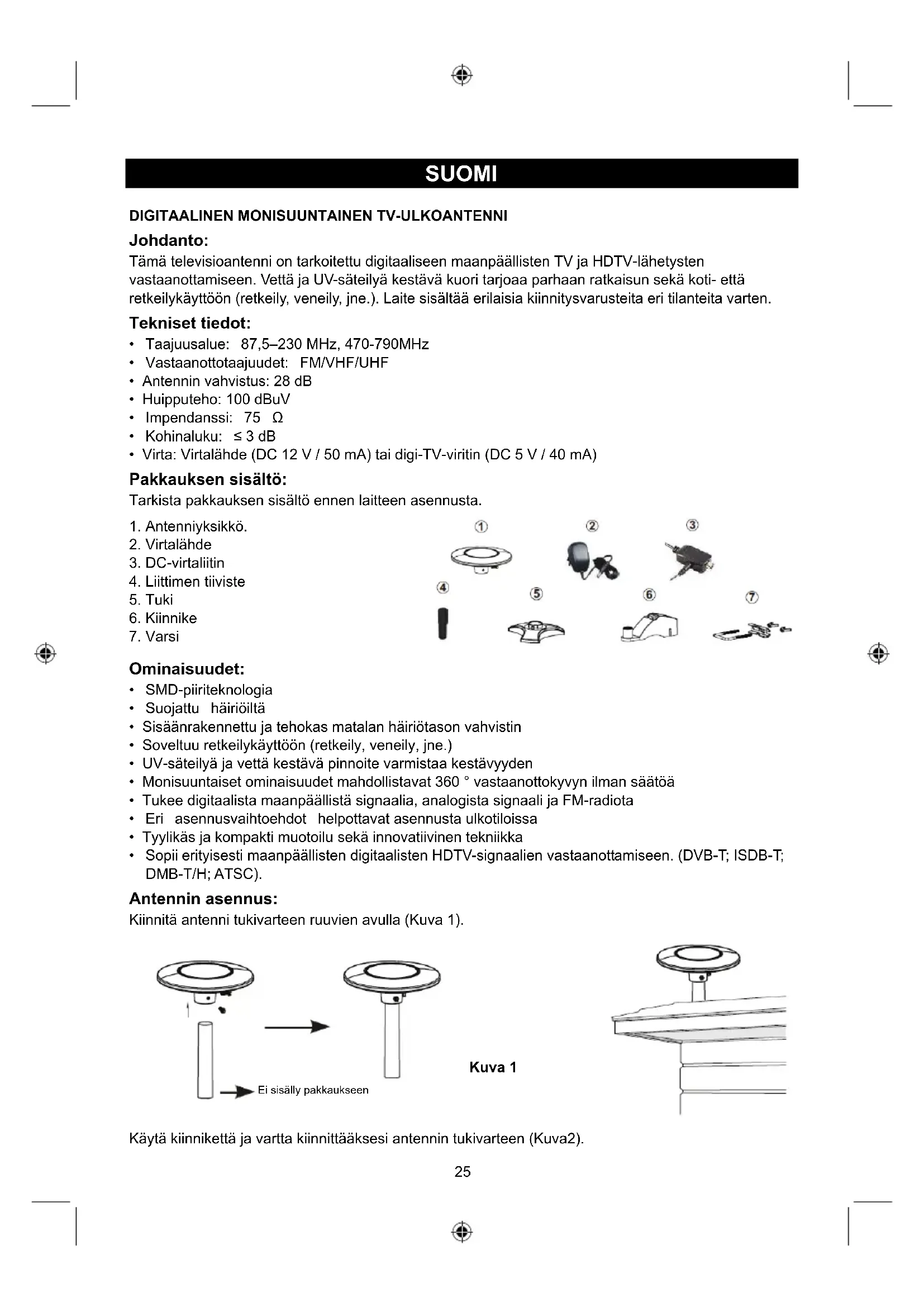 Johdanto: Tämä televisioantenni on tarkoitettu digitaaliseen maanpäällisten TV ja HDTV-lähetysten vastaanottamiseen. Vettä ja UV-säteilyä kestävä kuori tarjoaa parhaan ratkaisun sekä koti- että retkeilykäyttöön (retkeily, veneily, jne.). Laite sisältää erilaisia kiinnitysvarusteita eri tilanteita varten. Tekniset tiedot: