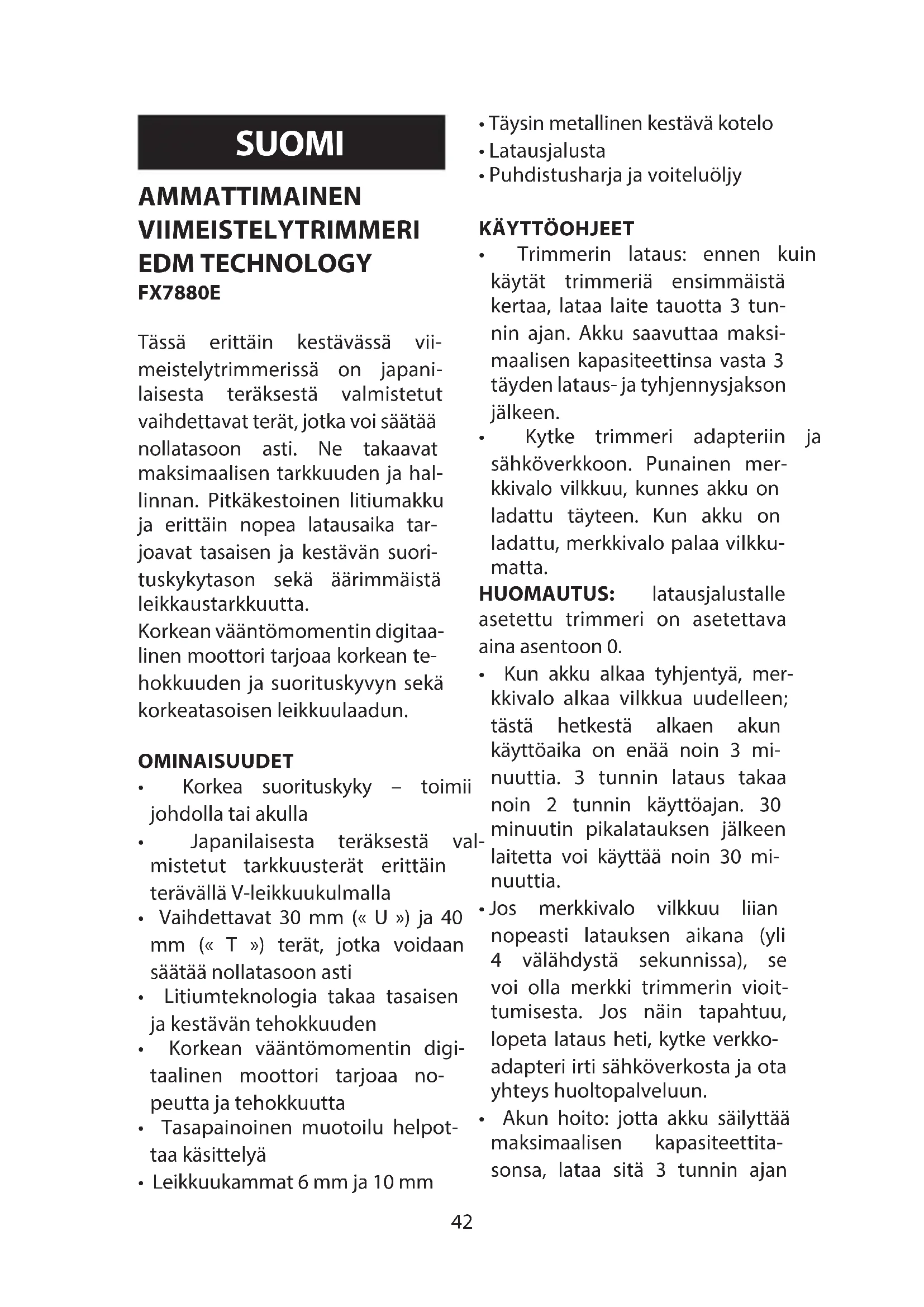 - Etter vedlikehold, sett klippe- hodet tilbake på plass.42 AMMATTIMAINEN VIIMEISTELYTRIMMERI EDM TECHNOLOGY FX7880E Tässä erittäin kestävässä vii- meistelytrimmerissä on japani- laisesta teräksestä valmistetut vaihdettavat terät, jotka voi säätää nollatasoon asti. Ne takaavat maksimaalisen tarkkuuden ja hal- linnan. Pitkäkestoinen litiumakku ja erittäin nopea latausaika tar- joavat tasaisen ja kestävän suori- tuskykytason sekä äärimmäistä leikkaustarkkuutta. Korkean vääntömomentin digitaa- linen moottori tarjoaa korkean te- hokkuuden ja suorituskyvyn sekä korkeatasoisen leikkuulaadun. OMINAISUUDET