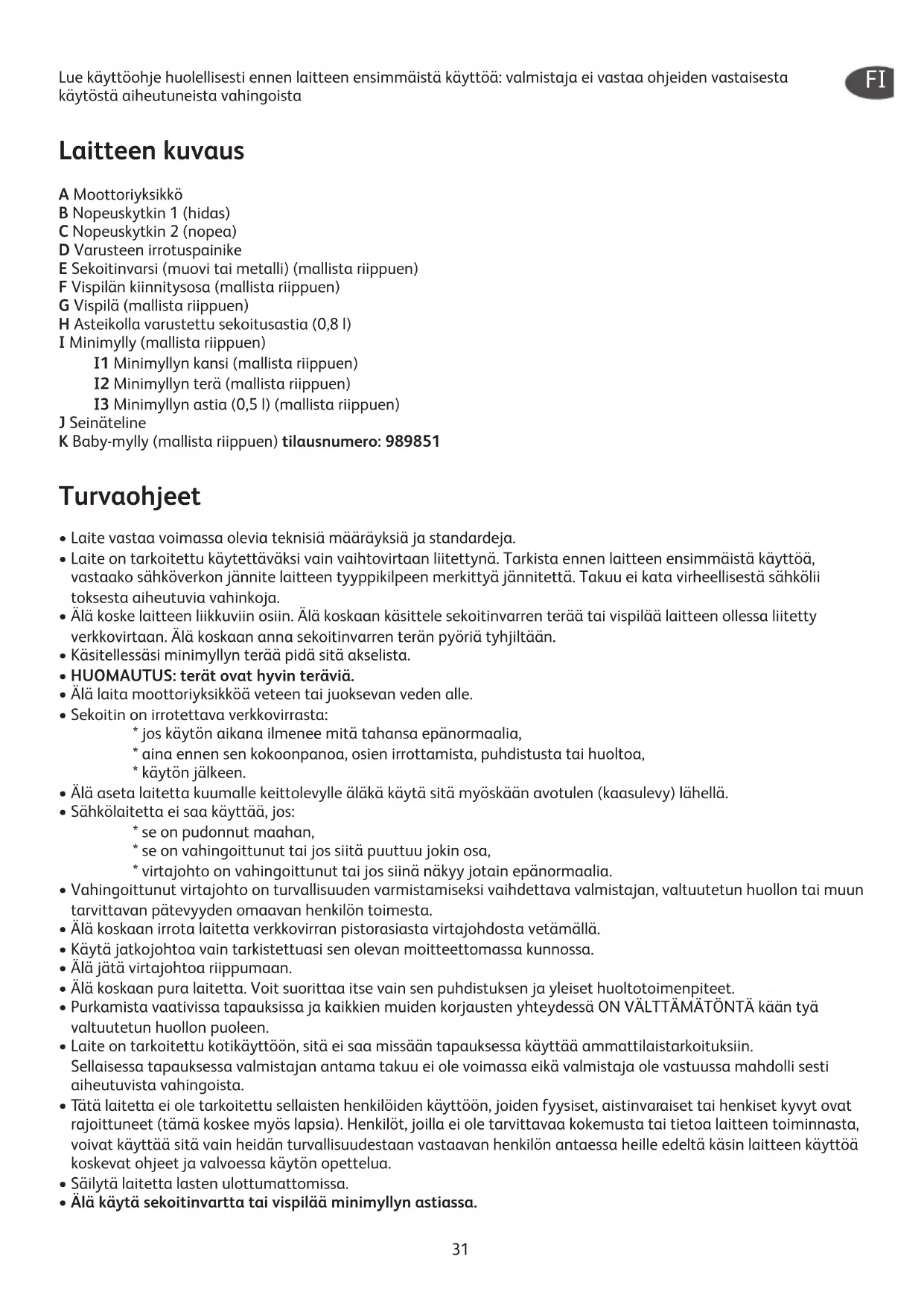 - On suositeltavaa puhdistaa sekoitinvarsi heti jokaisen käyttökerran jälkeen. Jos muoviosiin tarttuu väriä aineksista kuten esim. porkkanoista, on värittyneet kohdat hyvä pyyhkiä ruokaöljyyn kostutetulla kankaalla ja puhdistaa sitten tavalliseen tapaan. Laitteen säilytys Käytä seinätelinettä (J), jossa laite on aina käden ulottuvilla. Poraa seinätelineen kiinnittämistä varten seinään kaksi reikää samalle tasolle 30 mm päähän toisistaan ja kiinnitä teline niihin ruuveilla. Ota huomioon ruuvien kiristyssuunta. Sähkölaitteen tai elektronisen laitteen käytöstä poistaminen Ota huomioon ympäristön suojelu! Laitteessa on suuri määrä uudelleen käytettäviä materiaaleja. Vie siksi laite jätteiden keräyspisteeseen tai valtuutettuun huoltoon, joka huolehtii sen käytöstä poistamisesta.34 Læs bruganvisningen grundigt inden De anvender apparatet første gang. I tilfælde af at brugsanvisningen ikke følges, fritages vi for ethvert ansvar. Beskrivelse A Motordel B Startknap – hastighed 1 (langsomt) C Startknap – hastighed 2 (hurtigt) D Knap til udløsning af tilbehør E Mixertilbehør (plastik eller metal, afhængigt af model) F Fastgørelsesdel til piskeris (afhængigt af model) G Piskeris (afhængigt af model) H Røreskål med måleinddelinger (0,8 L) I Mini-hakker (afhængigt af model) I1 Låg til mini-hakker (afhængigt af model) I2 Knivblade til mini-hakker (afhængigt af model) I3 Skål til mini-hakker (0,5 L) (afhængigt af model) J Vægholder K Baby-hakker (afhængigt af model) - Ref : 989851 Sikkerhedsanvisninger