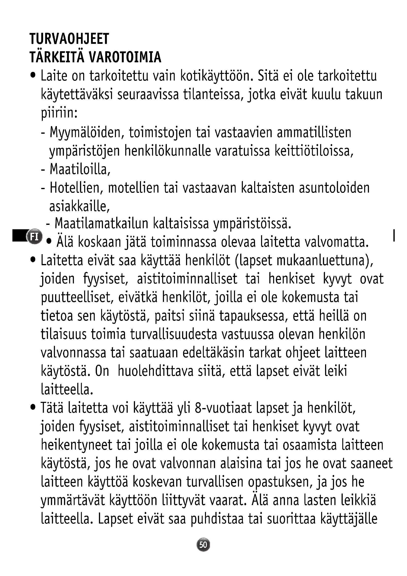 - Laitetta eivät saa käyttää henkilöt (lapset mukaanluettuna), joiden fyysiset, aistitoiminnalliset tai henkiset kyvyt ovat puutteelliset, eivätkä henkilöt, joilla ei ole kokemusta tai tietoa sen käytöstä, paitsi siinä tapauksessa, että heillä on tilaisuus toimia turvallisuudesta vastuussa olevan henkilön valvonnassa tai saatuaan edeltäkäsin tarkat ohjeet laitteen käytöstä. On huolehdittava siitä, että lapset eivät leiki laitteella.