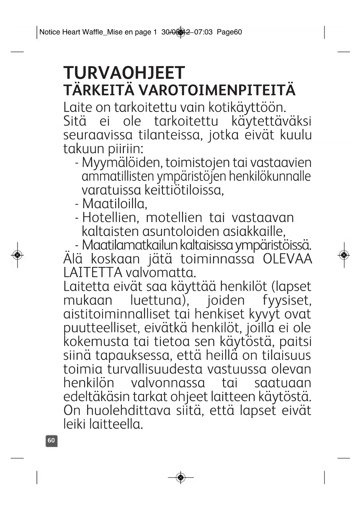 Maatilamatkailun kaltaisissa ympäristöissä. Älä koskaan jätä toiminnassa OLEVAA LAITETTA valvomatta. Laitetta eivät saa käyttää henkilöt (lapset mukaan luettuna), joiden fyysiset, aistitoiminnalliset tai henkiset kyvyt ovat puutteelliset, eivätkä henkilöt, joilla ei ole kokemusta tai tietoa sen käytöstä, paitsi siinä tapauksessa, että heillä on tilaisuus toimia turvallisuudesta vastuussa olevan henkilön valvonnassa tai saatuaan edeltäkäsin tarkat ohjeet laitteen käytöstä. On huolehdittava siitä, että lapset eivät leiki laitteella. Notice Heart Waffle_Mise en page 1 30/05/12 07:03 Page6061
