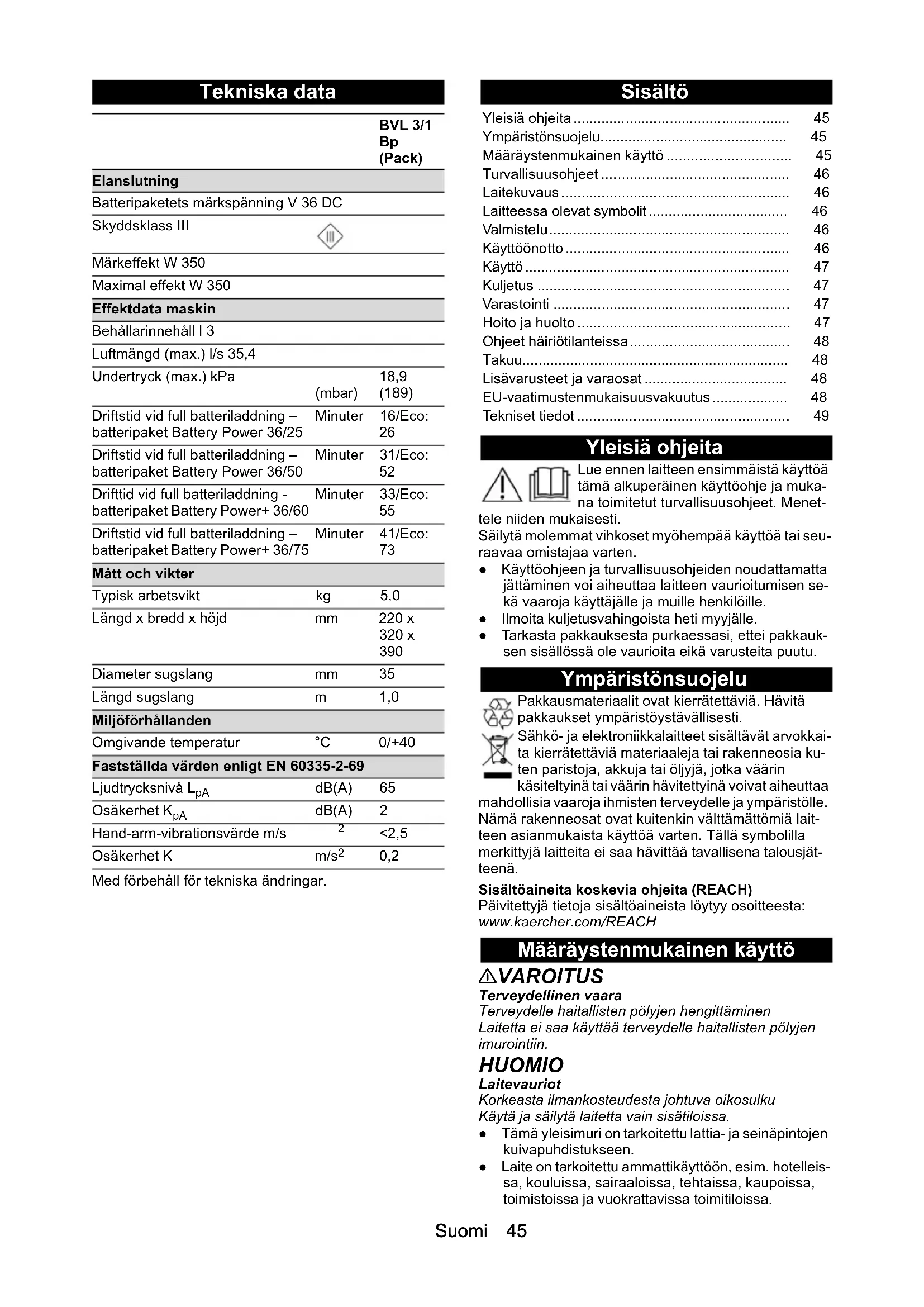 Undertecknande agerar på uppdrag av och med styrel- sens godkännande. Dokumentationsbefullmäktigad: S. Reiser Alfred Kärcher SE & Co. KG Alfred-Kärcher-Str. 28 - 40 D-71364 Winnenden (Germany) Tfn: +49 7195 14-0 Fax: +49 7195 14-2212 Winnenden, 2020/10/01 Beteckning Beställ- ningsnum- mer, reservdel Artikelnum- mer, oför- packad Batteripaket Battery Power+ 36/75 2.445-043.0 6.445-059.0 Batteripaket Battery Power+ 36/60 2.042-022.0 6.445-085.0 Batteripaket Battery Power 36/50 2.445-031.0 6.445-039.0 Batteripaket Battery Power 36/25 2.445-030.0 6.445-038.0 Snabbladdare Battery Power+ 36/60 (EU) 2.445-045.0 6.445-063.0 Snabbladdare Battery Power+ 36/60 (GB) 2.445-047.0 6.445-065.0 Snabbladdare Battery Power+ 36/60 (AU) 2.445-051.0 6.445-069.0Suomi 45 Tekniska data Med förbehåll för tekniska ändringar. Sisältö Yleisiä ohjeita Lue ennen laitteen ensimmäistä käyttöä tämä alkuperäinen käyttöohje ja muka- na toimitetut turvallisuusohjeet. Menet- tele niiden mukaisesti. Säilytä molemmat vihkoset myöhempää käyttöä tai seu- raavaa omistajaa varten. ● Käyttöohjeen ja turvallisuusohjeiden noudattamatta jättäminen voi aiheuttaa laitteen vaurioitumisen se- kä vaaroja käyttäjälle ja muille henkilöille. ● Ilmoita kuljetusvahingoista heti myyjälle. ● Tarkasta pakkauksesta purkaessasi, ettei pakkauk- sen sisällössä ole vaurioita eikä varusteita puutu. Ympäristönsuojelu Pakkausmateriaalit ovat kierrätettäviä. Hävitä pakkaukset ympäristöystävällisesti. Sähkö- ja elektroniikkalaitteet sisältävät arvokkai- ta kierrätettäviä materiaaleja tai rakenneosia ku- ten paristoja, akkuja tai öljyjä, jotka väärin käsiteltyinä tai väärin hävitettyinä voivat aiheuttaa mahdollisia vaaroja ihmisten terveydelle ja ympäristölle. Nämä rakenneosat ovat kuitenkin välttämättömiä lait- teen asianmukaista käyttöä varten. Tällä symbolilla merkittyjä laitteita ei saa hävittää tavallisena talousjät- teenä. Sisältöaineita koskevia ohjeita (REACH) Päivitettyjä tietoja sisältöaineista löytyy osoitteesta: www.kaercher.com/REACH Määräystenmukainen käyttö 몇 VAROITUS Terveydellinen vaara Terveydelle haitallisten pölyjen hengittäminen Laitetta ei saa käyttää terveydelle haitallisten pölyjen imurointiin. HUOMIO Laitevauriot Korkeasta ilmankosteudesta johtuva oikosulku Käytä ja säilytä laitetta vain sisätiloissa. ● Tämä yleisimuri on tarkoitettu lattia- ja seinäpintojen kuivapuhdistukseen. ● Laite on tarkoitettu ammattikäyttöön, esim. hotelleis- sa, kouluissa, sairaaloissa, tehtaissa, kaupoissa, toimistoissa ja vuokrattavissa toimitiloissa. BVL 3/1