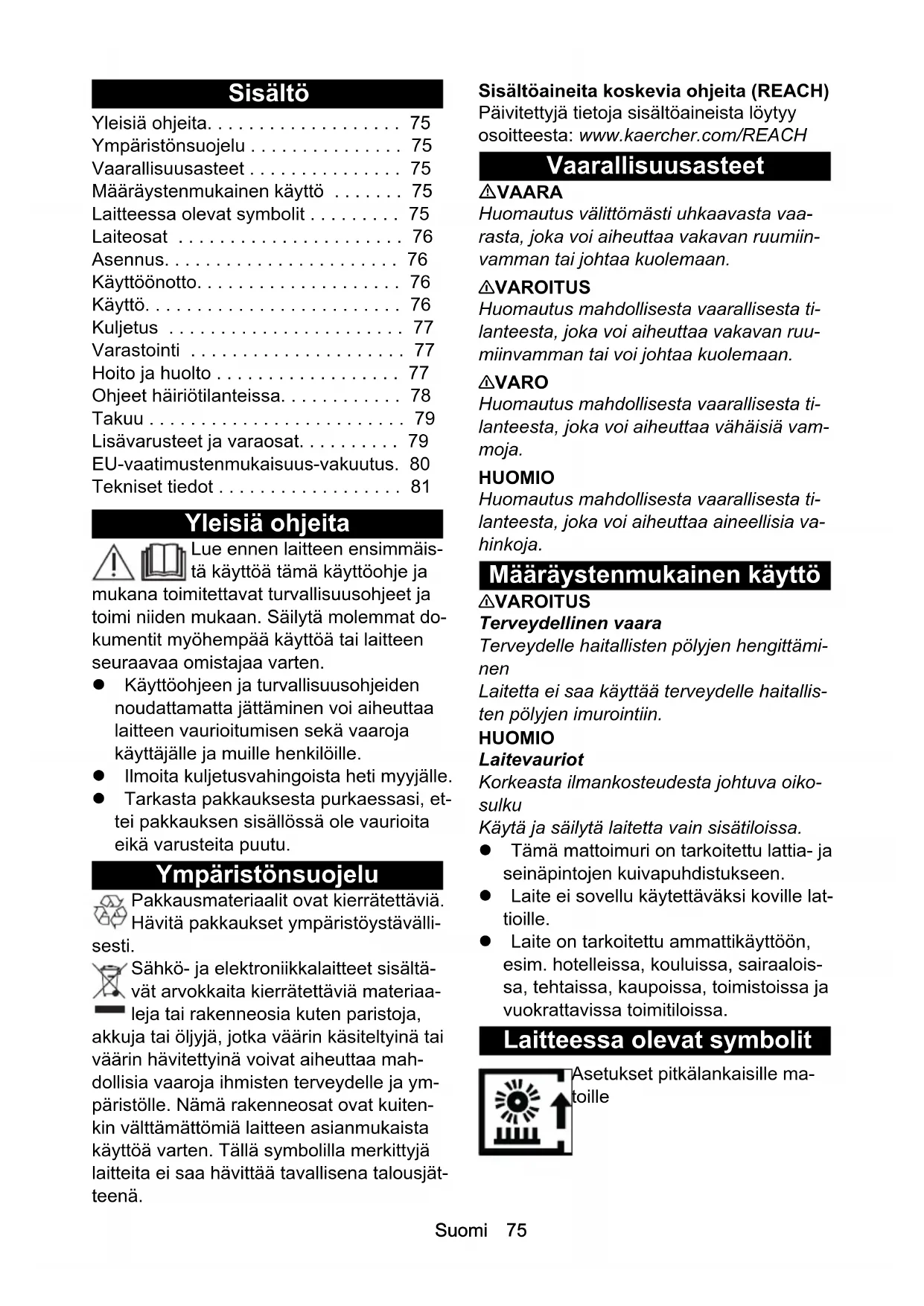 • H05VV-F 2x1,0 H05VV-F 2x1,0 Komponentnummer (EU/GB) 6.650-913.0 6.650-913.0 Kabellängd m 0,1 0,1Suomi 75 Sisältö Yleisiä ohjeita Lue ennen laitteen ensimmäis- tä käyttöä tämä käyttöohje ja mukana toimitettavat turvallisuusohjeet ja toimi niiden mukaan. Säilytä molemmat do- kumentit myöhempää käyttöä tai laitteen seuraavaa omistajaa varten. Käyttöohjeen ja turvallisuusohjeiden noudattamatta jättäminen voi aiheuttaa laitteen vaurioitumisen sekä vaaroja käyttäjälle ja muille henkilöille. Ilmoita kuljetusvahingoista heti myyjälle. Tarkasta pakkauksesta purkaessasi, et- tei pakkauksen sisällössä ole vaurioita eikä varusteita puutu. Ympäristönsuojelu Pakkausmateriaalit ovat kierrätettäviä. Hävitä pakkaukset ympäristöystävälli- sesti. Sähkö- ja elektroniikkalaitteet sisältä- vät arvokkaita kierrätettäviä materiaa- leja tai rakenneosia kuten paristoja, akkuja tai öljyjä, jotka väärin käsiteltyinä tai väärin hävitettyinä voivat aiheuttaa mah- dollisia vaaroja ihmisten terveydelle ja ym- päristölle. Nämä rakenneosat ovat kuiten- kin välttämättömiä laitteen asianmukaista käyttöä varten. Tällä symbolilla merkittyjä laitteita ei saa hävittää tavallisena talousjät- teenä. Sisältöaineita koskevia ohjeita (REACH) Päivitettyjä tietoja sisältöaineista löytyy osoitteesta: www.kaercher.com/REACH Vaarallisuusasteet VAARA Huomautus välittömästi uhkaavasta vaa- rasta, joka voi aiheuttaa vakavan ruumiin- vamman tai johtaa kuolemaan. 몇 VAROITUS Huomautus mahdollisesta vaarallisesta ti- lanteesta, joka voi aiheuttaa vakavan ruu- miinvamman tai voi johtaa kuolemaan. 몇 VARO Huomautus mahdollisesta vaarallisesta ti- lanteesta, joka voi aiheuttaa vähäisiä vam- moja. HUOMIO Huomautus mahdollisesta vaarallisesta ti- lanteesta, joka voi aiheuttaa aineellisia va- hinkoja. Määräystenmukainen käyttö 몇 VAROITUS Terveydellinen vaara Terveydelle haitallisten pölyjen hengittämi- nen Laitetta ei saa käyttää terveydelle haitallis- ten pölyjen imurointiin. HUOMIO Laitevauriot Korkeasta ilmankosteudesta johtuva oiko- sulku Käytä ja säilytä laitetta vain sisätiloissa. Tämä mattoimuri on tarkoitettu lattia- ja seinäpintojen kuivapuhdistukseen. Laite ei sovellu käytettäväksi koville lat- tioille. Laite on tarkoitettu ammattikäyttöön, esim. hotelleissa, kouluissa, sairaalois- sa, tehtaissa, kaupoissa, toimistoissa ja vuokrattavissa toimitiloissa. Laitteessa olevat symbolit Yleisiä ohjeita p. 75