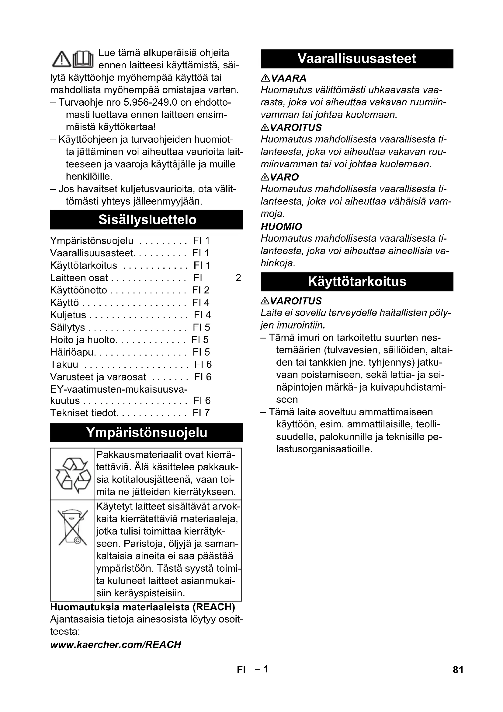 Artikelnr. Kabellängd EU 6.649-875.0 10 m 80 SV– 1 Lue tämä alkuperäisiä ohjeita ennen laitteesi käyttämistä, säi- lytä käyttöohje myöhempää käyttöä tai mahdollista myöhempää omistajaa varten. – Turvaohje nro 5.956-249.0 on ehdotto- masti luettava ennen laitteen ensim- mäistä käyttökertaa! – Käyttöohjeen ja turvaohjeiden huomiot- ta jättäminen voi aiheuttaa vaurioita lait- teeseen ja vaaroja käyttäjälle ja muille henkilöille. – Jos havaitset kuljetusvaurioita, ota välit- tömästi yhteys jälleenmyyjään. Huomautuksia materiaaleista (REACH) Ajantasaisia tietoja ainesosista löytyy osoit- teesta: www.kaercher.com/REACH VAARA Huomautus välittömästi uhkaavasta vaa- rasta, joka voi aiheuttaa vakavan ruumiin- vamman tai johtaa kuolemaan. 몇 VAROITUS Huomautus mahdollisesta vaarallisesta ti- lanteesta, joka voi aiheuttaa vakavan ruu- miinvamman tai voi johtaa kuolemaan. 몇 VARO Huomautus mahdollisesta vaarallisesta ti- lanteesta, joka voi aiheuttaa vähäisiä vam- moja. HUOMIO Huomautus mahdollisesta vaarallisesta ti- lanteesta, joka voi aiheuttaa aineellisia va- hinkoja. 몇 VAROITUS Laite ei sovellu terveydelle haitallisten pöly- jen imurointiin. – Tämä imuri on tarkoitettu suurten nes- temäärien (tulvavesien, säiliöiden, altai- den tai tankkien jne. tyhjennys) jatku- vaan poistamiseen, sekä lattia- ja sei- näpintojen märkä- ja kuivapuhdistami- seen – Tämä laite soveltuu ammattimaiseen käyttöön, esim. ammattilaisille, teolli- suudelle, palokunnille ja teknisille pe- lastusorganisaatioille. Sisällysluettelo Ympäristönsuojelu . . . . . . . . . FI 1 Vaarallisuusasteet. . . . . . . . . . FI 1 Käyttötarkoitus . . . . . . . . . . . . FI 1 Laitteen osat . . . . . . . . . . . . . . FI 2 Käyttöönotto . . . . . . . . . . . . . . FI 2 Käyttö . . . . . . . . . . . . . . . . . . . FI 4 Kuljetus . . . . . . . . . . . . . . . . . . FI 4 Säilytys . . . . . . . . . . . . . . . . . . FI 5 Hoito ja huolto. . . . . . . . . . . . . FI 5 Häiriöapu. . . . . . . . . . . . . . . . . FI 5 Takuu . . . . . . . . . . . . . . . . . . . FI 6 Varusteet ja varaosat . . . . . . . FI 6 EY-vaatimusten-mukaisuusva- kuutus . . . . . . . . . . . . . . . . . . . FI 6 Tekniset tiedot. . . . . . . . . . . . . FI 7 Ympäristönsuojelu Pakkausmateriaalit ovat kierrä- tettäviä. Älä käsittelee pakkauk- sia kotitalousjätteenä, vaan toi- mita ne jätteiden kierrätykseen. Käytetyt laitteet sisältävät arvok- kaita kierrätettäviä materiaaleja, jotka tulisi toimittaa kierrätyk- seen. Paristoja, öljyjä ja saman- kaltaisia aineita ei saa päästää ympäristöön. Tästä syystä toimi- ta kuluneet laitteet asianmukai- siin keräyspisteisiin. Vaarallisuusasteet Käyttötarkoitus 81FI– 2 1 Uimuri 2 Verkkokaapeli 3 Laitteen verkkopistoke 4Imuletku 5 Imupään lukitus 6 Pölysäiliö 7 Tyhjennyspumpun kaapelipidike 8 Sulkulevy 9 Kääntöpyöräkahva 10 Ohjausrulla 11 Lattiasuutin 12 Lattiasuulekkeen korkeudensäätö 13 Imuputki 14 Imukaulus 15 Imupää 16 Tyhjennyspumppu 17 Tyhjennyspumpun hattumutteri 18 Kantokahva 19 Suodattimen kansi 20 Työntökahva 21 Kahva 22 Tyhjennyspumpun uimurikytkin 23 Esisuodatin 24 Tyhjennyspumpun verkkopistoke 25 Kytkin "Tyhjennyspumppu OFF" 26 Pistorasia 27 Kytkin "Tyhjennyspumppu ON" 28 Pääkytkin 29 Poistoilmansuodatin 30 Karkealikasuodatin/poimusuodatin 31 Poistoletku 32 Sulkutulppa (GEKA-C -liitin) 33 Kaapelikoukku 34 Tyyppikilpi Laite mahdollistaa 3 eri käyttötapaa: 1 Märkäimurointi tyhjennyspumppua käyttäen 2 Märkäimurointi ilman tyhjennyspump- pua 3 Kuivaimurointi Huomautus: Märkäimurointi on mahdollis- ta myös, kun tyhjennyspumppu on kytketty pois päältä tai poistettu. Tyhjennyspumpun poistaminen, katso kohtaa Kuivaimu. Kuva Irrota harjakaistaleet. Aseta kumihuulet paikalleen. Huomautus: Kumihuulien rakenteellisen puolen on osoitettava ulospäin. Kuva Vapauta imupää lukituksesta, poista imupää. Vedä paperisuodatinpussi/kuitusuoda- tinpussi taaksepäin ulos. Aseta imupää paikalleen ja lukitse se. – Imuroitaessa märkää likaa, paperi- tai kuitusuodatinpussi on aina ensin pois- tettava. Kuva Vapauta imupää lukituksesta, poista imupää. Poista kalvosuodatin. Aseta imupää paikalleen ja lukitse se. – Imuroitaessa märkää likaa kalvosuoda- tin on aina poistettava. Avaa suodattimen kansi. Poista poimusuodatin. Aseta tilalle karkealikasuodatin Sulje suodattimen kansi, sen on lukitut- tuva kuuluvasti. Kuva Poista sulkutulppa (GEKA-C -liitin) Liitä tyhjennysletku (nimellisläpimitta 3/4“ tai suurempi) Kuva Poista likavesi poistoletkun avulla. Laitteen osat Käyttöönotto Märkäimu Kumihuulten asennus Paperisuodatinpussin/ kuitusuodatinpussin poistaminen Kalvosuodattimen poisto Karkealikasuodattimen asetus paikalleen Tyhjennysletkun liittäminen Likaveden laskeminen pois 82 FI– 3 HUOMIO Imuroinnin aikana ei koskaan saa poistaa karkealikasuodatinta. – Märkäimurointi ilman tyhjennyspump- pua: On suositeltavaa käyttää erikois- suodatinpussia (märkä) (katso suoda- tinjärjestelmät). – Kun maksimi nestetäyttötaso on saavu- tettu, laite kytkeytyy automaattisesti pois päältä. – Märkäimuroinnin päätyttyä: Puhdista ui- muri, säiliö ja mahdollisesti tyhjennys- pumppu kostealla liinalla ja anna kuivua. HUOMIO Ennen kuivaimurointia: Poista tyhjennys- pumppu ja aseta poimusuodatin paikal- leen. Huomautus: Kuivaimuroitaessa tulee aina käyttää poimusuodatinta. HUOMIO Imuroinnin aikana ei saa koskaan poistaa poimusuodatinta. – Imuroitaessa hienojakoista pölyä voi li- säksi käyttää paperisuodatinpussia, kui- tusuodatinpussia tai kalvosuodatinta. Irrota tyhjennyspumpun verkkopistoke pistorasiasta. Vapauta imupää lukituksesta, poista imupää. Kuva Irrota tyhjennyspumpun kaapelipidike ja korvaa se sulkulevyllä. Vedä esisuodatin imuyhteen yli ja pois- ta. Kierrä irti tyhjennyspumpun hattumutte- ri. Poista tyhjennyspumppu ja muovisisä- ke säiliöstä K