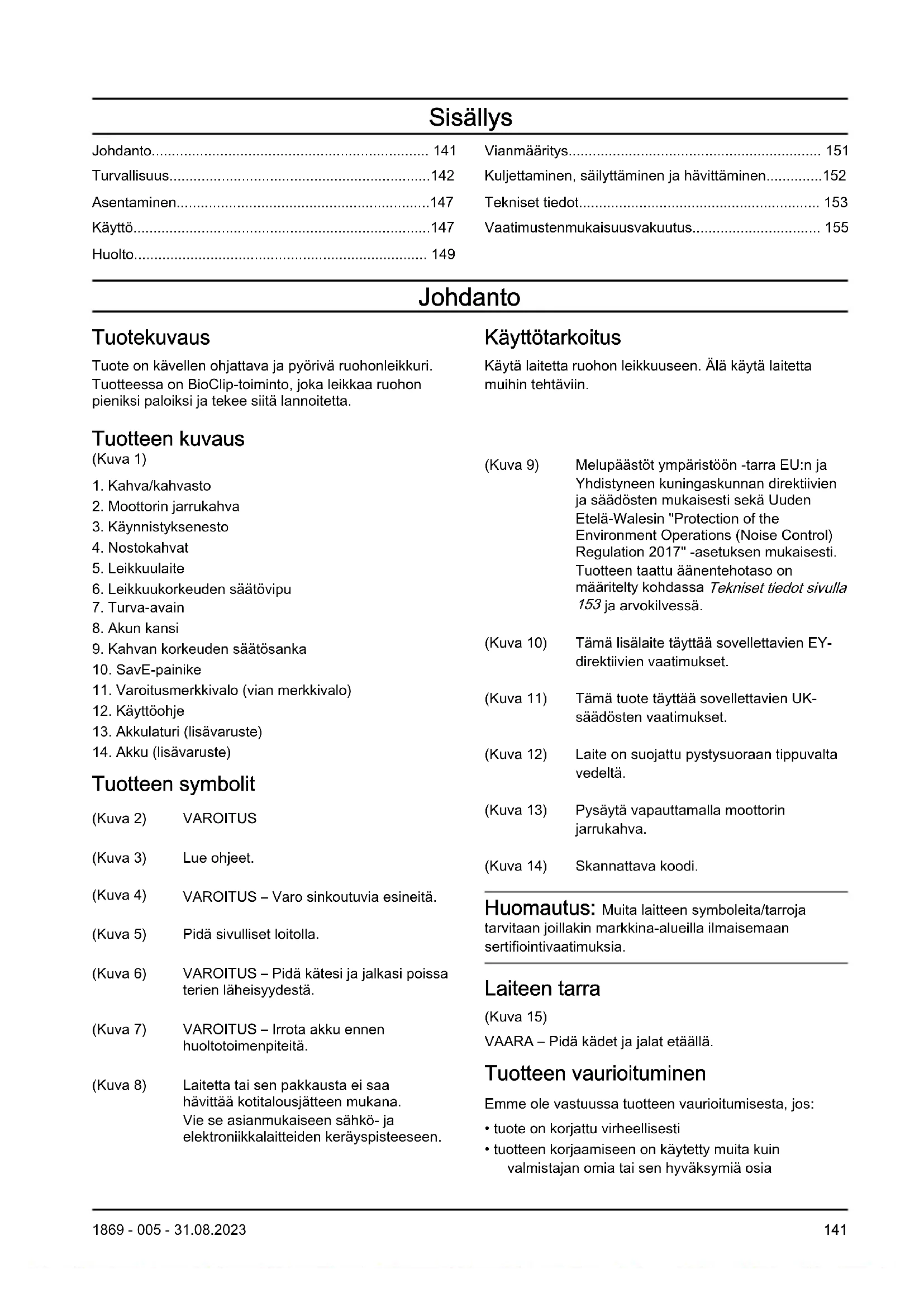 - Vaatimustenmukaisuusvakuutus Johdanto Tuotekuvaus Tuote on kävellen ohjattava ja pyörivä ruohonleikkuri. Tuotteessa on BioClip-toiminto, joka leikkaa ruohon pieniksi paloiksi ja tekee siitä lannoitetta. Käyttötarkoitus Käytä laitetta ruohon leikkuuseen. Älä käytä laitetta muihin tehtäviin. Tuotteen kuvaus (Kuva 1) p. 155