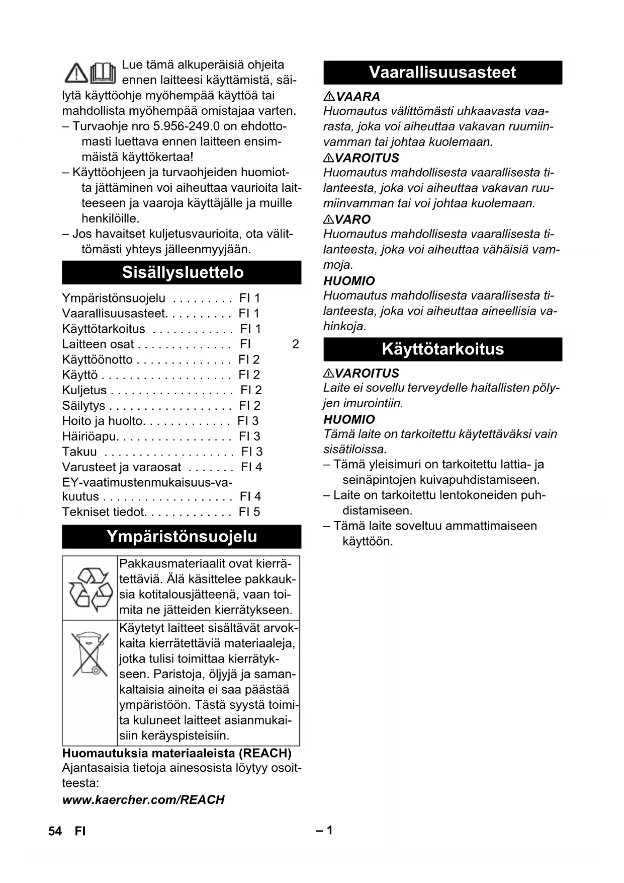 dB(A) 78 Anslutningseffekt W 900 Nätkabel SJT 2x16 AWG (105 °C) Artikelnr. Kabellängd 6.650-589.0 25 m 53SV– 1 Lue tämä alkuperäisiä ohjeita ennen laitteesi käyttämistä, säi- lytä käyttöohje myöhempää käyttöä tai mahdollista myöhempää omistajaa varten. – Turvaohje nro 5.956-249.0 on ehdotto- masti luettava ennen laitteen ensim- mäistä käyttökertaa! – Käyttöohjeen ja turvaohjeiden huomiot- ta jättäminen voi aiheuttaa vaurioita lait- teeseen ja vaaroja käyttäjälle ja muille henkilöille. – Jos havaitset kuljetusvaurioita, ota välit- tömästi yhteys jälleenmyyjään. Huomautuksia materiaaleista (REACH) Ajantasaisia tietoja ainesosista löytyy osoit- teesta: www.kaercher.com/REACH VAARA Huomautus välittömästi uhkaavasta vaa- rasta, joka voi aiheuttaa vakavan ruumiin- vamman tai johtaa kuolemaan. 몇 VAROITUS Huomautus mahdollisesta vaarallisesta ti- lanteesta, joka voi aiheuttaa vakavan ruu- miinvamman tai voi johtaa kuolemaan. 몇 VARO Huomautus mahdollisesta vaarallisesta ti- lanteesta, joka voi aiheuttaa vähäisiä vam- moja. HUOMIO Huomautus mahdollisesta vaarallisesta ti- lanteesta, joka voi aiheuttaa aineellisia va- hinkoja. 몇 VAROITUS Laite ei sovellu terveydelle haitallisten pöly- jen imurointiin. HUOMIO Tämä laite on tarkoitettu käytettäväksi vain sisätiloissa. – Tämä yleisimuri on tarkoitettu lattia- ja seinäpintojen kuivapuhdistamiseen. – Laite on tarkoitettu lentokoneiden puh- distamiseen. – Tämä laite soveltuu ammattimaiseen käyttöön. Sisällysluettelo Ympäristönsuojelu . . . . . . . . . FI 1 Vaarallisuusasteet. . . . . . . . . . FI 1 Käyttötarkoitus . . . . . . . . . . . . FI 1 Laitteen osat . . . . . . . . . . . . . . FI 2 Käyttöönotto . . . . . . . . . . . . . . FI 2 Käyttö . . . . . . . . . . . . . . . . . . . FI 2 Kuljetus . . . . . . . . . . . . . . . . . . FI 2 Säilytys . . . . . . . . . . . . . . . . . . FI 2 Hoito ja huolto. . . . . . . . . . . . . FI 3 Häiriöapu. . . . . . . . . . . . . . . . . FI 3 Takuu . . . . . . . . . . . . . . . . . . . FI 3 Varusteet ja varaosat . . . . . . . FI 4 EY-vaatimustenmukaisuus-va- kuutus . . . . . . . . . . . . . . . . . . . FI 4 Tekniset tiedot. . . . . . . . . . . . . FI 5 Ympäristönsuojelu Pakkausmateriaalit ovat kierrä- tettäviä. Älä käsittelee pakkauk- sia kotitalousjätteenä, vaan toi- mita ne jätteiden kierrätykseen. Käytetyt laitteet sisältävät arvok- kaita kierrätettäviä materiaaleja, jotka tulisi toimittaa kierrätyk- seen. Paristoja, öljyjä ja saman- kaltaisia aineita ei saa päästää ympäristöön. Tästä syystä toimi- ta kuluneet laitteet asianmukai- siin keräyspisteisiin. Vaarallisuusasteet Käyttötarkoitus 54 FI– 2 1 Kuitumattosuodatinpussi 2 Imukaulus 3Imuletku 4 Tyyppikilpi 5 Kaapelikoukku 6 Kantokahva 7 Verkkokaapeli 8Imupää 9 Imupään lukitus 10 Ohjausrulla 11 Pölysäiliö 12 Pääkytkin 13 Vaihtokytkin kova pinta/kokolattiamatto 14 Lattiasuutin 15 Imuputki 16 Verkkopistokekiinnitys 17 Lattiasuuttimen pidike 18 Peitteen lukitus 19 Peite 20 Imuvoimasäädin (portaaton) 21 Kahva 22 Suodatinkotelo 23 Poistoilmansuodatin 24 Pääsuodatinkori 25 Moottorin suojasuodatin 26 Moottorinsuojasuodattimen suojaristik-
