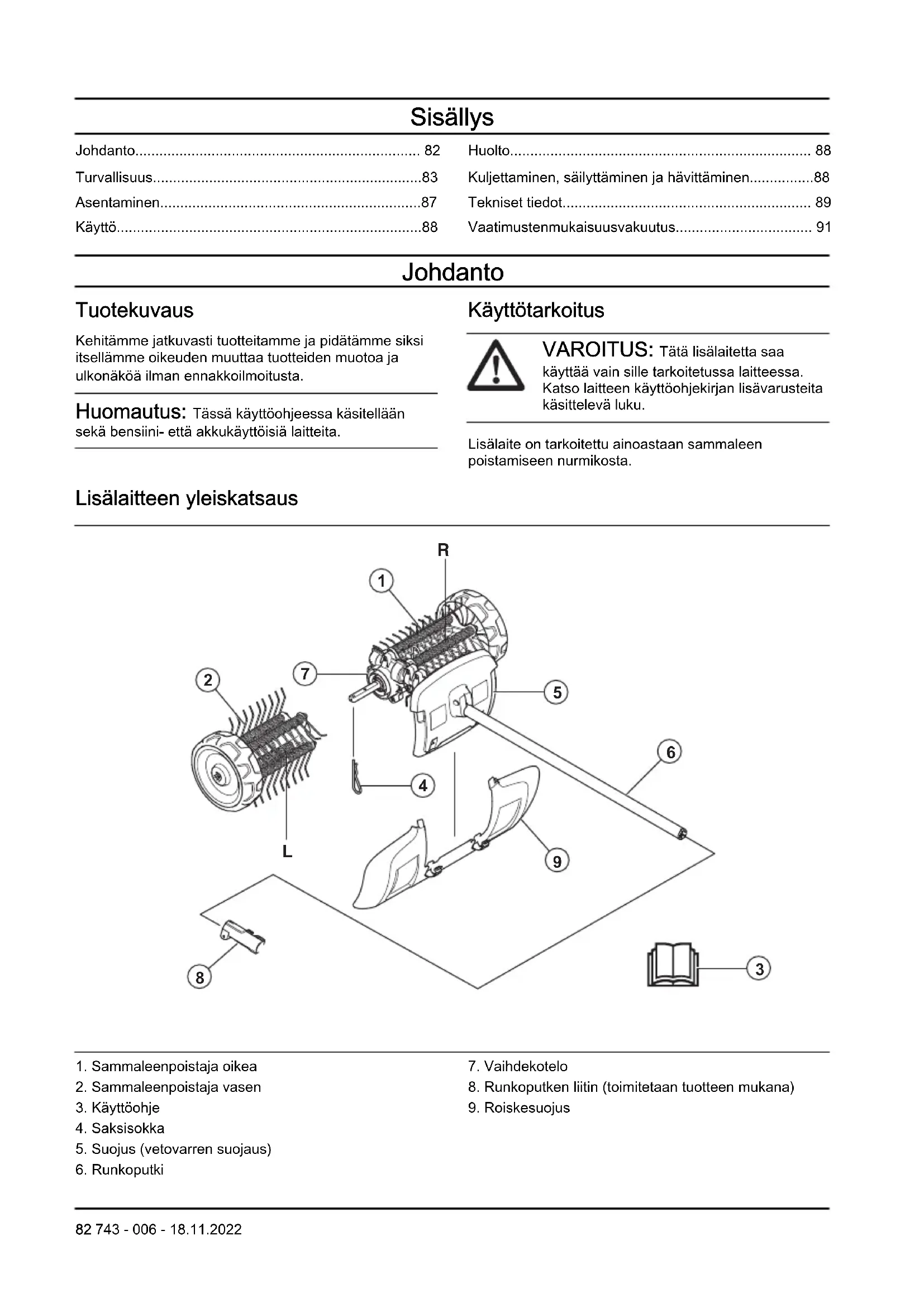 - Vaatimustenmukaisuusvakuutus Johdanto Tuotekuvaus Kehitämme jatkuvasti tuotteitamme ja pidätämme siksi itsellämme oikeuden muuttaa tuotteiden muotoa ja ulkonäköä ilman ennakkoilmoitusta. Huomautus: Tässä käyttöohjeessa käsitellään sekä bensiini- että akkukäyttöisiä laitteita. Käyttötarkoitus VAROITUS: Tätä lisälaitetta saa käyttää vain sille tarkoitetussa laitteessa. Katso laitteen käyttöohjekirjan lisävarusteita käsittelevä luku. Lisälaite on tarkoitettu ainoastaan sammaleen poistamiseen nurmikosta. Lisälaitteen yleiskatsaus p. 91