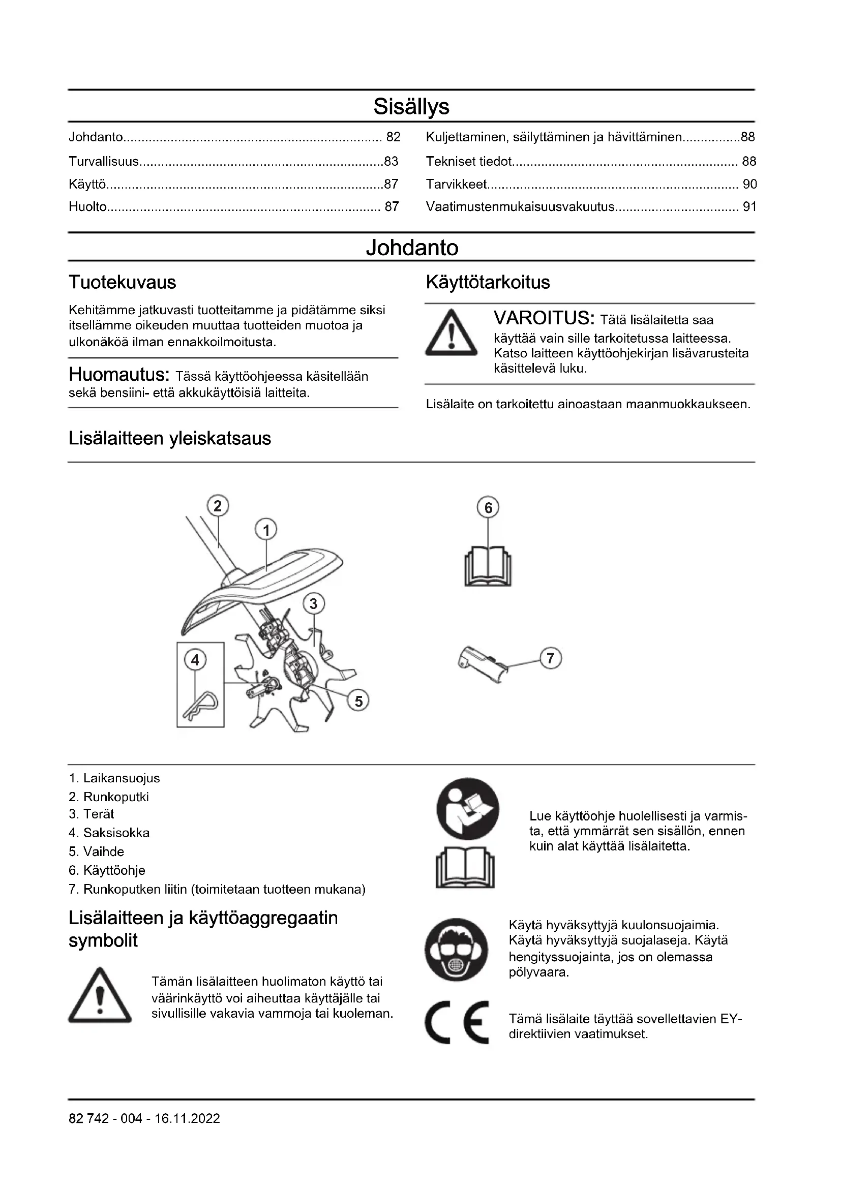 - Vaatimustenmukaisuusvakuutus Johdanto Tuotekuvaus Kehitämme jatkuvasti tuotteitamme ja pidätämme siksi itsellämme oikeuden muuttaa tuotteiden muotoa ja ulkonäköä ilman ennakkoilmoitusta. Huomautus: Tässä käyttöohjeessa käsitellään sekä bensiini- että akkukäyttöisiä laitteita. Käyttötarkoitus VAROITUS: Tätä lisälaitetta saa käyttää vain sille tarkoitetussa laitteessa. Katso laitteen käyttöohjekirjan lisävarusteita käsittelevä luku. Lisälaite on tarkoitettu ainoastaan maanmuokkaukseen. Lisälaitteen yleiskatsaus p. 91
