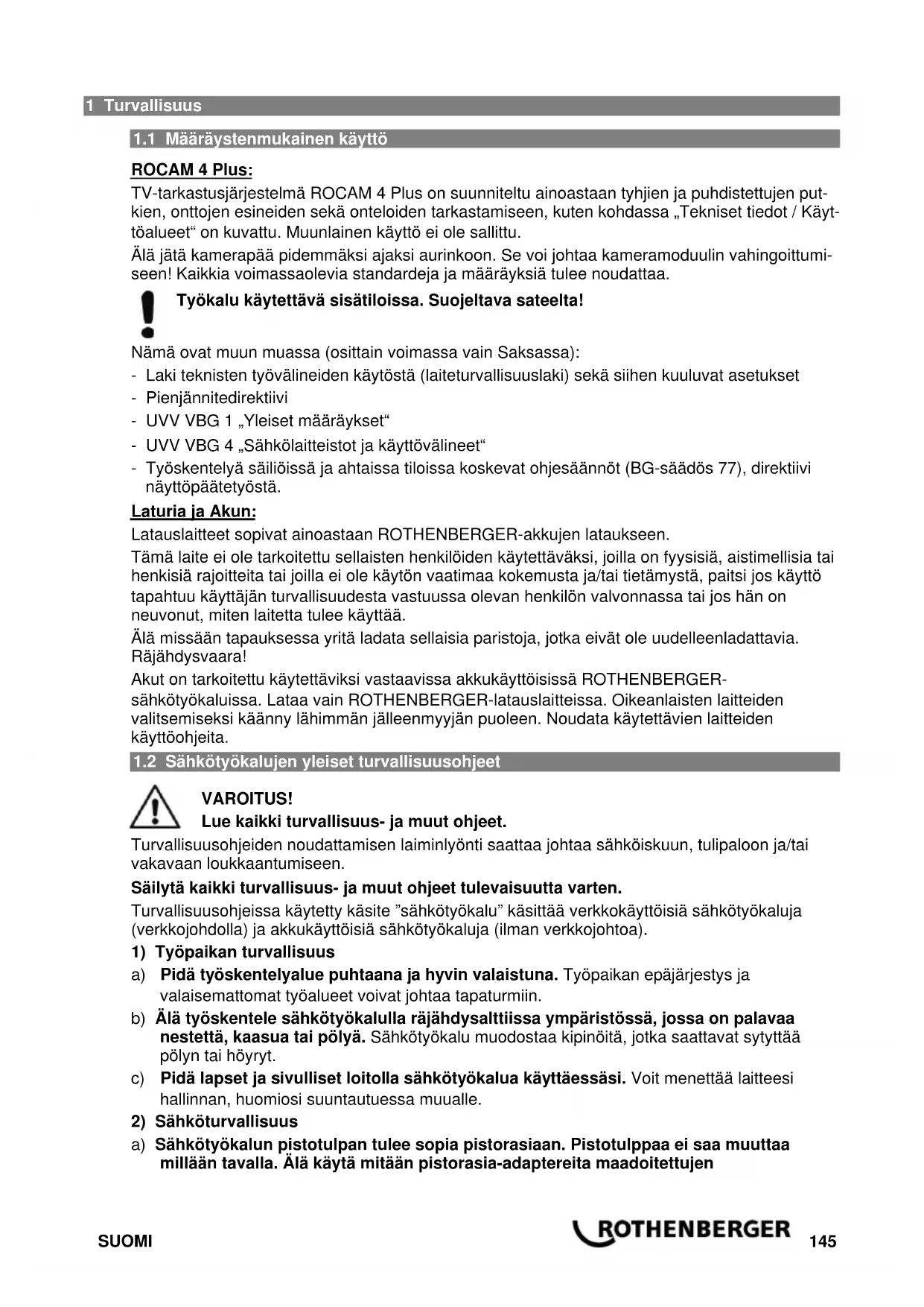 ROCAM 4 Plus: TV-tarkastusjärjestelmä ROCAM 4 Plus on suunniteltu ainoastaan tyhjien ja puhdistettujen put- kien, onttojen esineiden sekä onteloiden tarkastamiseen, kuten kohdassa „Tekniset tiedot / Käyt- töalueet“ on kuvattu. Muunlainen käyttö ei ole sallittu. Älä jätä kamerapää pidemmäksi ajaksi aurinkoon. Se voi johtaa kameramoduulin vahingoittumi- seen! Kaikkia voimassaolevia standardeja ja määräyksiä tulee noudattaa. Työkalu käytettävä sisätiloissa. Suojeltava sateelta! Nämä ovat muun muassa (osittain voimassa vain Saksassa): - Laki teknisten työvälineiden käytöstä (laiteturvallisuuslaki) sekä siihen kuuluvat asetukset - Pienjännitedirektiivi - UVV VBG 1 „Yleiset määräykset“ - UVV VBG 4 „Sähkölaitteistot ja käyttövälineet“ - Työskentelyä säiliöissä ja ahtaissa tiloissa koskevat ohjesäännöt (BG-säädös 77), direktiivi näyttöpäätetyöstä. Laturia ja Akun: Latauslaitteet sopivat ainoastaan ROTHENBERGER-akkujen lataukseen. Tämä laite ei ole tarkoitettu sellaisten henkilöiden käytettäväksi, joilla on fyysisiä, aistimellisia tai henkisiä rajoitteita tai joilla ei ole käytön vaatimaa kokemusta ja/tai tietämystä, paitsi jos käyttö tapahtuu käyttäjän turvallisuudesta vastuussa olevan henkilön valvonnassa tai jos hän on neuvonut, miten laitetta tulee käyttää. Älä missään tapauksessa yritä ladata sellaisia paristoja, jotka eivät ole uudelleenladattavia. Räjähdysvaara! Akut on tarkoitettu käytettäviksi vastaavissa akkukäyttöisissä ROTHENBERGER- sähkötyökaluissa. Lataa vain ROTHENBERGER-latauslaitteissa. Oikeanlaisten laitteiden valitsemiseksi käänny lähimmän jälleenmyyjän puoleen. Noudata käytettävien laitteiden käyttöohjeita.