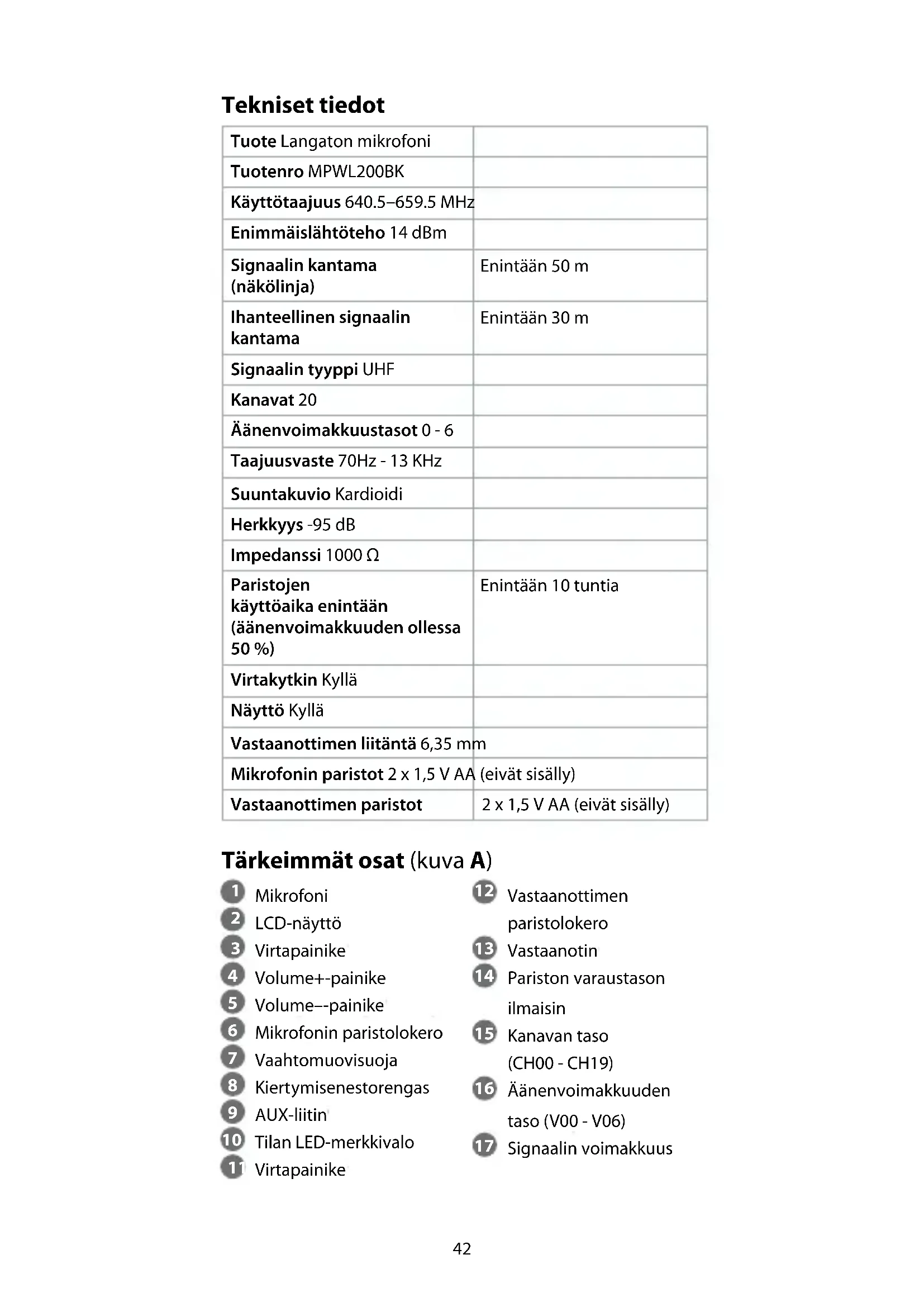 Pika-aloitusopas Langaton mikrofoni MPWL200BK Katso tarkemmat tiedot käyttöoppaan laajemmasta verkkoversiosta: ned.is/mpwl200bk Käyttötarkoitus Nedis MPWL200BK on langaton mikrofoni, jossa on vastaanotin ja näyttö. Tätä tuotetta ei ole tarkoitettu sellaisten henkilöiden (lapset mukaan lukien) käyttöön, joiden fyysinen, aistinvarainen tai henkinen toimintakyky on heikentynyt tai joilla ei ole kokemusta tai tietoa laitteen käytöstä, ellei käyttöä valvo tai ohjaa heidän turvallisuudestaan vastaava henkilö. Tuote on tarkoitettu vain sisäkäyttöön. Tuotetta ei ole tarkoitettu ammattikäyttöön. Tuotteen muutokset voivat vaikuttaa turvallisuuteen, takuuseen ja asianmukaiseen toimintaan.42 Tekniset tiedot Tuote Langaton mikrofoni Tuotenro MPWL200BK Käyttötaajuus 640.5–659.5 MHz Enimmäislähtöteho 14 dBm Signaalin kantama (näkölinja) Enintään 50 m Ihanteellinen signaalin kantama Enintään 30 m Signaalin tyyppi UHF Kanavat 20 Äänenvoimakkuustasot 0 - 6 Taajuusvaste 70Hz - 13 KHz Suuntakuvio Kardioidi Herkkyys -95 dB Impedanssi 1000 Ω Paristojen käyttöaika enintään (äänenvoimakkuuden ollessa 50 %) Enintään 10 tuntia Virtakytkin Kyllä Näyttö Kyllä Vastaanottimen liitäntä 6,35 mm Mikrofonin paristot 2 x 1,5 V AA (eivät sisälly) Vastaanottimen paristot 2 x 1,5 V AA (eivät sisälly) Tärkeimmät osat (kuva A)
