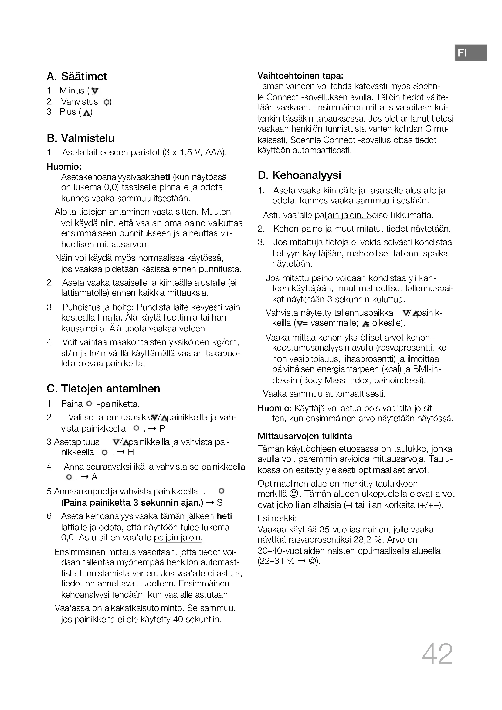 kaisesti, Soehnle Connect -sovellus ottaa tiedot käyttöön automaattisesti. D. Kehoanalyysi