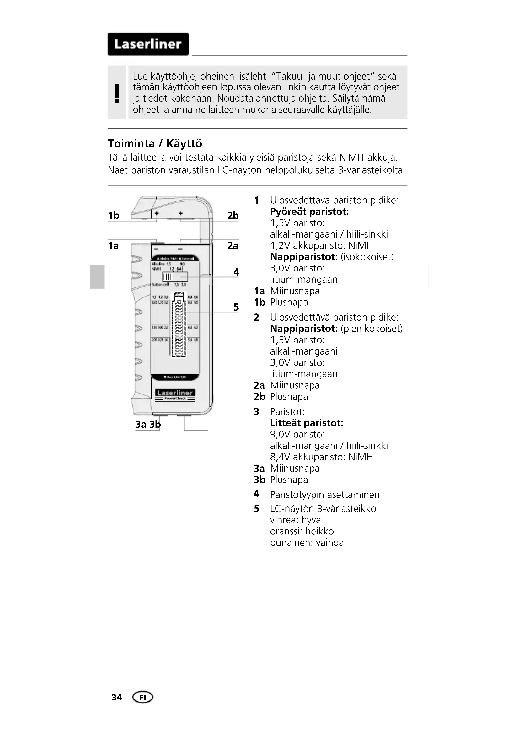 Paristojen varaustilan tarkistaminen Avaa paristokotelo. Asenna paristot koteloon kuvakkeiden mukaisesti tai asenna 9,0V nappiparisto (E-block) kontakteihin 3a ja 3b. Huomaa paristojen oikea napaisuus. 3-väriasteikon näyttö hyvä (vihreä): Paristo on vielä täysin käyttökelpoinen heikko (oranssi): Pariston varaustila on matala. Vaihda paristo lähiaikoina vaihda (punainen): Paristo on tyhjä ja se on vaihdettava Noudata kohdan 2 (Paristotyypin asettaminen) ohjeita.