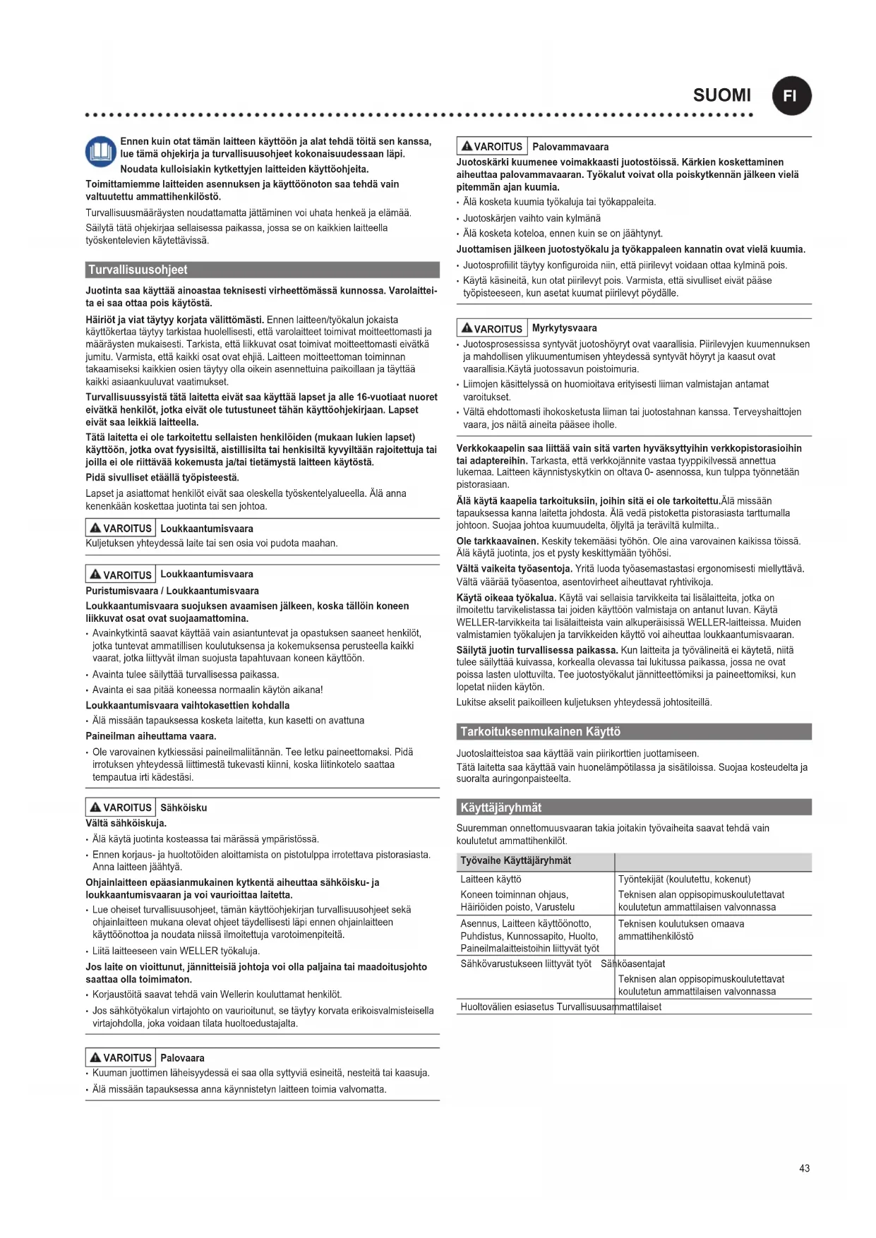 - Vältäehdottomastiihokosketustaliimantaijuotostahnankanssa.Terveyshaittojen vaara, jos näitä aineita pääsee iholle. Verkkokaapelin saa liittää vain sitä varten hyväksyttyihin verkkopistorasioihin tai adaptereihin. Tarkasta, että verkkojännite vastaa tyyppikilvessä annettua lukemaa. Laitteen käynnistyskytkin on oltava 0- asennossa, kun tulppa työnnetään pistorasiaan. Älä käytä kaapelia tarkoituksiin, joihin sitä ei ole tarkoitettu.Älä missään tapauksessa kanna laitetta johdosta. Älä vedä pistoketta pistorasiasta tarttumalla johtoon.Suojaajohtoakuumuudelta,öljyltäjateräviltäkulmilta.. Ole tarkkaavainen. Keskitytekemääsityöhön.Oleainavarovainenkaikissatöissä. läkäytäjuotinta,josetpystykeskittymääntyöhösi. Vältä vaikeita työasentoja. Yritäluodatyöasemastastasiergonomisestimiellyttävä. Vältävääräätyöasentoa,asentovirheetaiheuttavatryhtivikoja. Käytä oikeaa työkalua. Käytävaisellaisiatarvikkeitatailisälaitteita,jotkaon ilmoitettutarvikelistassataijoidenkäyttöönvalmistajaonantanutluvan.Käytä WELLER-tarvikkeita tai lisälaitteista vain alkuperäisissä WELLER-laitteissa. Muiden valmistamientyökalujenjatarvikkeidenkäyttövoiaiheuttaaloukkaantumisvaaran. Säilytä juotin turvallisessa paikassa.Kunlaitteitajatyövälineitäeikäytetä,niitä tuleesäilyttääkuivassa,korkeallaolevassatailukitussapaikassa,jossaneovat poissalastenulottuvilta.Teejuotostyökalutjännitteettömiksijapaineettomiksi,kun lopetatniidenkäytön. Lukitseakselitpaikoilleenkuljetuksenyhteydessäjohtositeillä. Tarkoituksenmukainen Käyttö Juotoslaitteistoasaakäyttäävainpiirikorttienjuottamiseen. Tätälaitettasaakäyttäävainhuonelämpötilassajasisätiloissa.Suojaakosteudeltaja suoralta auringonpaisteelta. Käyttäjäryhmät Suuremmanonnettomuusvaarantakiajoitakintyövaiheitasaavattehdävain koulutetut ammattihenkilöt. Työvaihe Käyttäjäryhmät Laitteenkäyttö Koneen toiminnan ohjaus, Häiriöiden poisto, Varustelu Työntekijät(koulutettu,kokenut) Teknisen alan oppisopimuskoulutettavat koulutetun ammattilaisen valvonnassa Asennus,Laitteenkäyttöönotto, Puhdistus, Kunnossapito, Huolto, Paineilmalaitteistoihinliittyvättyöt Teknisen koulutuksen omaava ammattihenkilöstö Sähkövarustukseenliittyvättyöt Sähköasentajat Teknisen alan oppisopimuskoulutettavat koulutetun ammattilaisen valvonnassa Huoltovälien esiasetus Turvallisuusammattilaiset