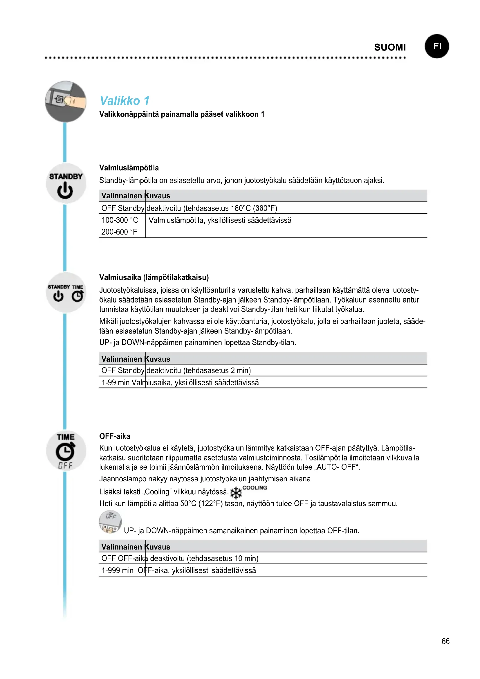 DANSK66 Valikko 1 Valikkonäppäintä painamalla pääset valikkoon 1 Valmiuslämpötila Standby-lämpötila on esiasetettu arvo, johon juotostyökalu säädetään käyttötauon ajaksi. Valinnainen Kuvaus OFF Standby deaktivoitu (tehdasasetus 180°C (360°F) 100-300 °C 200-600 °F Valmiuslämpötila, yksilöllisesti säädettävissä Valmiusaika (lämpötilakatkaisu) Juotostyökaluissa, joissa on käyttöanturilla varustettu kahva, parhaillaan käyttämättä oleva juotosty- ökalu säädetään esiasetetun Standby-ajan jälkeen Standby-lämpötilaan. Työkaluun asennettu anturi tunnistaa käyttötilan muutoksen ja deaktivoi Standby-tilan heti kun liikutat työkalua. Mikäli juotostyökalujen kahvassa ei ole käyttöanturia, juotostyökalu, jolla ei parhaillaan juoteta, sääde- tään esiasetetun Standby-ajan jälkeen Standby-lämpötilaan. UP- ja DOWN-näppäimen painaminen lopettaa Standby-tilan. Valinnainen Kuvaus OFF Standby deaktivoitu (tehdasasetus 2 min) 1-99 min Valmiusaika, yksilöllisesti säädettävissä OFF-aika Kun juotostyökalua ei käytetä, juotostyökalun lämmitys katkaistaan OFF-ajan päätyttyä. Lämpötila- katkaisu suoritetaan riippumatta asetetusta valmiustoiminnosta. Tosilämpötila ilmoitetaan vilkkuvalla lukemalla ja se toimii jäännöslämmön ilmoituksena. Näyttöön tulee „AUTO- OFF“. Jäännöslämpö näkyy näytössä juotostyökalun jäähtymisen aikana. Lisäksi teksti „Cooling“ vilkkuu näytössä. Heti kun lämpötila alittaa 50°C (122°F) tason, näyttöön tulee OFF ja taustavalaistus sammuu. UP- ja DOWN-näppäimen samanaikainen painaminen lopettaa OFF-tilan. Valinnainen Kuvaus OFF OFF-aika deaktivoitu (tehdasasetus 10 min) 1-999 min OFF-aika, yksilöllisesti säädettävissä