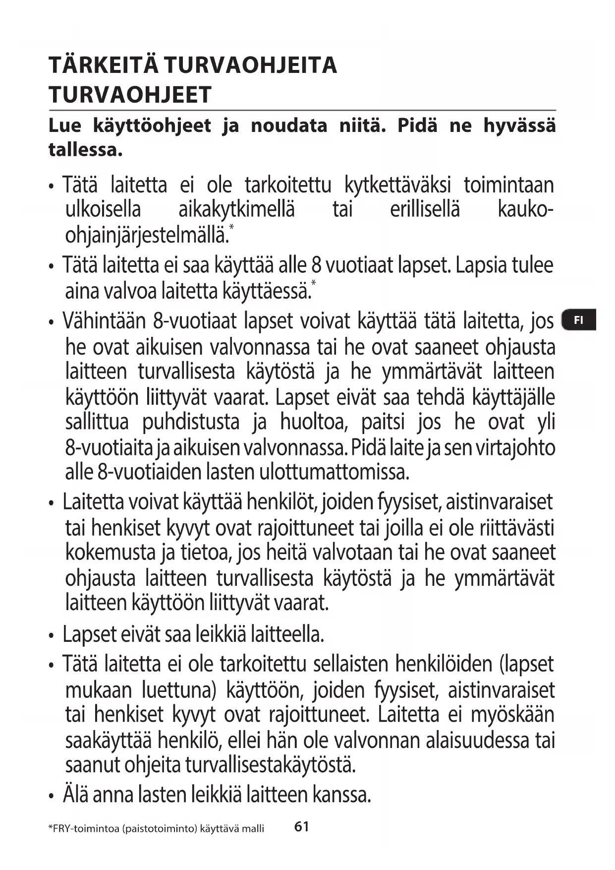 - Älä anna lasten leikkiä laitteen kanssa. *FRY-toimintoa (paistotoiminto) käyttävä malli62