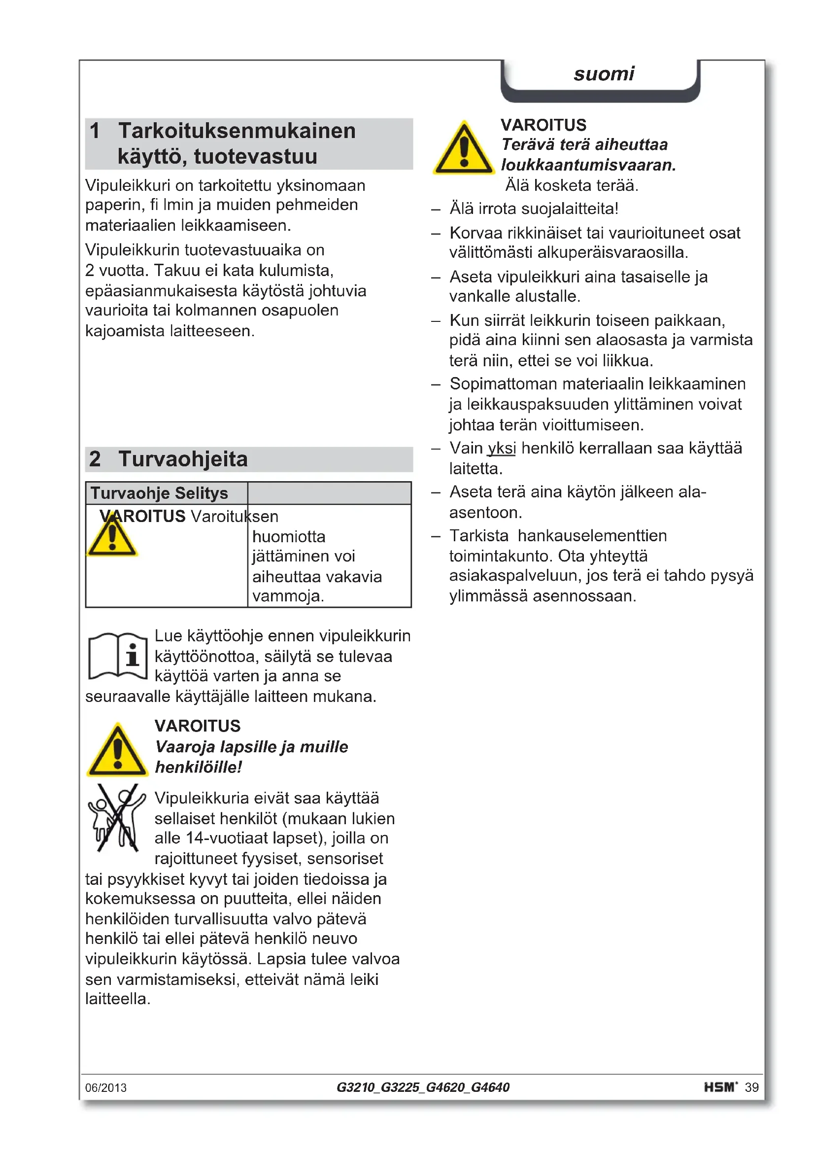 Max. skärtjocklek (mm) 1,0 2,5 2,0 4,0 Max. Format A4 A4 A3 A3 Skärlängd (mm) 325 325 460 460 Nedtryckning Manuell Automatisk Automatisk Automatisk Arbetsbord (mm) 325 x 155 325 x 230 460 x 230 460 x 320 Mått (mm) 605 x 280 x 75 606 x 308 x 122 737 x 362 x 122 750 x 406 x 133 Vikt (kg) 2,12 3,72 4,66 7,30 Anvisning: För att minska platsbehovet vid förvaring och för att kunna fi xera kniven vid transport av pappersskäraren kan skyddsplattan fällas ned. Detta kan endast göras när kniven befi nner sig i det nedre läget.38 G3210_G3225_G4620_G4640 06/2013 svenska06/2013 G3210_G3225_G4620_G4640 39 suomi 1 Tarkoituksenmukainen käyttö, tuotevastuu Vipuleikkuri on tarkoitettu yksinomaan paperin, fi lmin ja muiden pehmeiden materiaalien leikkaamiseen. Vipuleikkurin tuotevastuuaika on 2 vuotta. Takuu ei kata kulumista, epäasianmukaisesta käytöstä johtuvia vaurioita tai kolmannen osapuolen kajoamista laitteeseen. 2 Turvaohjeita Turvaohje Selitys VAROITUS Varoituksen huomiotta jättäminen voi aiheuttaa vakavia vammoja. Lue käyttöohje ennen vipuleikkurin käyttöönottoa, säilytä se tulevaa käyttöä varten ja anna se seuraavalle käyttäjälle laitteen mukana. VAROITUS Vaaroja lapsille ja muille henkilöille! Vipuleikkuria eivät saa käyttää sellaiset henkilöt (mukaan lukien alle 14-vuotiaat lapset), joilla on rajoittuneet fyysiset, sensoriset tai psyykkiset kyvyt tai joiden tiedoissa ja kokemuksessa on puutteita, ellei näiden henkilöiden turvallisuutta valvo pätevä henkilö tai ellei pätevä henkilö neuvo vipuleikkurin käytössä. Lapsia tulee valvoa sen varmistamiseksi, etteivät nämä leiki laitteella. VAROITUS Terävä terä aiheuttaa loukkaantumisvaaran. Älä kosketa terää. – Älä irrota suojalaitteita! – Korvaa rikkinäiset tai vaurioituneet osat välittömästi alkuperäisvaraosilla. – Aseta vipuleikkuri aina tasaiselle ja vankalle alustalle. – Kun siirrät leikkurin toiseen paikkaan, pidä aina kiinni sen alaosasta ja varmista terä niin, ettei se voi liikkua. – Sopimattoman materiaalin leikkaaminen ja leikkauspaksuuden ylittäminen voivat johtaa terän vioittumiseen. – Vain yksi henkilö kerrallaan saa käyttää laitetta. – Aseta terä aina käytön jälkeen ala- asentoon. – Tarkista hankauselementtien toimintakunto. Ota yhteyttä asiakaspalveluun, jos terä ei tahdo pysyä ylimmässä asennossaan.40 G3210_G3225_G4620_G4640 06/2013 suomi