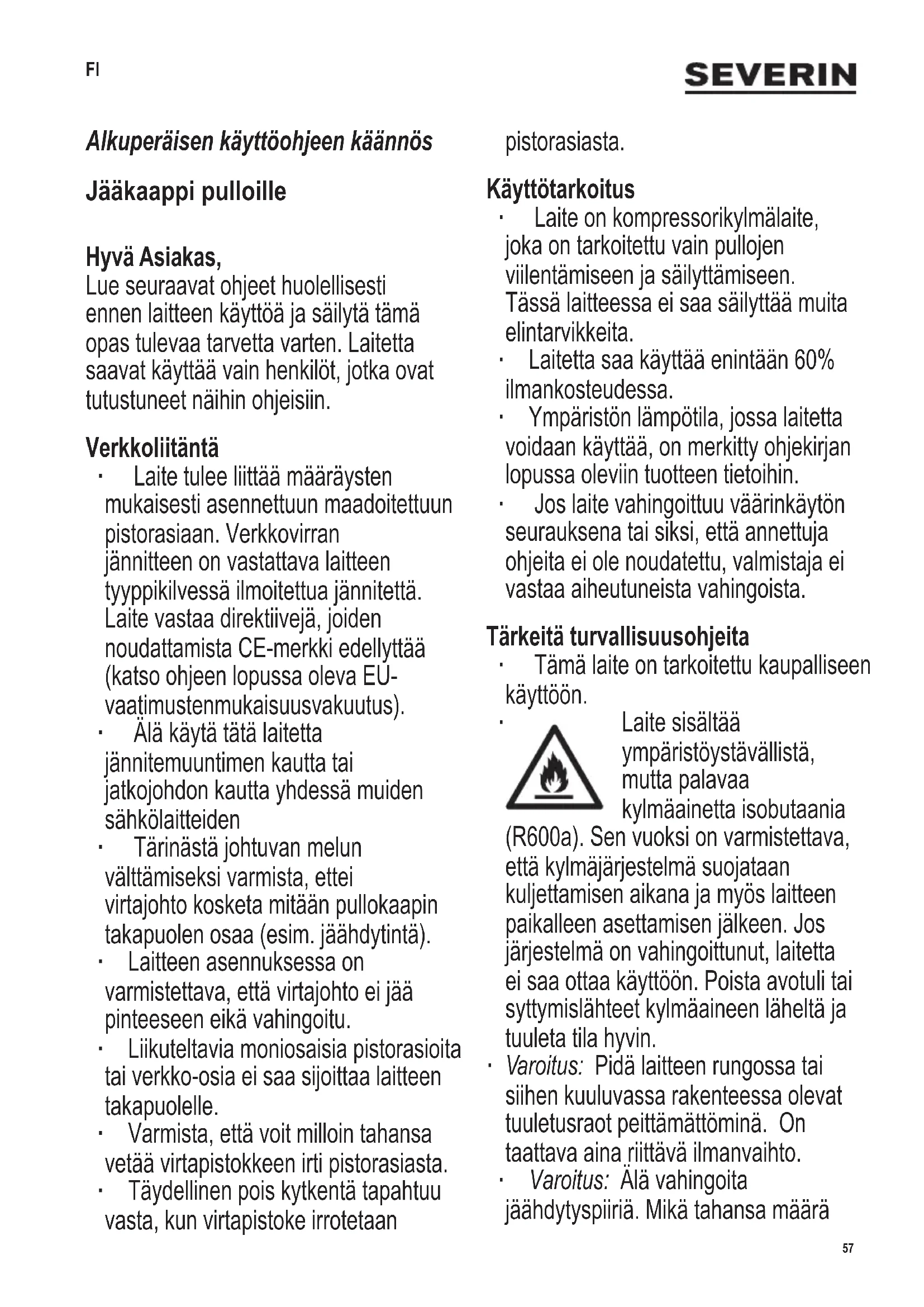 EEI 34,9 Energy efciency class C Parametrar för ljuskälla Typ av ljuskälla LED Energieffektivitetsklass - Minsta garantivaraktighet som tillverkaren erbjuder: 24 månader Annan information: Webblänk till tillverkarens webbplats där informationen enligt punkt 3 i bilaga II till kommissionens förordning (EU) 2019/2024 nns: www.severin.de57 142 x 208 mm Alkuperäisen käyttöohjeen käännös Jääkaappi pulloille Hyvä Asiakas, Lue seuraavat ohjeet huolellisesti ennen laitteen käyttöä ja säilytä tämä opas tulevaa tarvetta varten. Laitetta saavat käyttää vain henkilöt, jotka ovat tutustuneet näihin ohjeisiin. Verkkoliitäntä ∙ Laite tulee liittää määräysten mukaisesti asennettuun maadoitettuun pistorasiaan. Verkkovirran jännitteen on vastattava laitteen tyyppikilvessä ilmoitettua jännitettä. Laite vastaa direktiivejä, joiden noudattamista CE-merkki edellyttää (katso ohjeen lopussa oleva EU- vaatimustenmukaisuusvakuutus). ∙ Älä käytä tätä laitetta jännitemuuntimen kautta tai jatkojohdon kautta yhdessä muiden sähkölaitteiden ∙ Tärinästä johtuvan melun välttämiseksi varmista, ettei virtajohto kosketa mitään pullokaapin takapuolen osaa (esim. jäähdytintä). ∙ Laitteen asennuksessa on varmistettava, että virtajohto ei jää pinteeseen eikä vahingoitu. ∙ Liikuteltavia moniosaisia pistorasioita tai verkko-osia ei saa sijoittaa laitteen takapuolelle. ∙ Varmista, että voit milloin tahansa vetää virtapistokkeen irti pistorasiasta. ∙ Täydellinen pois kytkentä tapahtuu vasta, kun virtapistoke irrotetaan pistorasiasta. Käyttötarkoitus ∙ Laite on kompressorikylmälaite, joka on tarkoitettu vain pullojen viilentämiseen ja säilyttämiseen. Tässä laitteessa ei saa säilyttää muita elintarvikkeita. ∙ Laitetta saa käyttää enintään 60% ilmankosteudessa. ∙ Ympäristön lämpötila, jossa laitetta voidaan käyttää, on merkitty ohjekirjan lopussa oleviin tuotteen tietoihin. ∙ Jos laite vahingoittuu väärinkäytön seurauksena tai siksi, että annettuja ohjeita ei ole noudatettu, valmistaja ei vastaa aiheutuneista vahingoista. Tärkeitä turvallisuusohjeita ∙ Tämä laite on tarkoitettu kaupalliseen käyttöön.