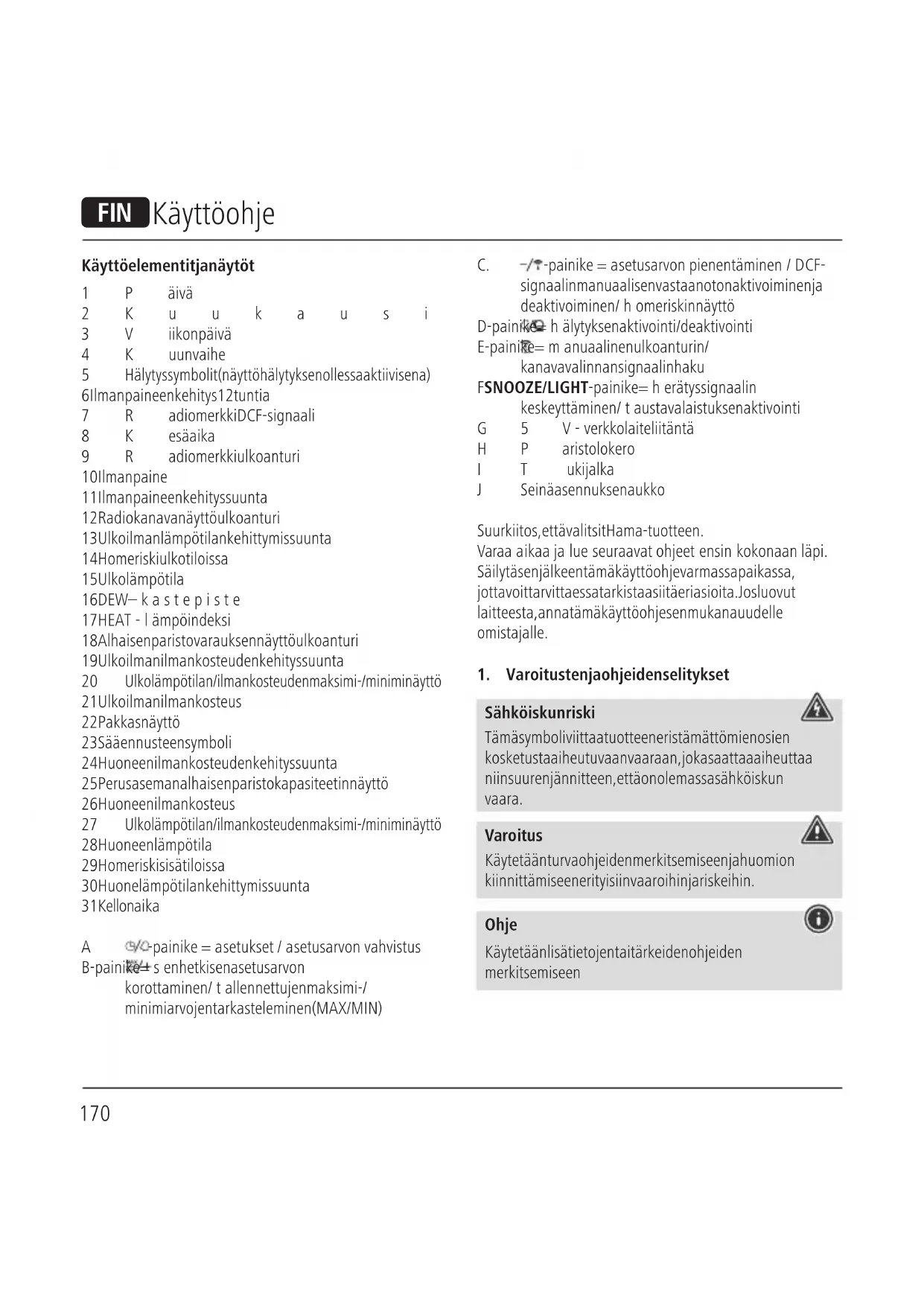 -painike =asetukset /asetusarvon vahvistus B -painike =sen hetkisen asetusarvon korottaminen /tallennettujen maksimi-/ minimiarvojen tarkasteleminen (MAX/MIN) C. -painike =asetusarvon pienentäminen /DCF- signaalin manuaalisen vastaanoton aktivoiminen ja deaktivoiminen /homeriskin näyttö D -painike =hälytyksen aktivointi/deaktivointi E -painike =manuaalinen ulkoanturin/ kanavavalinnan signaalin haku F SNOOZE/LIGHT-painike =herätyssignaalin keskeyttäminen /taustavalaistuksen aktivointi G5V-verkkolaiteliitäntä HParistolokero ITukijalka JSeinäasennuksen aukko Suurkiitos, että valitsit Hama-tuotteen. Varaaaikaa ja lue seuraavat ohjeet ensin kokonaan läpi. Säilytä sen jälkeen tämä käyttöohje varmassa paikassa, jotta voit tarvittaessa tarkistaa siitä eri asioita. Jos luovut laitteesta, anna tämä käyttöohje sen mukana uudelle omistajalle.