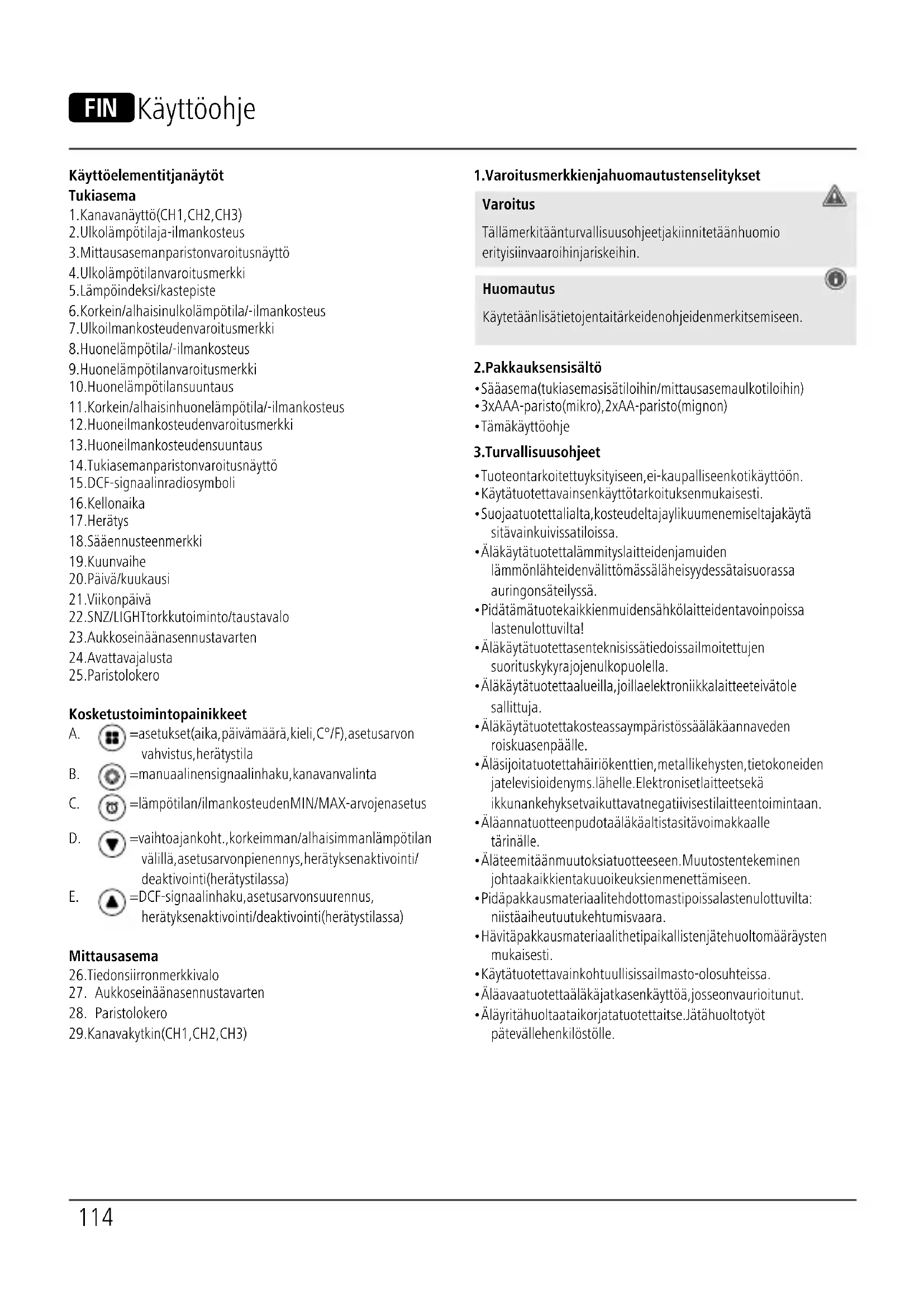 Sääasema Virtalähde Tukiasema 4,5 V 3 x AAA-paristo (mikro) Virtalähde Mittausasema 3,0 V 2 x AA-paristo Mittausalue Lämpötila Sisätilat: –10 °C – +50 °C / +14 °F – +122 °F Ulkotilat: –40 °C – +70 °C / –40 °F – +158 °F Mittausalue Ilmankosteus 20 % – 95 %120 Mittausasemien enimmäismäärä