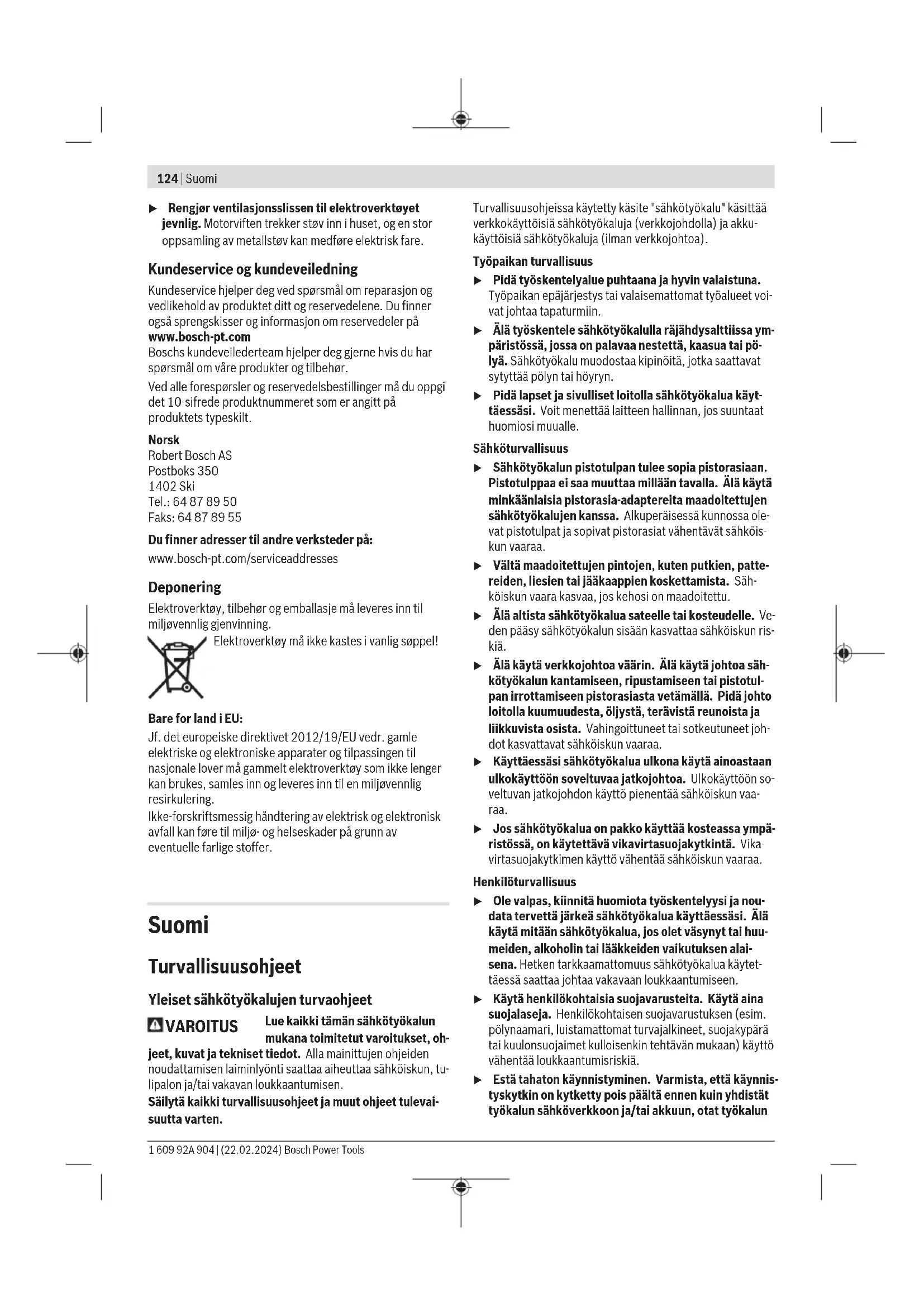 125 2,4 10 22,2 >0 11 000 80 Dreie girhodet (se bildeE) u Før alle arbeider på elektroverktøyet utføres må støpselet trekkes ut av stikkontakten. Du kan dreie girhodet i trinn på 90°. Dermed kan av/på- bryteren settes i en gunstigere posisjon for brukeren i spesielle situasjoner, foreksempel for venstrehendte. Skru de fire skruene helt ut(➊). Sving girhodet forsiktig til den nye posisjonen(➋), uten å ta det fra huset. Stram de fire skruene igjen(➌). Støv-/sponavsuging Støv fra materialer som blyholdig maling, noen tresorter, mineraler og metall kan være helsefarlige. Berøring eller innånding av støv kan utløse allergiske reaksjoner og/eller åndedrettssykdommer hos brukeren eller personer som befinner seg i nærheten. Visse typer støv som eike- eller bøkestøv gjelder som kreftfremkallende, spesielt i kombinasjon med tilsetningsstoffer til trebearbeidelse (kromat, trebeskyttelsesmidler). Asbestholdig materiale må kun bearbeides av fagfolk. – Bruk helst et støvavsug som er egnet for dette materialet. – Sørg for god ventilasjon av arbeidsplassen. – Det anbefales å bruke en støvmaske med filterklasse P2. Følg ditt lands gyldige forskrifter for de materialene som skal bearbeides. u Unngå støv på arbeidsplassen. Støv kan lett antennes. Bruk u Belast ikke elektroverktøyet så mye at det stopper.u Før alle arbeider på elektroverktøyet utføres må støpselet trekkes ut av stikkontakten. u Vær forsiktig ved slissing i bærevegger, se avsnittet "Informasjon om statikk". Bosch Power Tools 1 609 92A 904 | (22.02.2024)122 | Norsk u Spenn fast emnet hvis det ikke ligger sikkert av egenvekten. u La elektroverktøyet gå noen minutter på tomgang etter sterk belastning, slik at innsatsverktøyet avkjøles. u Ikke bruk elektroverktøyet med et kappestativ. u Ikke berør slipe- og kappeskiver før de er avkjølt. Skivene blir svært varme under arbeidet. Informasjon om bruk Skrubbing u Ved grovsliping med bundne slipemidler må du alltid bruke vernedekselet for sliping(7). u Bruk aldri kappeskiver til grovsliping. u Ved grovsliping kan vernedekselet for kapping(8) eller vernedekselet for sliping(7) med beskyttelsen for kapping(9) støte mot emnet og føre til at man mister kontrollen. Ved grovsliping oppnår du best resultat med innstillingsvinkel på 30° til 40°. Beveg elektroverktøyet frem og tilbake med moderat trykk. Da unngår du at emnet blir for varmt eller misfarges, og det oppstår ingen spor. u Ved bruk av bundne skiver som er godkjent både for kapping og sliping må vernedekselet for kapping(8) eller vernedekselet for sliping(7) med montert beskyttelse for kapping(9) brukes. Overflatesliping med lamellslipeskive u Under sliping med lamellslipeskiven må du alltid bruke vernedekselet for sliping(7). Med lamellslipeskiven (tilbehør) kan du også bearbeide buede overflater og profiler. Lamellslipeskiver har vesentlig lengre levetid, lavere støynivå og lavere slipetemperaturer enn konvensjonelle slipeskiver. Overflatesliping med slipeskive u Monter alltid håndbeskyttelsen (22) når du skal arbeide med gummislipeskiven (23). Sliping med slipeskive kan utføres uten vernedeksel. Monteringsrekkefølgen vises på siden med illustrasjoner. Skru på rundmutteren(25), og stram den med tohullsnøkkelen. Koppbørste / skivebørste / konisk børste u Ved børsting med skivebørster må du alltid bruke vernedekselet for sliping(7). Børsting med koppbørster / koniske børster kan foretas uten vernedeksel. u Monter alltid håndbeskyttelsen når du skal arbeide med koppbørsten eller den koniske børsten(22). u Trådene på skivebørstene kan sette seg fast på vernedekselet og brekke hvis de maksimalt tillatte dimensjonene på skivebørstene overskrides. Monteringsrekkefølgen vises på siden med illustrasjoner. Koppbørsten / den koniske børsten / skivebørsten med M14-gjenger må kunne skrus så langt på slipespindelen at den ligger fast på slipespindelflensen i enden av slipespindelgjengene. Stram koppbørsten / den koniske børsten / skivebørsten med en fastnøkkel. For å feste skivebørsten med diameter på 22,22mm setter du festeflensen med o-ring(10) på slipespindelen(21), skrur på rundmutteren(25) og strammer denne med tohullsnøkkelen. Kapping av metall u Ved kapping av metall med bundne kappeskiver eller diamantkappeskiver må du alltid bruke vernedekselet for kapping(8) eller vernedekselet for sliping(7) med montert beskyttelse for kapping(9). u Bruk av vernedekselet for sliping (7) ved kapping med bundne kappeskiver medfører økt fare for å bli truffet av gnister og partikler, samt skivefragmenter ved brudd på skiver. Ved kappesliping må du arbeide med moderat kappehastighet tilpasset materialet. Du må ikke utøve trykk, pendle eller vippe på kappeskiven. Du må ikke bremse kappeskiver som stanses, ved å trykke imot på siden. Elektroverktøyet må alltid føres i motløp. Ellers er det fare for at det trykkes ukontrollert ut av snittet. Ved kapping av profiler og firkantrør lønner det seg å begynne kappingen på det minste tverrsnittet. Kapping av stein u Ved kapping av stein med bundne kappeskiver eller diamantkappeskiver for stein/betong må du alltid bruke støvavsugsdekselet for kapping med føringsslisse(30), vernedekselet for kapping(8) eller vernedekselet for sliping (7) med montert beskyttelse for kapping (9). u Sørg for tilstrekkelig støvavsug ved kapping i stein. u Bruk en støvmaske. u Elektroverktøyet må kun brukes til tørrkapping/ tørrsliping. u Bruk av vernedekselet for kapping(8), vernedekselet for sliping(7) eller vernedekselet for sliping(7) med montert beskyttelse for kapping(9) ved kapping og sliping i betong eller murverk medfører økt støvbelastning og økt risiko for å miste kontrollen over elektroverktøyet, noe som kan føre til tilbakeslag. Ved kapping av stein bør det helst brukes en diamantkappeskive. Hvis det brukes støvavsugsdeksel for kapping med føringsslisse(30), må støvsugeren v
