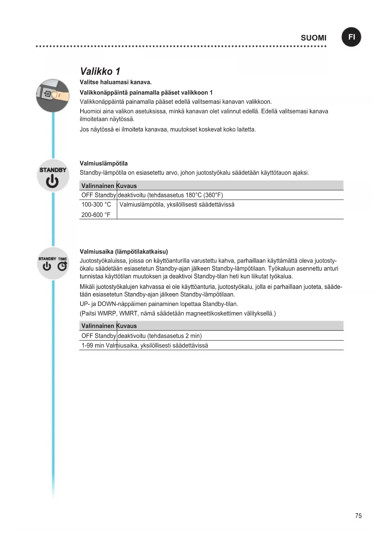 - Kontrollér indstillinger af interface75 Valikko 1 Valitse haluamasi kanava. Valikkonäppäintä painamalla pääset valikkoon 1 Valikkonäppäintä painamalla pääset edellä valitsemasi kanavan valikkoon. Huomioi aina valikon asetuksissa, minkä kanavan olet valinnut edellä. Edellä valitsemasi kanava ilmoitetaan näytössä. Jos näytössä ei ilmoiteta kanavaa, muutokset koskevat koko laitetta. Valmiuslämpötila Standby-lämpötila on esiasetettu arvo, johon juotostyökalu säädetään käyttötauon ajaksi. Valinnainen Kuvaus OFF Standby deaktivoitu (tehdasasetus 180°C (360°F) 100-300 °C 200-600 °F Valmiuslämpötila, yksilöllisesti säädettävissä Valmiusaika (lämpötilakatkaisu) Juotostyökaluissa, joissa on käyttöanturilla varustettu kahva, parhaillaan käyttämättä oleva juotosty- ökalu säädetään esiasetetun Standby-ajan jälkeen Standby-lämpötilaan. Työkaluun asennettu anturi tunnistaa käyttötilan muutoksen ja deaktivoi Standby-tilan heti kun liikutat työkalua. Mikäli juotostyökalujen kahvassa ei ole käyttöanturia, juotostyökalu, jolla ei parhaillaan juoteta, sääde- tään esiasetetun Standby-ajan jälkeen Standby-lämpötilaan. UP- ja DOWN-näppäimen painaminen lopettaa Standby-tilan. (Paitsi WMRP, WMRT, nämä säädetään magneettikoskettimen välityksellä.) Valinnainen Kuvaus OFF Standby deaktivoitu (tehdasasetus 2 min) 1-99 min Valmiusaika, yksilöllisesti säädettävissä