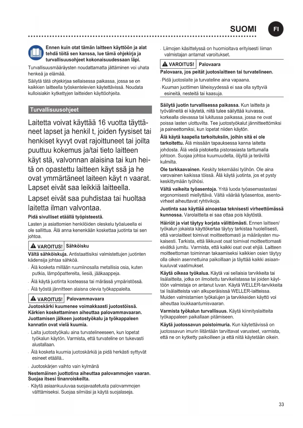 - Kuuman juottimen läheisyydessä ei saa olla syttyviä esineitä, nesteitä tai kaasuja. Säilytä juotin turvallisessa paikassa. Kun laitteita ja työvälineitä ei käytetä, niitä tulee säilyttää kuivassa, korkealla olevassa tai lukitussa paikassa, jossa ne ovat poissa lasten ulottuvilta. Tee juotostyökalut jännitteettömiksi ja paineettomiksi, kun lopetat niiden käytön. Älä käytä kaapelia tarkoituksiin, joihin sitä ei ole tarkoitettu. Älä missään tapauksessa kanna laitetta johdosta. Älä vedä pistoketta pistorasiasta tarttumalla johtoon. Suojaa johtoa kuumuudelta, öljyltä ja teräviltä kulmilta. Ole tarkkaavainen. Keskity tekemääsi työhön. Ole aina varovainen kaikissa töissä. lä käytä juotinta, jos et pysty keskittymään työhösi. Vältä vaikeita työasentoja. Yritä luoda työasemastastasi ergonomisesti miellyttävä. Vältä väärää työasentoa, asento- virheet aiheuttavat ryhtivikoja. Juotinta saa käyttää ainoastaa teknisesti virheettömässä kunnossa. Varolaitteita ei saa ottaa pois käytöstä. Häiriöt ja viat täytyy korjata välittömästi. Ennen laitteen/ työkalun jokaista käyttökertaa täytyy tarkistaa huolellisesti, että varolaitteet toimivat moitteettomasti ja määräysten mu- kaisesti. Tarkista, että liikkuvat osat toimivat moitteettomasti eivätkä jumitu. Varmista, että kaikki osat ovat ehjiä. Laitteen moitteettoman toiminnan takaamiseksi kaikkien osien täytyy olla oikein asennettuina paikoillaan ja täyttää kaikki asiaan- kuuluvat vaatimukset. Käytä oikeaa työkalua. Käytä vai sellaisia tarvikkeita tai lisälaitteita, jotka on ilmoitettu tarvikelistassa tai joiden käyt- töön valmistaja on antanut luvan. Käytä WELLER-tarvikkeita tai lisälaitteista vain alkuperäisissä WELLER-laitteissa. Muiden valmistamien työkalujen ja tarvikkeiden käyttö voi aiheuttaa loukkaantumisvaaran. Varmista työkalun turvallisuus. Käytä kiinnityslaitteita työkappaleen paikallaan pitämiseen. Käytä juotossavun poistoimuria. Kun käytettävissä on juotossavun imurin liitäntään tarvittavat varusteet, varmista, että ne on kytketty paikoilleen ja että niitä käytetään oikein.