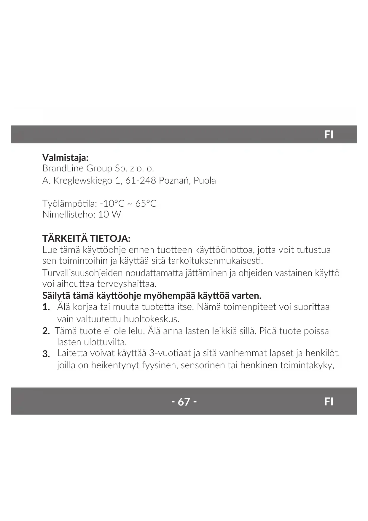 Valmistaja: BrandLine Group Sp. z o. o. A. Kręglewskiego 1, 61-248 Poznań, Puola Työlämpöla: -10°C ~ 65°C Nimellisteho: 10 W TÄRKEITÄ TIETOJA: Lue tämä käyöohje ennen tuoeen käyöönooa, joa voit tutustua sen toimintoihin ja käyää sitä tarkoituksenmukaises. Turvallisuusohjeiden noudaamaa jääminen ja ohjeiden vastainen käyö voi aiheuaa terveyshaiaa. Säilytä tämä käyöohje myöhempää käyöä varten.