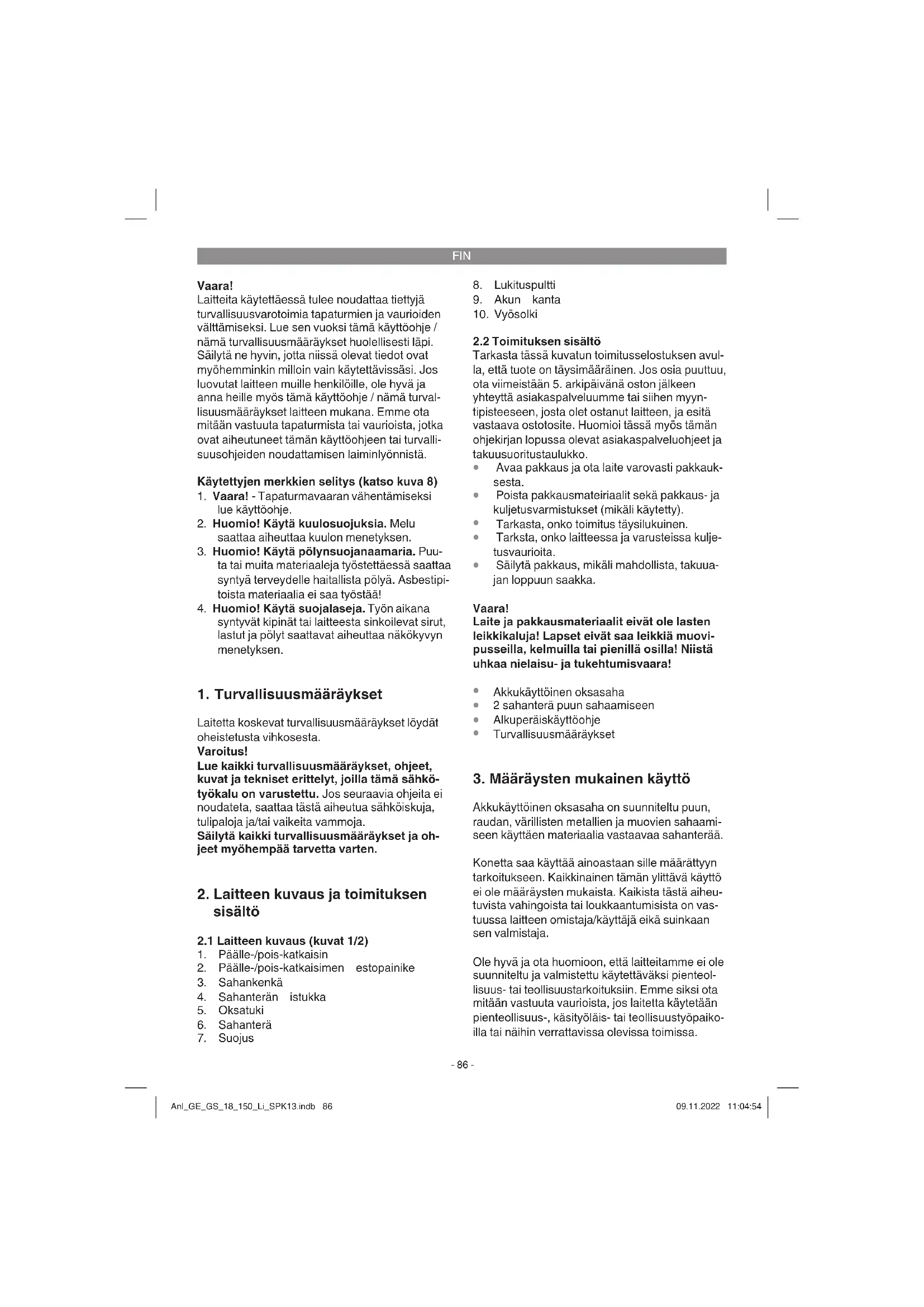 Akkukäyttöinen oksasaha on suunniteltu puun, raudan, värillisten metallien ja muovien sahaami- seen käyttäen materiaalia vastaavaa sahanterää. Konetta saa käyttää ainoastaan sille määrättyyn tarkoitukseen. Kaikkinainen tämän ylittävä käyttö ei ole määräysten mukaista. Kaikista tästä aiheu- tuvista vahingoista tai loukkaantumisista on vas- tuussa laitteen omistaja/käyttäjä eikä suinkaan sen valmistaja. Ole hyvä ja ota huomioon, että laitteitamme ei ole suunniteltu ja valmistettu käytettäväksi pienteol- lisuus- tai teollisuustarkoituksiin. Emme siksi ota mitään vastuuta vaurioista, jos laitetta käytetään pienteollisuus-, käsityöläis- tai teollisuustyöpaiko- illa tai näihin verrattavissa olevissa toimissa. Anl_GE_GS_18_150_Li_SPK13.indb 86Anl_GE_GS_18_150_Li_SPK13.indb 86 09.11.2022 11:04:5409.11.2022 11:04:54FIN