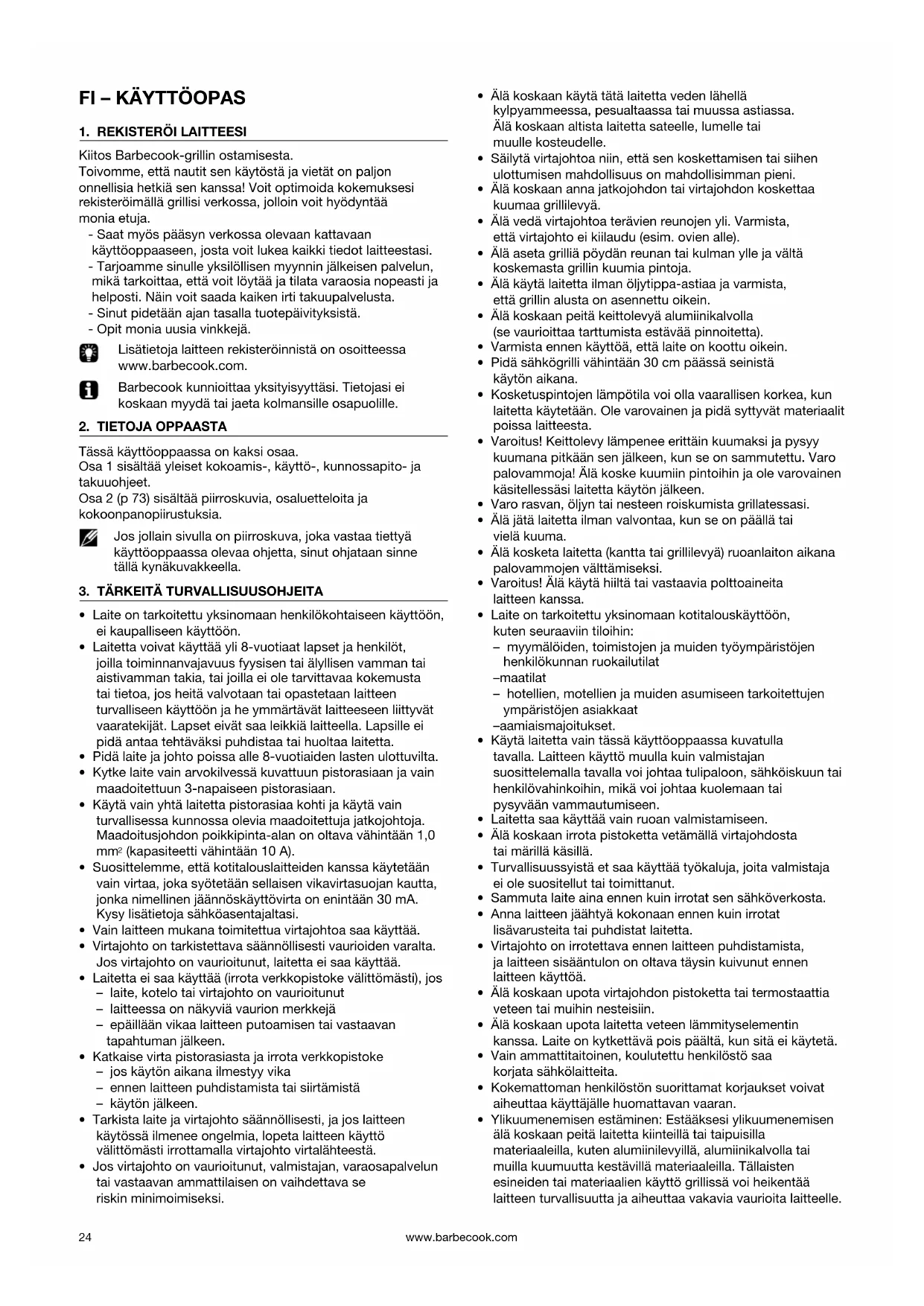 Kiitos Barbecook-grillin ostamisesta. Toivomme, että nautit sen käytöstä ja vietät on paljon onnellisia hetkiä sen kanssa! Voit optimoida kokemuksesi rekisteröimällä grillisi verkossa, jolloin voit hyödyntää monia etuja. - Saat myös pääsyn verkossa olevaan kattavaan käyttöoppaaseen, josta voit lukea kaikki tiedot laitteestasi. - Tarjoamme sinulle yksilöllisen myynnin jälkeisen palvelun, mikä tarkoittaa, että voit löytää ja tilata varaosia nopeasti ja helposti. Näin voit saada kaiken irti takuupalvelusta. - Sinut pidetään ajan tasalla tuotepäivityksistä. - Opit monia uusia vinkkejä. Lisätietoja laitteen rekisteröinnistä on osoitteessa www.barbecook.com. Barbecook kunnioittaa yksityisyyttäsi. Tietojasi ei koskaan myydä tai jaeta kolmansille osapuolille.