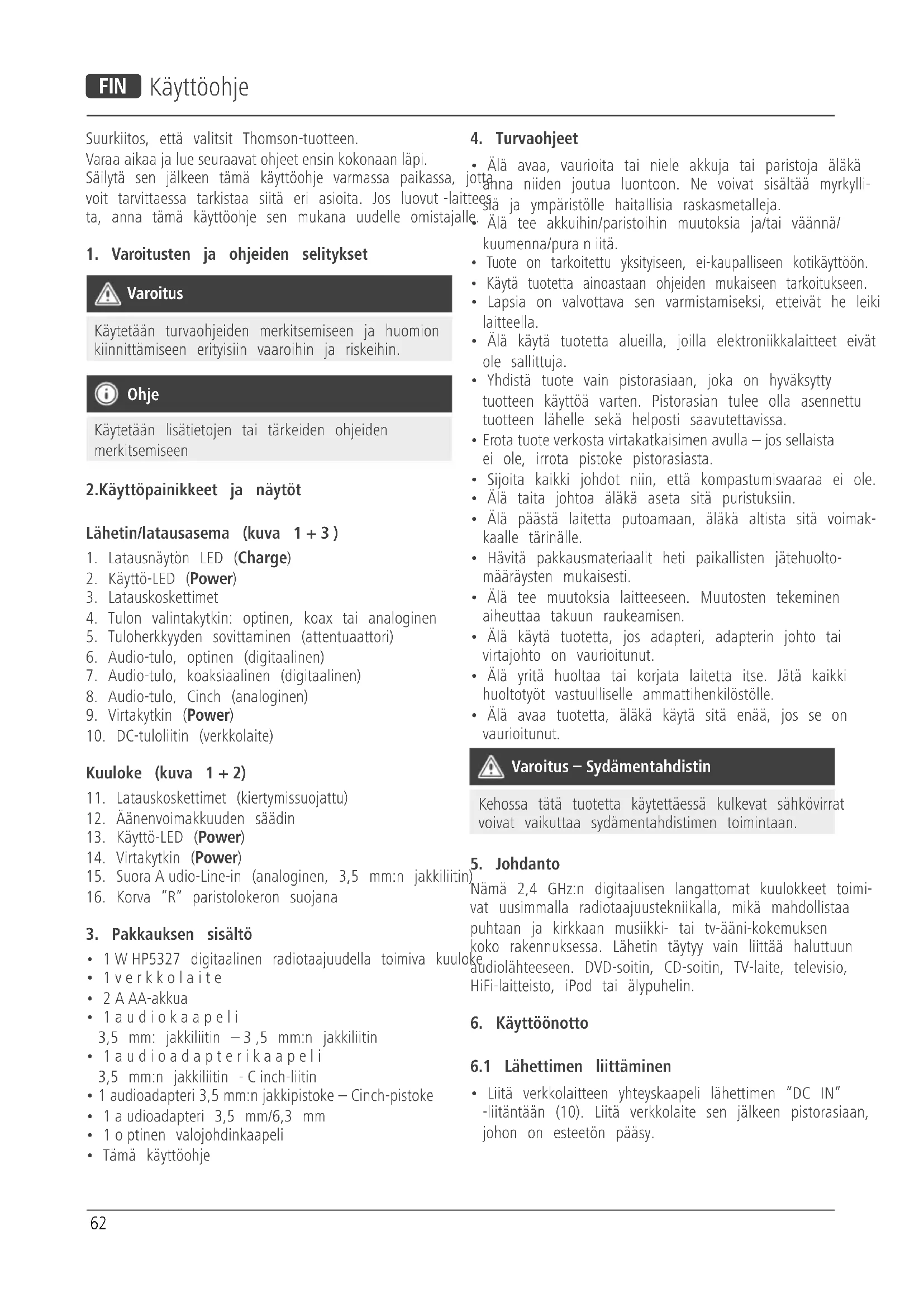 - Tuotteen käyttö rajoittaa ympäristön äänten havaitse- mista. Siksi sen kanssa ei saa samanaikaisesti käyttää ajoneuvoja eikä koneita.