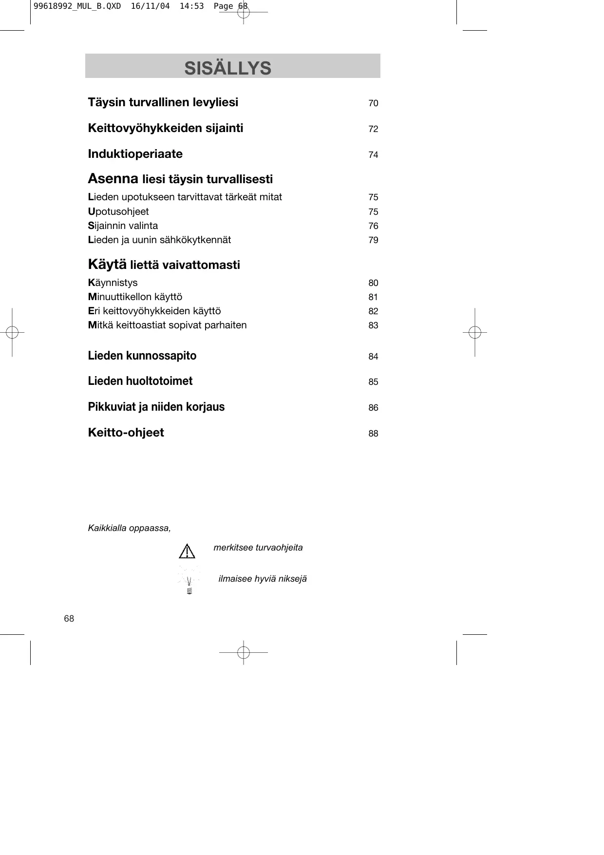 16/11/04 14:53 Page 70 Täysin turvallinen levyliesi Asenna liesi täysin turvallisesti KATTILAN turvallisuus Tämä (pyörrevirta-) liesi on suunniteltu yksityiskäyttöön asuinhuoneistossa. Haluten parantaa tuotteitamme jatkuvasti varaamme itsellemme oikeuden muuttaa laitteidemme teknisiä, toiminnallisia ja esteettisiä ominaisuuksia teknologian kehityksen mukaan. Tämä liesi on tarkoitettu yksinomaan juomien elintarvikkeiden kypsytykseen ja siihen ei kuulu mitään asbestipitoista osaa. Jokaisessa keittovyöhykkeessä on anturi, joka valvoo jatkuvasti keittoastian pohjan lämpötilaa, joten ylikuumennusvaaraa ei ole (tyhjä kattila). Kehotamme tarkastamaan aika ajoin, ettei lieden alla olevissa ilma-aukossa ole tukkivia esineitä (riepua, paperia jne.) (ks. upotettu asennus). METALLISIA ESINEITÄ koskeva turvallisuus Jos pienikokoinen esine kuten haarukka, lusikka tai vaikka sormus jne. on yksin kuumennuslevyllä, sitä ei havaita astiaksi. Näyttö vilkkuu ja virta on katkaistu. nmoins être confortés sur la de votre stimulateur, LEVYN turvallisuus Lämpöanturi valvoo jatkuvasti lieden osien lämpötilaa. Jos se kohoaa liian korkeaksi, lieden sähköteho alenee automaattisesti. Jos liesi on paistouunin päällä (ks. mahdolliset sisäänasennukset) lieden lämpövarmistukset estävät sen samanaikaisen käytön uunin kanssa pyrolyysinä.