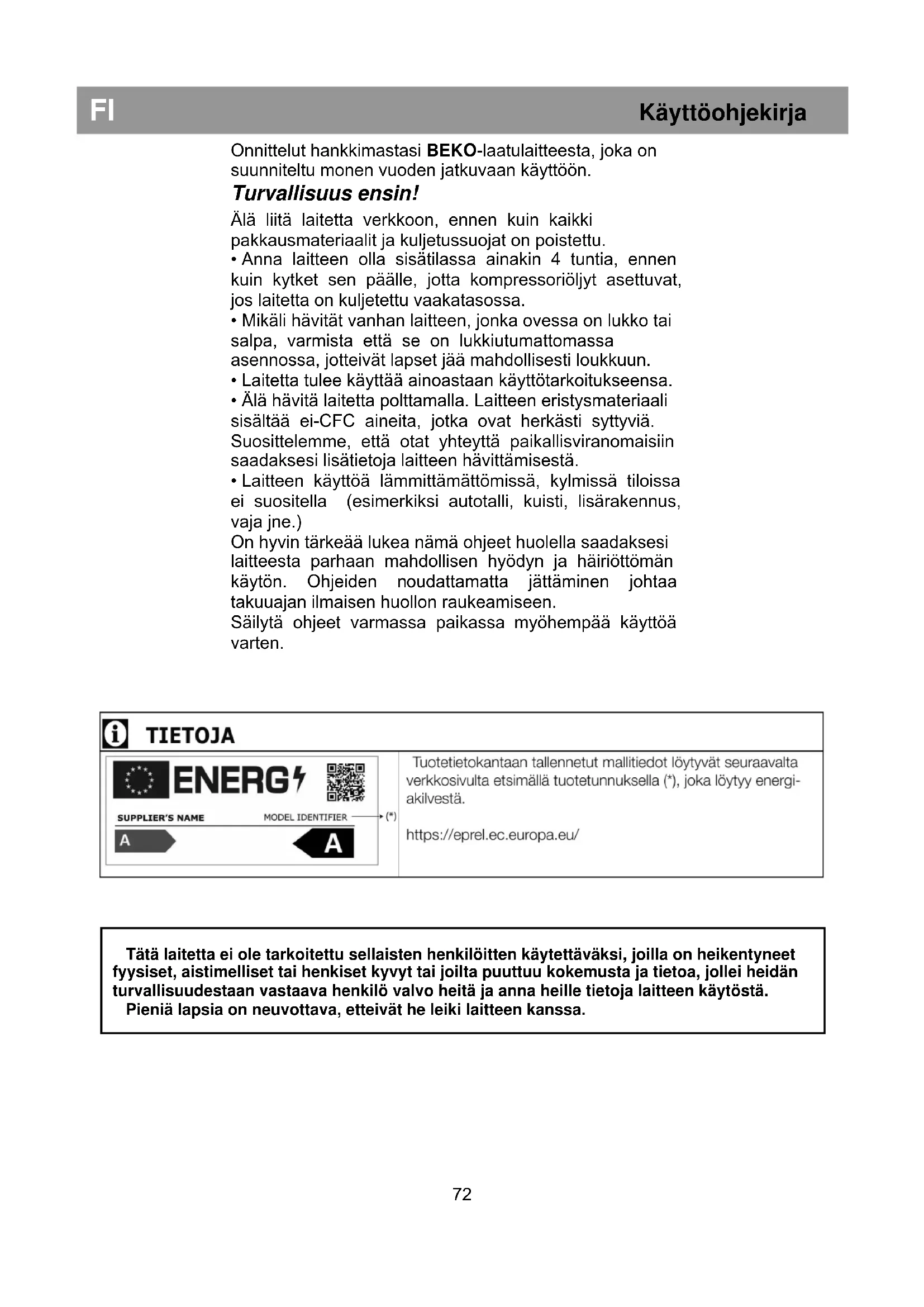 Turvallisuus ensin! /72 Sähkötekniset vaatimukset /73 Kuljetusohjeet /73 Asennusohjeet /73 Laitteen ominaisuudet /74 Ehdotus ruokien sijoittamisesta laitteeseen /74 Lämpötilan ohjaus ja säätö /74 Ennen käyttöönottoa /75 Pakastetun ruuan säilyttäminen /75 Tuoreen ruuan pakastaminen /75 Jääpalojen teko /75 Sulatus /75 Sisälampun vaihtaminen /76 Puhdistus ja huolto /76 Ovien uudelleen sijoitus /76 Tee ja älä tee /77 Energian kulutus /77 Tietoja laitteen käytön aikana mahdollisesti kuuluvista äänistä ja tärinästä /78 Vianetsintä /78EN This product is equipped with a lighting source of the "G" energy class. The lighting source in this product shall only be replaced by professional repairers.