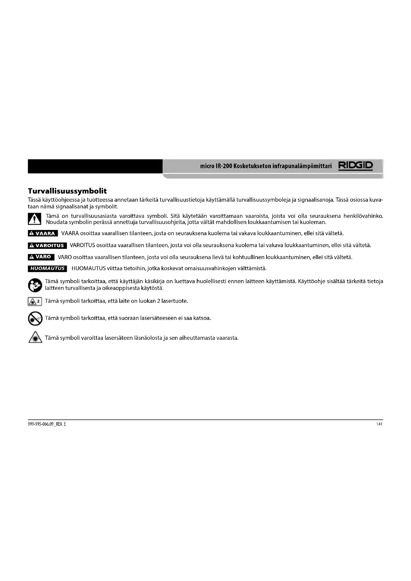 Anna pätevän korjaajan huoltaa laite käyttäen ainoastaan i den ttisiä varaosia. Tämä varmistaa sähkötyökalun tur val li suu den. Erityisiä turvallisuustietoja VAROITUS Tämä kohta sisältää nimenomaan tähän työkaluun liittyviä tärkei- tä turvallisuusohjeita. Lue nämä ohjeet huolellisesti ennen kosketuksettoman RIDGID® micro IR-200 -infrapunalämpömittarin käyttöä tulipalo-, räjähdys- ja vakavien henkilövahinkojen vaaran pienentämiseksi. SÄILYTÄ NÄMÄ OHJEET! Säilytä tämä käsikirja työkalun yhteydessä, jotta se on käyttäjän käy- te ttävissä. Infrapunalämpömittarin turvallisuus