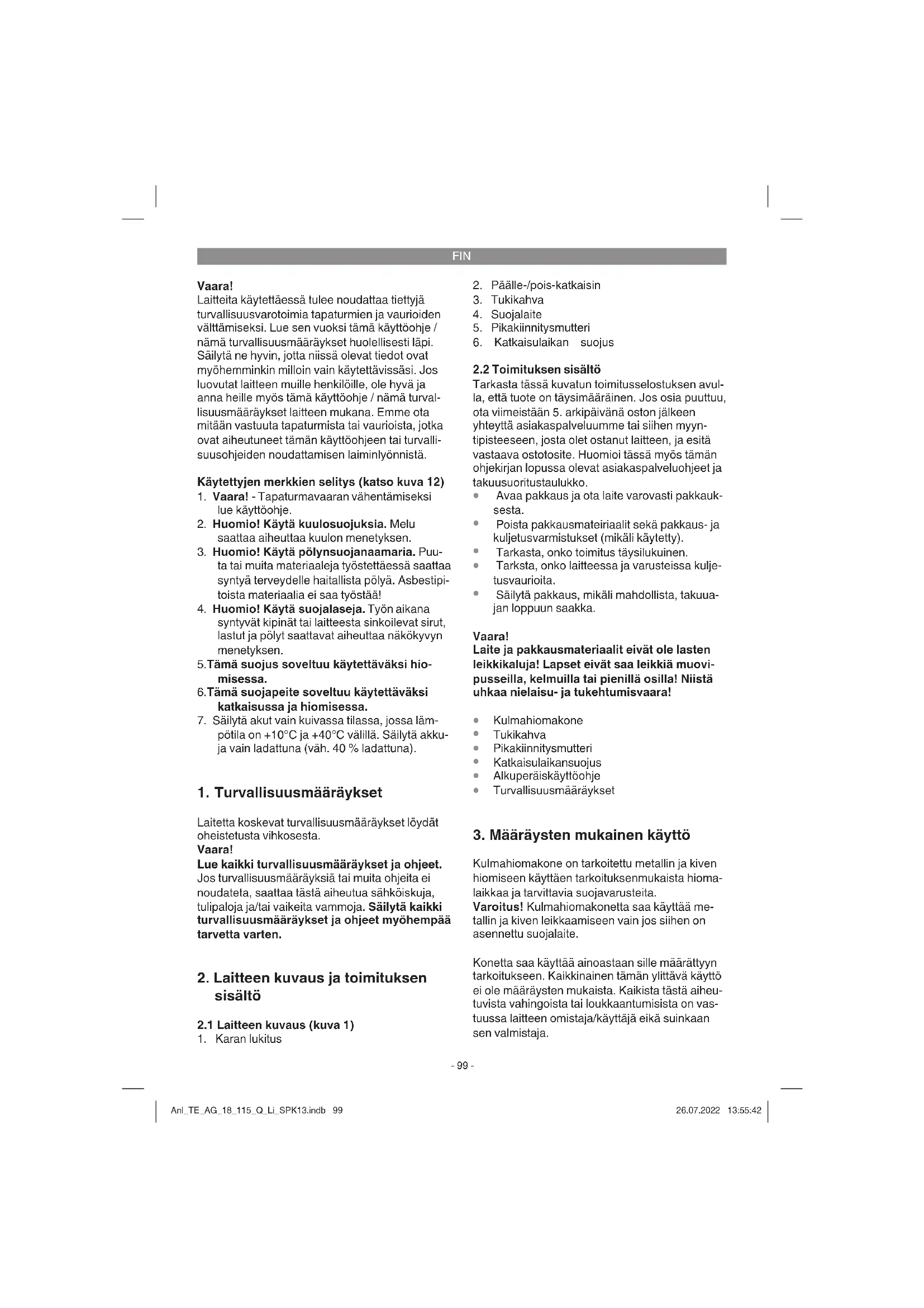Kulmahiomakone on tarkoitettu metallin ja kiven hiomiseen käyttäen tarkoituksenmukaista hioma- laikkaa ja tarvittavia suojavarusteita. Varoitus! Kulmahiomakonetta saa käyttää me- tallin ja kiven leikkaamiseen vain jos siihen on asennettu suojalaite. Konetta saa käyttää ainoastaan sille määrättyyn tarkoitukseen. Kaikkinainen tämän ylittävä käyttö ei ole määräysten mukaista. Kaikista tästä aiheu- tuvista vahingoista tai loukkaantumisista on vas- tuussa laitteen omistaja/käyttäjä eikä suinkaan sen valmistaja. Anl_TE_AG_18_115_Q_Li_SPK13.indb 99Anl_TE_AG_18_115_Q_Li_SPK13.indb 99 26.07.2022 13:55:4226.07.2022 13:55:42FIN