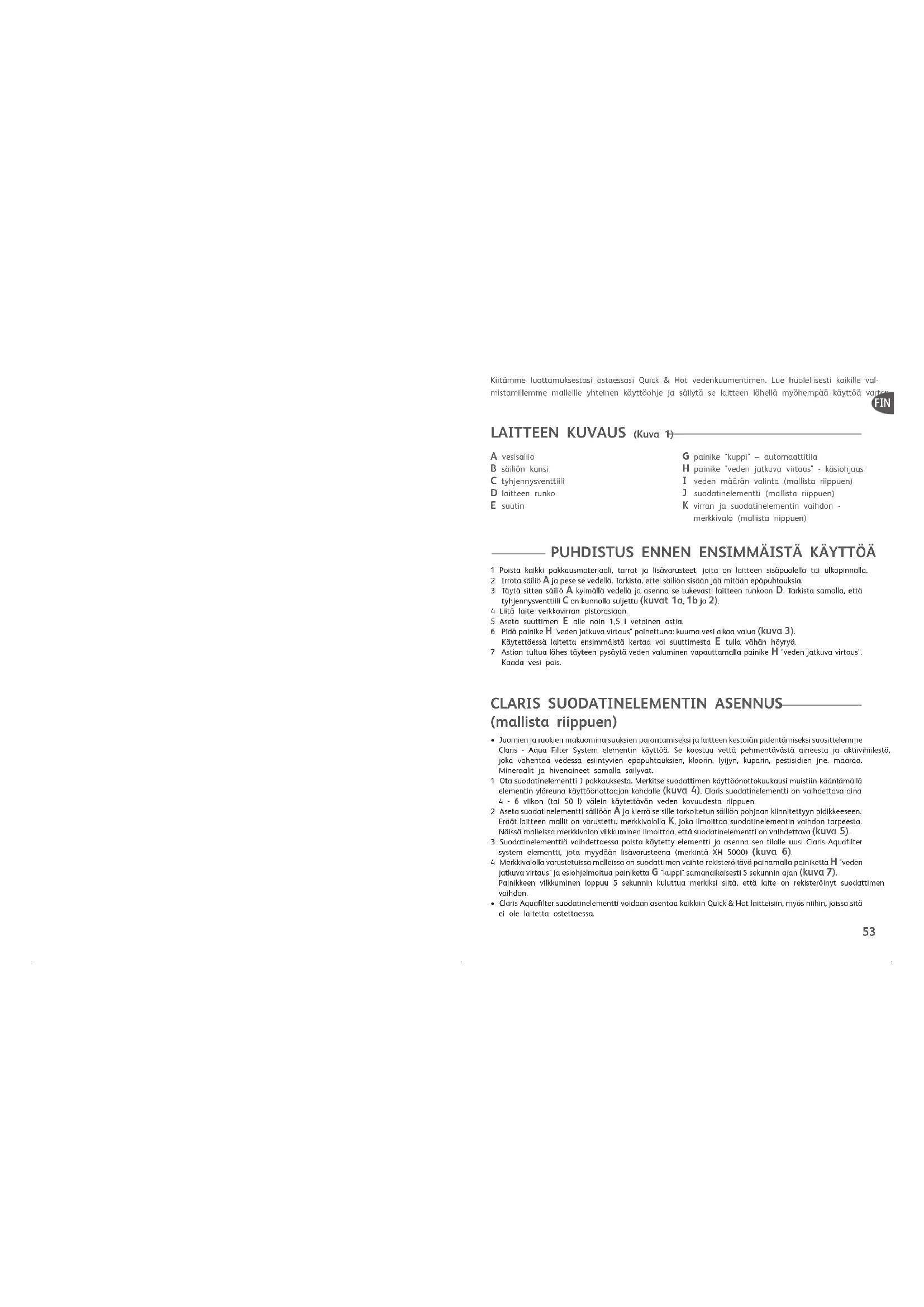 FIN A vesisäiliö B säiliön kansi C tyhjennysventtiili D laitteen runko E suutin G painike "kuppi" – automaattitila H painike "veden jatkuva virtaus" - käsiohjaus I veden määrän valinta (mallista riippuen) J suodatinelementti (mallista riippuen) K virran ja suodatinelementin vaihdon - merkkivalo (mallista riippuen) Notice Tefal BR 301141:Mise en page 1 19/03/07 15:32 Page 52PUHDISTUS JA HUOLTO