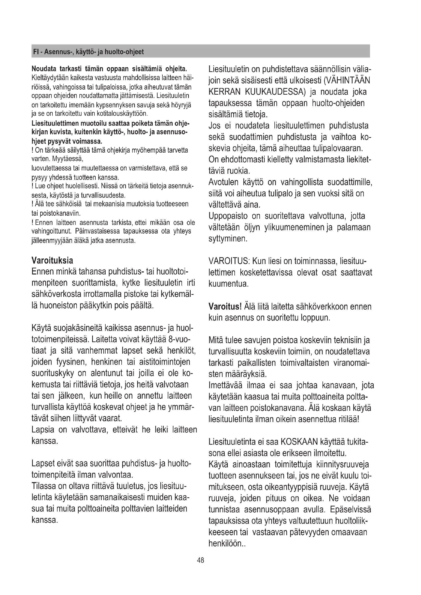 När man väl har öppnat den utdragbara vagnen kan man aktivera äktmotorn genom att trycka på betjäningspanelen enligt nedan. Panelen stängs på motsvarande vis. Man be- höver alltså trycka på den främre glasrutan tills vagnen har stängts helt. T1. T2. T3. Knapp ON/OFF för timer: tryck på knappen för att programmera den automatiska avstängningen: Hastighet 1: 20 minuter Hastighet 2: 15 minuter Hastighet 3: 10 minuter Intensiv hastighet: 5 minuter Knapp för fartminskning (effektminskning) hos själva utsugningen OFF 1: tryck på den här knappen era gånger för att minska på hastigheten tills äkten har stängts av. OFF 2: håll knappen intryckt länge oavsett hastighet. ON-knapp/knapp för fartökning (effektökning) hos själva uppsugningen (1-2-3-Intensiv). Intensivhastigheten varar i cirka 5 minuter. Därefter ställs hastighet 2 in automatiskt.47 Indikator för fulla lter Fläktkåpan anger när man behöver underhålla ltren: Fettlter (cirka var 40:e drifttimma): samtliga lysdioder är ljusblå. Odörlter med aktivt kol (cirka var 160:e drifttimma): samtliga lysdioder är ljusblå medan lysdiod L2 och L3 blin- kar. Återställning av fulla lter Efter att ha underhållit ltren ska man trycka länge på knapp T1 och T3. Nu kommer lysdioderna L1, L2 och L3 att blinka snabbt med ljusblått ljus innan de stängs av för gott. Aktivering av indikatorn för att odörltret med aktivt kol är fullt. Den här indikatorn är normalt avaktiverad. För att aktivera den går man tillväga på följande sätt: Med äkten avstängd trycker man och håller knapparna T1 och T2 intryckta länge och samtidigt: först tänds L1 och sedan även L2 och L3. I samband med att knapparna släpps upp blinkar sedan lysdioderna L2 och L3 snabbt för att indikera att aktiveringen är utförd. Inaktivering av lysdiod för fulla kollter: upprepa arbets- momentet som beskrivs ovan. Först tänds samtidigt lysdio- derna L1, L2 och L3. Sedan släcks lysdioderna L2 och L3 i samband med att knapparna släpps upp som en indikation på att inaktiveringen är utförd. UNDERHÅLL Fettlter Fångar upp fettpartiklar som uppkommit under tillagningen. Fettltret ska rengöras en gång i månaden (eller när sy- stemet för indikation om fulla lter - om något sådant har förutsetts för innehavd modell - anger att behovet nns), manuellt med icke frätande rengöringsmedel eller i diskma- skin vid låga temperaturer och med ett snabbt diskprogram. Vid diskning i diskmaskin kan fettltret i metall tappa färg. Filtrets ltreringsegenskaper påverkas dock absolut inte. Aktivt kollter (gäller enbart för versionen med återcirkule- ring). Filtret fångar upp obehaglig lukt som uppkommer när man lagar mat. Kolltret fylls efter att det har använts under en längre tid och beroende på kökstypen och på hur ofta fettltret i sin tur har rengjorts. Hur som helst så behöver man byta ut lterpatronen minst var fjärde månad. Efter att ha plockar bort fettltren kan man lägga in kolltren (Fig. 8).48 FI - Asennus-, käyttö- ja huolto-ohjeet Noudata tarkasti tämän oppaan sisältämiä ohjeita. Kieltäydytään kaikesta vastuusta mahdollisissa laitteen häi- riöissä, vahingoissa tai tulipaloissa, jotka aiheutuvat tämän oppaan ohjeiden noudattamatta jättämisestä. Liesituuletin on tarkoitettu imemään kypsennyksen savuja sekä höyryjä ja se on tarkoitettu vain kotitalouskäyttöön. Liesituulettimen muotoilu saattaa poiketa tämän ohje- kirjan kuvista, kuitenkin käyttö-, huolto- ja asennuso- hjeet pysyvät voimassa. ! On tärkeää säilyttää tämä ohjekirja myöhempää tarvetta varten. Myytäessä, luovutettaessa tai muutettaessa on varmistettava, että se pysyy yhdessä tuotteen kanssa. ! Lue ohjeet huolellisesti. Niissä on tärkeitä tietoja asennuk- sesta, käytöstä ja turvallisuudesta. ! Älä tee sähköisiä tai mekaanisia muutoksia tuotteeseen tai poistokanaviin. ! Ennen laitteen asennusta tarkista, ettei mikään osa ole vahingoittunut. Päinvastaisessa tapauksessa ota yhteys jälleenmyyjään äläkä jatka asennusta. Varoituksia Ennen minkä tahansa puhdistus- tai huoltotoi- menpiteen suorittamista, kytke liesituuletin irti sähköverkosta irrottamalla pistoke tai kytkemäl- lä huoneiston pääkytkin pois päältä. Käytä suojakäsineitä kaikissa asennus- ja huol- totoimenpiteissä. Laitetta voivat käyttää 8-vuo- tiaat ja sitä vanhemmat lapset sekä henkilöt, joiden fyysinen, henkinen tai aistitoimintojen suorituskyky on alentunut tai joilla ei ole ko- kemusta tai riittäviä tietoja, jos heitä valvotaan tai sen jälkeen, kun heille on annettu laitteen turvallista käyttöä koskevat ohjeet ja he ymmär- tävät siihen liittyvät vaarat. Lapsia on valvottava, etteivät he leiki laitteen kanssa. Lapset eivät saa suorittaa puhdistus- ja huolto- toimenpiteitä ilman valvontaa. Tilassa on oltava riittävä tuuletus, jos liesituu- letinta käytetään samanaikaisesti muiden kaa- sua tai muita polttoaineita polttavien laitteiden kanssa. Liesituuletin on puhdistettava säännöllisin välia- join sekä sisäisesti että ulkoisesti (VÄHINTÄÄN KERRAN KUUKAUDESSA) ja noudata joka tapauksessa tämän oppaan huolto-ohjeiden sisältämiä tietoja. Jos ei noudateta liesituulettimen puhdistusta sekä suodattimien puhdistusta ja vaihtoa ko- skevia ohjeita, tämä aiheuttaa tulipalovaaran. On ehdottomasti kielletty valmistamasta liekitet- täviä ruokia. Avotulen käyttö on vahingollista suodattimille, siitä voi aiheutua tulipalo ja sen vuoksi sitä on vältettävä aina. Uppopaisto on suoritettava valvottuna, jotta vältetään öljyn ylikuumeneminen ja palamaan syttyminen. VAROITUS: Kun liesi on toiminnassa, liesituu- lettimen kosketettavissa olevat osat saattavat kuumentua. Varoitus! Älä liitä laitetta sähköverkkoon ennen kuin asennus on suoritettu loppuun. Mitä tulee savujen poistoa koskeviin teknisiin ja turvallisuutta koskeviin toimiin, on noudatettava tarkasti paikallisten toimi
