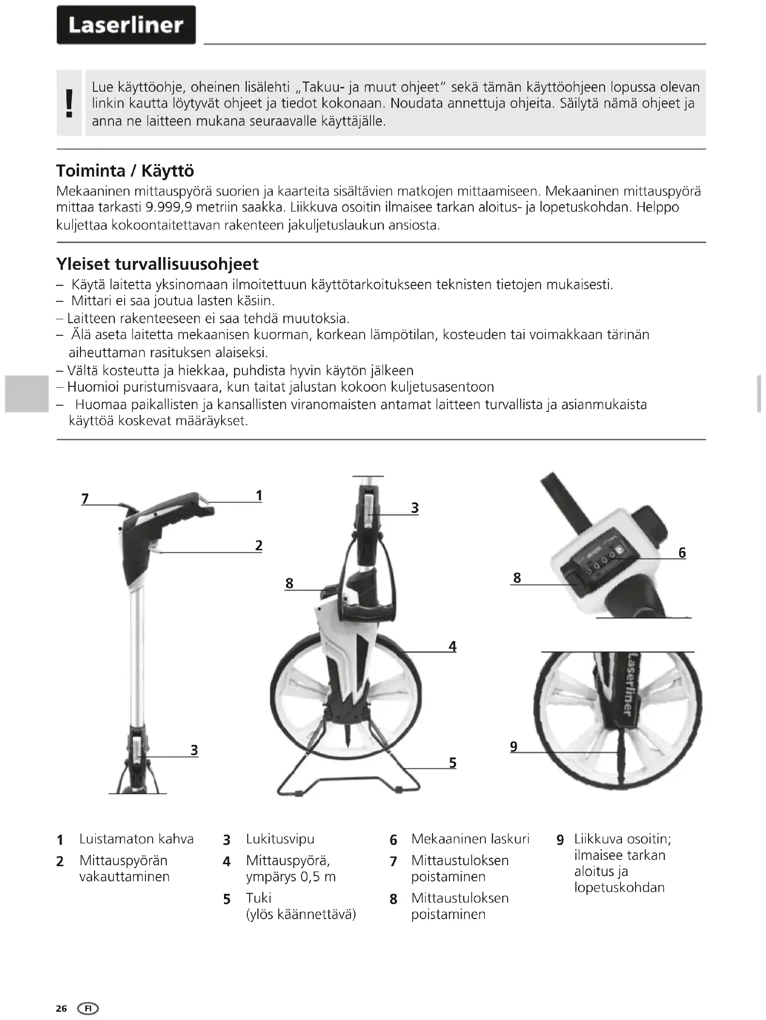 Toiminta / Käyttö Mekaaninen mittauspyörä suorien ja kaarteita sisältävien matkojen mittaamiseen. Mekaaninen mittauspyörä mittaa tarkasti 9.999,9 metriin saakka. Liikkuva osoitin ilmaisee tarkan aloitus- ja lopetuskohdan. Helppo kuljettaa kokoontaitettavan rakenteen jakuljetuslaukun ansiosta. Yleiset turvallisuusohjeet – Käytä laitetta yksinomaan ilmoitettuun käyttötarkoitukseen teknisten tietojen mukaisesti. – Mittari ei saa joutua lasten käsiin. – Laitteen rakenteeseen ei saa tehdä muutoksia. – Älä aseta laitetta mekaanisen kuorman, korkean lämpötilan, kosteuden tai voimakkaan tärinän aiheuttaman rasituksen alaiseksi. – Vältä kosteutta ja hiekkaa, puhdista hyvin käytön jälkeen – Huomioi puristumisvaara, kun taitat jalustan kokoon kuljetusasentoon – Huomaa paikallisten ja kansallisten viranomaisten antamat laitteen turvallista ja asianmukaista käyttöä koskevat määräykset.
