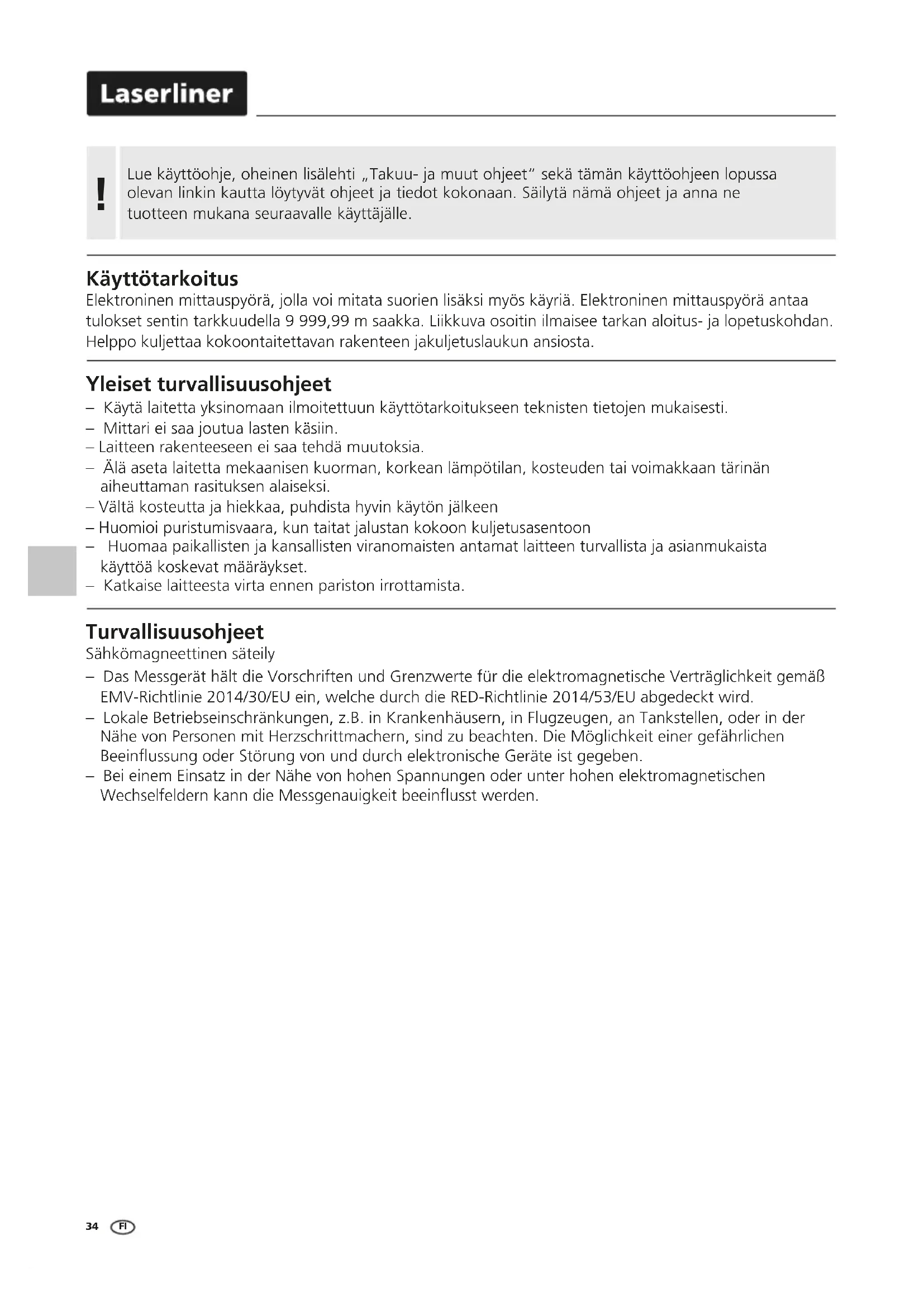 Tekniset tiedot (Tekniset muutokset mahdollisia. 23W13) Tarkkuus ± 0,1% Toiminta-alue 0 – 9.999,99 m Mittauspyörän säde 159 mm Mittauspyörän ympärys 1000 mm Toiminnot Pituuden mittaus, Pituuksien lisääminen ja vähentäminen Yksiköt ft, m Muisti 5 muistipaikkaa Automaattinen virrankatkaisu 5 minuutin kuluttua (kun näyttö ei muutu) Virtalähde 1 x 9V 6LR61 (9V Block) Käyttölämpötila 0 … 40 °C Säilytyslämpötila -20 °C … 70 °C Mitat (L x K x S) 318 x 1000 x 140 mm Paino (ml. paristot) 2100 g EU- ja UK-määräykset ja hävittäminen Laite täyttää kaikki EU:n alueella ja UK:ssa tapahtuvaa vapaata tavaranvaihtoa koskevat standardit. Tämä tuote, lisävarusteet ja pakkaukset mukaan lukien, on sähkölaite, joka eurooppaöaisten ja UK:n sähkö- ja elektroniikkaromua, akkuja ja pakkauksia koskevien direktiivien mukaisesti on kierrätettävä ympäristöystävällisellä tavalla arvokkaiden raaka-aineiden talteenottamiseksi. Lisätietoja, turvallisuus- yms. ohjeita: https://www.laserliner.com Laitteen kokoontaittaminen kuljetusta varten Ohjeet huoltoa ja hoitoa varten Puhdista kaikki osat nihkeällä kankaalla. Älä käytä pesu- tai hankausaineita äläkä liuottimia. Ota paristo(t) pois laitteesta pitkän säilytyksen ajaksi. Säilytä laite puhtaassa ja kuivassa paikassa. Kalibrointi Mittalaite pitää kalibroida ja tarkastaa säännöllisin väliajoin mittaustulosten tarkkuuden varmistamiseksi. Suosittelemme, että laite kalibroidaan kerran vuodessa. Ota sitä varten yhteys laitteen jälleenmyyjään tai suoraan UMAREX-LASERLINER-huolto-osastoon.38