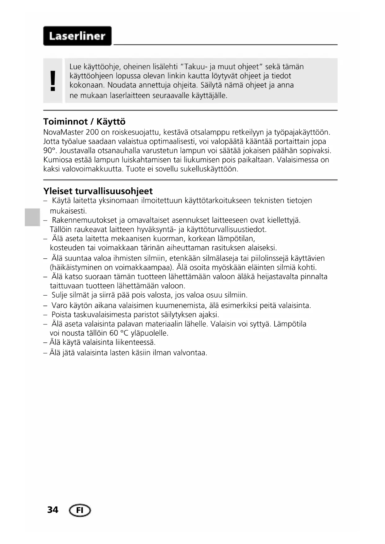 Przepisy UE i usuwanie Przyrząd spełnia wszystkie normy wymagane do wolnego obrotu towarów w UE. Produkt ten jest urządzeniem elektrycznym i zgodnie z europejską dyrektywą dotyczącą złomu elektrycznego i elektronicznego należy je zbierać i usuwać oddzielnie. Dalsze wskazówki dotyczące bezpieczeństwa i informacje dodatkowe patrz:www.laserliner.com/info Wskazówki dotyczące konserwacji ipielęgnacji Oczyścić wszystkie komponenty lekko zwilżoną ściereczką; unikać stosowania środków czyszczących, środków do szorowania irozpuszczalników. Przed dłuższym składowa- niem wyjąć baterie. Przechowywać urządzenie wczystym, suchym miejscu. Dane techniczne (Zmiany zastrzezone. 21W04) Jasność Wysoka / Niska 200 / 100 lm Czas świecenia Wysoki / Niski 6 / 12 h LED-Chip Osram SMT3528 Stopień ochrony IP 54 Zasilanie AAA Ni-MH 1,2 V / AAA Alkaliczne 1,5 V Warunki pracy -22° … 65° Warunki przechowywania -30° … 65° Długość całkowita 37 mm Masa całkowita 100 g PL34 Yleiset turvallisuusohjeet – Käytä laitetta yksinomaan ilmoitettuun käyttötarkoitukseen teknisten tietojen mukaisesti. – Rakennemuutokset ja omavaltaiset asennukset laitteeseen ovat kiellettyjä. Tällöin raukeavat laitteen hyväksyntä- ja käyttöturvallisuustiedot. – Älä aseta laitetta mekaanisen kuorman, korkean lämpötilan, kosteuden tai voimakkaan tärinän aiheuttaman rasituksen alaiseksi. – Älä suuntaa valoa ihmisten silmiin, etenkään silmälaseja tai piilolinssejä käyttävien (häikäistyminen on voimakkaampaa). Älä osoita myöskään eläinten silmiä kohti. – Älä katso suoraan tämän tuotteen lähettämään valoon äläkä heijastavalta pinnalta taittuvaan tuotteen lähettämään valoon. – Sulje silmät ja siirrä pää pois valosta, jos valoa osuu silmiin. – Varo käytön aikana valaisimen kuumenemista, älä esimerkiksi peitä valaisinta. – Poista taskuvalaisimesta paristot säilytyksen ajaksi. – Älä aseta valaisinta palavan materiaalin lähelle. Valaisin voi syttyä. Lämpötila voi nousta tällöin 60 °C yläpuolelle. – Älä käytä valaisinta liikenteessä. – Älä jätä valaisinta lasten käsiin ilman valvontaa. Toiminnot / Käyttö NovaMaster 200 on roiskesuojattu, kestävä otsalamppu retkeilyyn ja työpajakäyttöön. Jotta työalue saadaan valaistua optimaalisesti, voi valopäätä kääntää portaittain jopa 90°. Joustavalla otsanauhalla varustetun lampun voi säätää jokaisen päähän sopivaksi. Kumiosa estää lampun luiskahtamisen tai liukumisen pois paikaltaan. Valaisimessa on kaksi valovoimakkuutta. Tuote ei sovellu sukelluskäyttöön. Lue käyttöohje, oheinen lisälehti ”Takuu- ja muut ohjeet” sekä tämän käyttöohjeen lopussa olevan linkin kautta löytyvät ohjeet ja tiedot kokonaan. Noudata annettuja ohjeita. Säilytä nämä ohjeet ja anna ne mukaan laserlaitteen seuraavalle käyttäjälle.