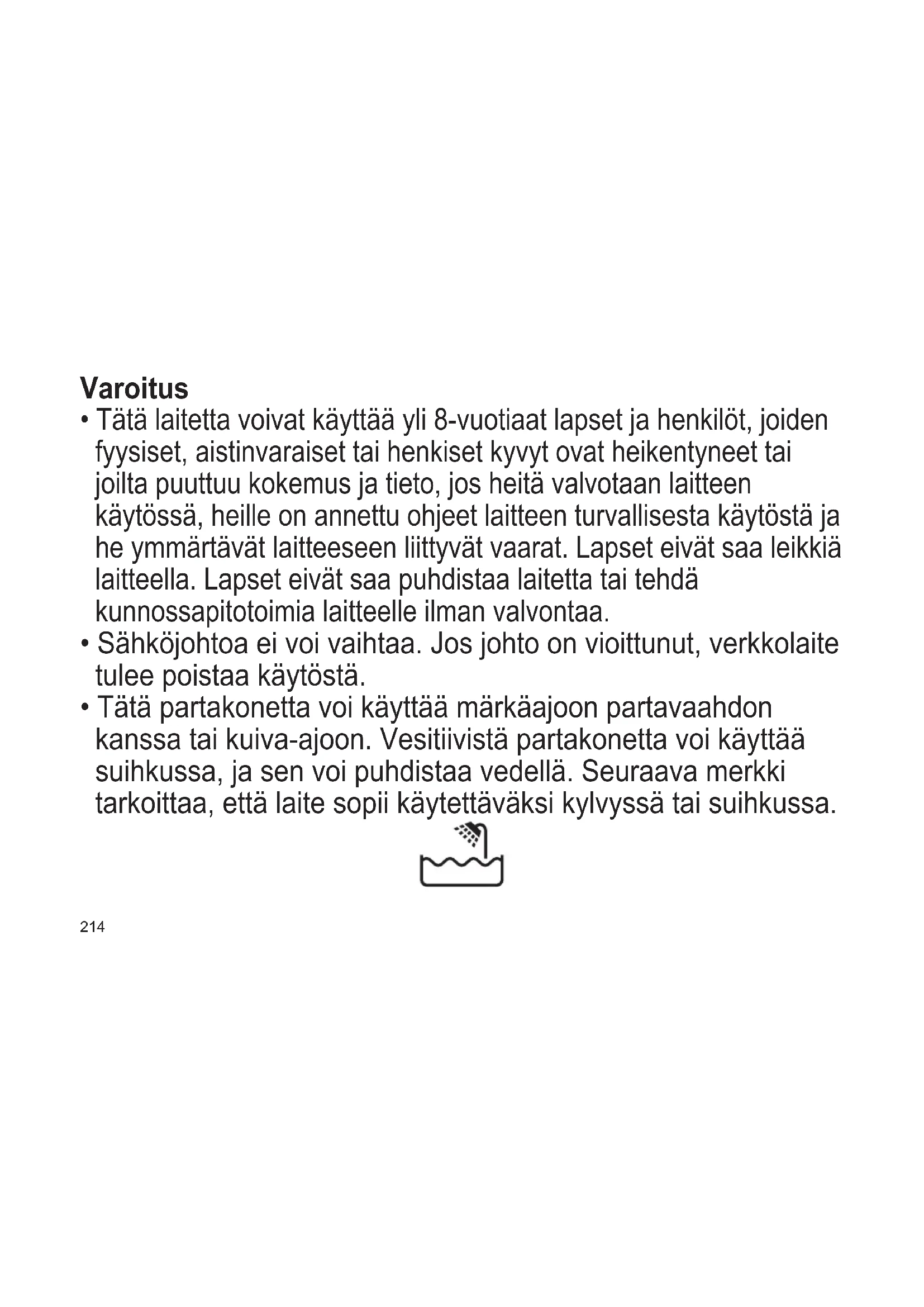 - Tätä partakonetta voi käyttää märkäajoon partavaahdon kanssa tai kuiva‑ajoon. Vesitiivistä partakonetta voi käyttää suihkussa, ja sen voi puhdistaa vedellä. Seuraava merkki tarkoittaa, että laite sopii käytettäväksi kylvyssä tai suihkussa.215 TR RO H SK CZ PL FIN S N P DK E NL I F D GB