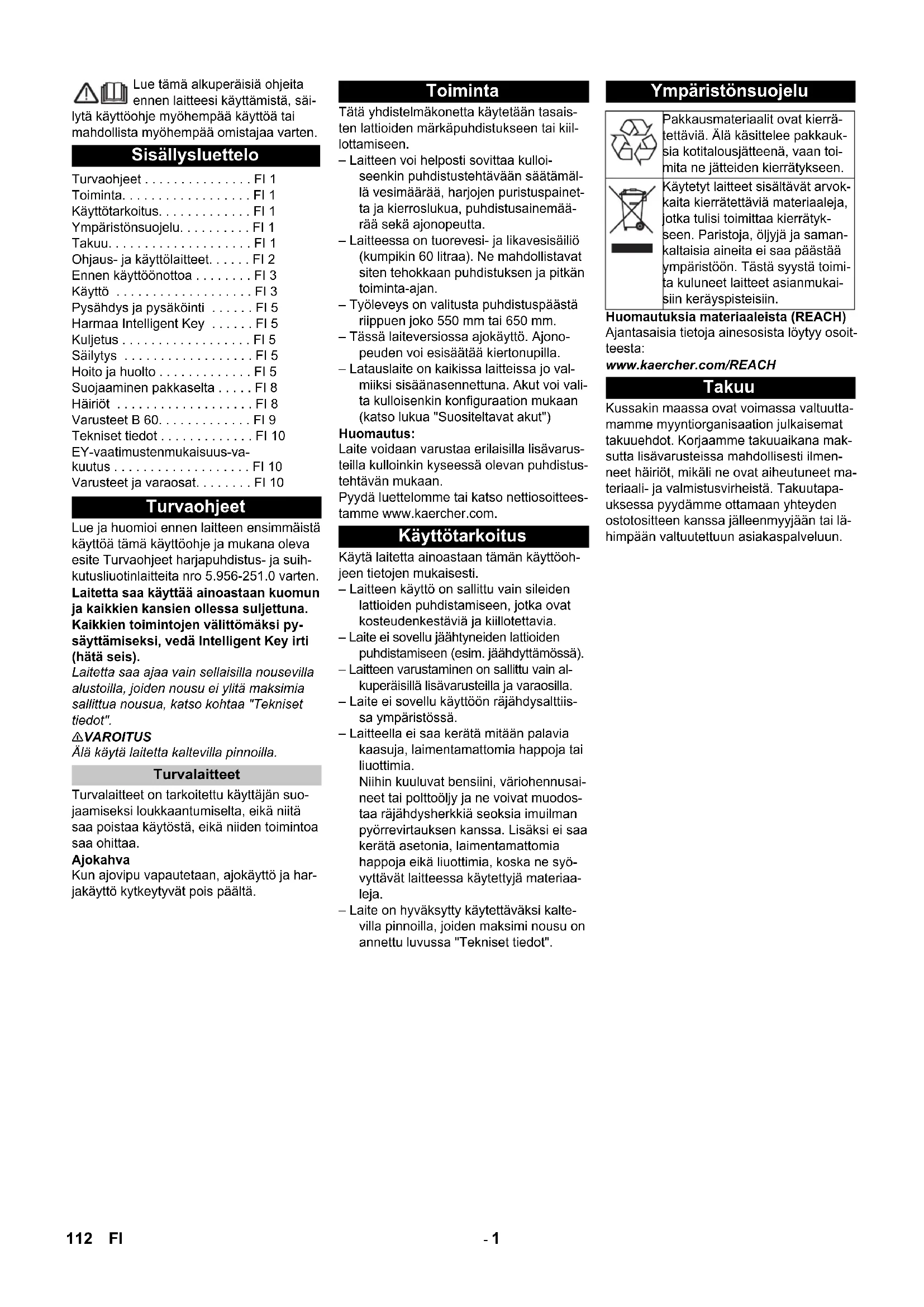 Tillbehör och reservdelar Chairman of the Board of Management Director Regulatory Affairs & Certification 111SV- 1 Lue tämä alkuperäisiä ohjeita ennen laitteesi käyttämistä, säi- lytä käyttöohje myöhempää käyttöä tai mahdollista myöhempää omistajaa varten. Lue ja huomioi ennen laitteen ensimmäistä käyttöä tämä käyttöohje ja mukana oleva esite Turvaohjeet harjapuhdistus- ja suih- kutusliuotinlaitteita nro 5.956-251.0 varten. Laitetta saa käyttää ainoastaan kuomun ja kaikkien kansien ollessa suljettuna. Kaikkien toimintojen välittömäksi py- säyttämiseksi, vedä Intelligent Key irti (hätä seis). Laitetta saa ajaa vain sellaisilla nousevilla alustoilla, joiden nousu ei ylitä maksimia sallittua nousua, katso kohtaa "Tekniset tiedot". 몇 VAROITUS Älä käytä laitetta kaltevilla pinnoilla. Turvalaitteet on tarkoitettu käyttäjän suo- jaamiseksi loukkaantumiselta, eikä niitä saa poistaa käytöstä, eikä niiden toimintoa saa ohittaa. Ajokahva Kun ajovipu vapautetaan, ajokäyttö ja har- jakäyttö kytkeytyvät pois päältä. Tätä yhdistelmäkonetta käytetään tasais- ten lattioiden märkäpuhdistukseen tai kiil- lottamiseen. – Laitteen voi helposti sovittaa kulloi- seenkin puhdistustehtävään säätämäl- lä vesimäärää, harjojen puristuspainet- ta ja kierroslukua, puhdistusainemää- rää sekä ajonopeutta. – Laitteessa on tuorevesi- ja likavesisäiliö (kumpikin 60 litraa). Ne mahdollistavat siten tehokkaan puhdistuksen ja pitkän toiminta-ajan. – Työleveys on valitusta puhdistuspäästä riippuen joko 550 mm tai 650 mm. – Tässä laiteversiossa ajokäyttö. Ajono- peuden voi esisäätää kiertonupilla. – Latauslaite on kaikissa laitteissa jo val- miiksi sisäänasennettuna. Akut voi vali- ta kulloisenkin konfiguraation mukaan (katso lukua "Suositeltavat akut") Huomautus: Laite voidaan varustaa erilaisilla lisävarus- teilla kulloinkin kyseessä olevan puhdistus- tehtävän mukaan. Pyydä luettelomme tai katso nettiosoittees- tamme www.kaercher.com. Käytä laitetta ainoastaan tämän käyttöoh- jeen tietojen mukaisesti. – Laitteen käyttö on sallittu vain sileiden lattioiden puhdistamiseen, jotka ovat kosteudenkestäviä ja kiillotettavia. – Laite ei sovellu jäähtyneiden lattioiden puhdistamiseen (esim. jäähdyttämössä). – Laitteen varustaminen on sallittu vain al- kuperäisillä lisävarusteilla ja varaosilla. – Laite ei sovellu käyttöön räjähdysalttiis- sa ympäristössä. – Laitteella ei saa kerätä mitään palavia kaasuja, laimentamattomia happoja tai liuottimia. Niihin kuuluvat bensiini, väriohennusai- neet tai polttoöljy ja ne voivat muodos- taa räjähdysherkkiä seoksia imuilman pyörrevirtauksen kanssa. Lisäksi ei saa kerätä asetonia, laimentamattomia happoja eikä liuottimia, koska ne syö- vyttävät laitteessa käytettyjä materiaa- leja. – Laite on hyväksytty käytettäväksi kalte- villa pinnoilla, joiden maksimi nousu on annettu luvussa "Tekniset tiedot". Huomautuksia materiaaleista (REACH) Ajantasaisia tietoja ainesosista löytyy osoit- teesta: www.kaercher.com/REACH Kussakin maassa ovat voimassa valtuutta- mamme myyntiorganisaation julkaisemat takuuehdot. Korjaamme takuuaikana mak- sutta lisävarusteissa mahdollisesti ilmen- neet häiriöt, mikäli ne ovat aiheutuneet ma- teriaali- ja valmistusvirheistä. Takuutapa- uksessa pyydämme ottamaan yhteyden ostotositteen kanssa jälleenmyyjään tai lä- himpään valtuutettuun asiakaspalveluun. Sisällysluettelo Turvaohjeet . . . . . . . . . . . . . . . FI 1 Toiminta. . . . . . . . . . . . . . . . . . FI 1 Käyttötarkoitus. . . . . . . . . . . . . FI 1 Ympäristönsuojelu. . . . . . . . . . FI 1 Takuu. . . . . . . . . . . . . . . . . . . . FI 1 Ohjaus- ja käyttölaitteet. . . . . . FI 2 Ennen käyttöönottoa . . . . . . . . FI 3 Käyttö . . . . . . . . . . . . . . . . . . . FI 3 Pysähdys ja pysäköinti . . . . . . FI 5 Harmaa Intelligent Key . . . . . . FI 5 Kuljetus . . . . . . . . . . . . . . . . . . FI 5 Säilytys . . . . . . . . . . . . . . . . . . FI 5 Hoito ja huolto . . . . . . . . . . . . . FI 5 Suojaaminen pakkaselta . . . . . FI 8 Häiriöt . . . . . . . . . . . . . . . . . . . FI 8 Varusteet B 60. . . . . . . . . . . . . FI 9 Tekniset tiedot . . . . . . . . . . . . . FI 10 EY-vaatimustenmukaisuus-va- kuutus . . . . . . . . . . . . . . . . . . . FI 10 Varusteet ja varaosat. . . . . . . . FI 10 Turvaohjeet Turvalaitteet Toiminta Käyttötarkoitus Ympäristönsuojelu Pakkausmateriaalit ovat kierrä- tettäviä. Älä käsittelee pakkauk- sia kotitalousjätteenä, vaan toi- mita ne jätteiden kierrätykseen. Käytetyt laitteet sisältävät arvok- kaita kierrätettäviä materiaaleja, jotka tulisi toimittaa kierrätyk- seen. Paristoja, öljyjä ja saman- kaltaisia aineita ei saa päästää ympäristöön. Tästä syystä toimi- ta kuluneet laitteet asianmukai- siin keräyspisteisiin. Takuu 112 FI- 2 1 Imupalkin laskemisvipu 2 Likavesisäiliön kansi 3 Homebasen kannatinkisko 4 Turbiinin suojasihti (uimurin alla) 5 Likavesisäiliön huuhtelujärjestelmä (li- sävaruste) 6 Huuhtelujärjestelmän joustava sulkutu- tulppa (lisävaruste) 7 Likavesisäiliön lukitus 8 Uimuri 9 Työntökahva 10 Karkealikasiivilä 11 Likavesisäiliö 12 Raikasvesisäiliön täyttöaukko 13 Puhdistusaineen imuletku (vain versi- ossa DOSE) 14 Puhdistusainepullo (vain versiossa DOSE) 15 Tuorevesisäiliön suodattimella varus- tettu sulkutulppa 16 Puhdistusainepullon pidike 17 Raikasvesisäiliö 18 Säiliön lukitus 19 Puhdistuspää (kuva symbolinen) * 20 Harjatelat (BR-malli), levyharjat (BD- malli) * 21 Karkealikasäiliö (vain BR) 22 Kaapelikenkä 23 Akku * 24 Raikasveden täyttötasonäyttö 25 Puhdistuspään nosto-/laskupoljin 26 Harajapaineen säätövipu 27 Kiertokahva imupalkin kallistamista varten 28 Siipimutterit imupalkin kiinnittämistä varten 29 Imuletku 30 Imupalkki * 31 Liitäntäkaapeli latauslaitteelle 32 Tuorevesisäil
