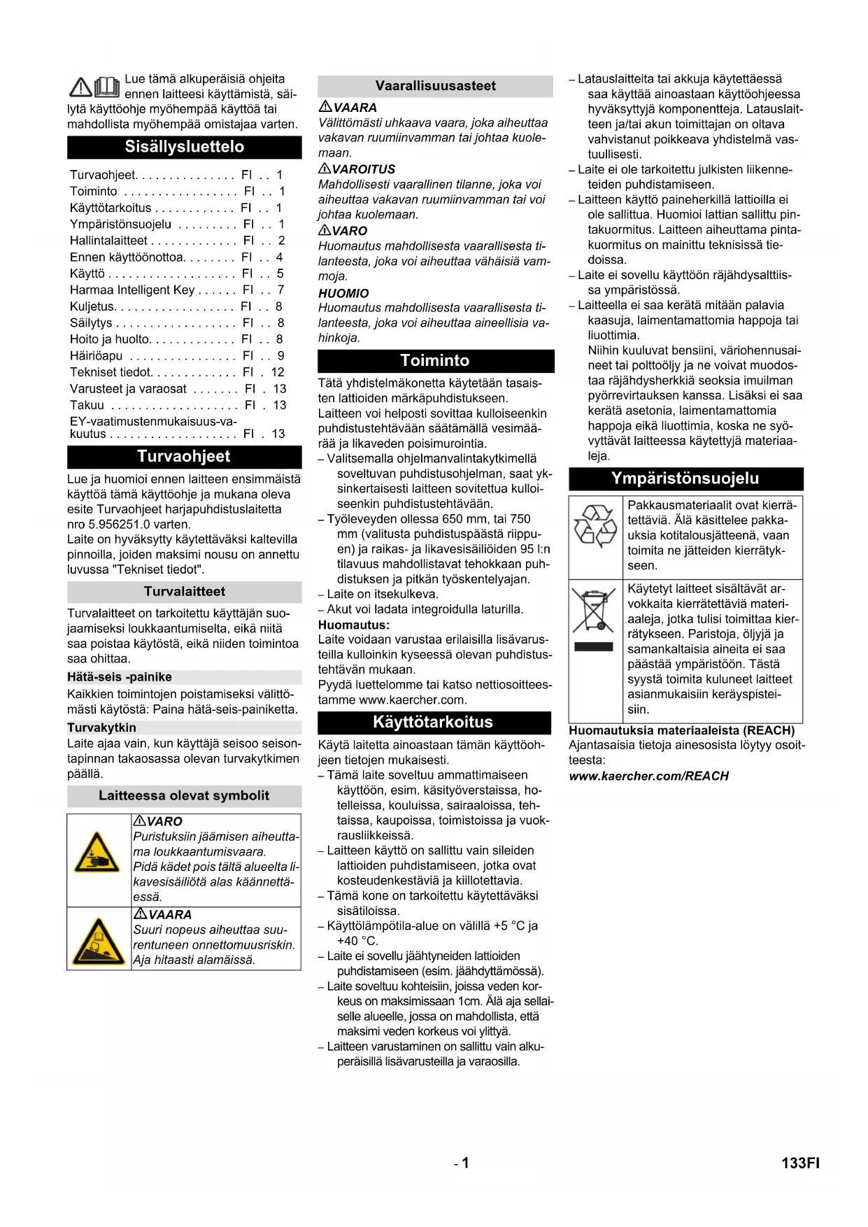 Chairman of the Board of Management Director Regulatory Affairs & Certification 132 SV- 1 Lue tämä alkuperäisiä ohjeita ennen laitteesi käyttämistä, säi- lytä käyttöohje myöhempää käyttöä tai mahdollista myöhempää omistajaa varten. Lue ja huomioi ennen laitteen ensimmäistä käyttöä tämä käyttöohje ja mukana oleva esite Turvaohjeet harjapuhdistuslaitetta nro 5.956251.0 varten. Laite on hyväksytty käytettäväksi kaltevilla pinnoilla, joiden maksimi nousu on annettu luvussa "Tekniset tiedot". Turvalaitteet on tarkoitettu käyttäjän suo- jaamiseksi loukkaantumiselta, eikä niitä saa poistaa käytöstä, eikä niiden toimintoa saa ohittaa. Kaikkien toimintojen poistamiseksi välittö- mästi käytöstä: Paina hätä-seis-painiketta. Laite ajaa vain, kun käyttäjä seisoo seison- tapinnan takaosassa olevan turvakytkimen päällä. VAARA Välittömästi uhkaava vaara, joka aiheuttaa vakavan ruumiinvamman tai johtaa kuole- maan. 몇 VAROITUS Mahdollisesti vaarallinen tilanne, joka voi aiheuttaa vakavan ruumiinvamman tai voi johtaa kuolemaan. 몇 VARO Huomautus mahdollisesta vaarallisesta ti- lanteesta, joka voi aiheuttaa vähäisiä vam- moja. HUOMIO Huomautus mahdollisesta vaarallisesta ti- lanteesta, joka voi aiheuttaa aineellisia va- hinkoja. Tätä yhdistelmäkonetta käytetään tasais- ten lattioiden märkäpuhdistukseen. Laitteen voi helposti sovittaa kulloiseenkin puhdistustehtävään säätämällä vesimää- rää ja likaveden poisimurointia. – Valitsemalla ohjelmanvalintakytkimellä soveltuvan puhdistusohjelman, saat yk- sinkertaisesti laitteen sovitettua kulloi- seenkin puhdistustehtävään. – Työleveyden ollessa 650 mm, tai 750 mm (valitusta puhdistuspäästä riippu- en) ja raikas- ja likavesisäiliöiden 95 l:n tilavuus mahdollistavat tehokkaan puh- distuksen ja pitkän työskentelyajan. – Laite on itsekulkeva. – Akut voi ladata integroidulla laturilla. Huomautus: Laite voidaan varustaa erilaisilla lisävarus- teilla kulloinkin kyseessä olevan puhdistus- tehtävän mukaan. Pyydä luettelomme tai katso nettiosoittees- tamme www.kaercher.com. Käytä laitetta ainoastaan tämän käyttöoh- jeen tietojen mukaisesti. – Tämä laite soveltuu ammattimaiseen käyttöön, esim. käsityöverstaissa, ho- telleissa, kouluissa, sairaaloissa, teh- taissa, kaupoissa, toimistoissa ja vuok- rausliikkeissä. – Laitteen käyttö on sallittu vain sileiden lattioiden puhdistamiseen, jotka ovat kosteudenkestäviä ja kiillotettavia. – Tämä kone on tarkoitettu käytettäväksi sisätiloissa. – Käyttölämpötila-alue on välillä +5 °C ja +40 °C. – Laite ei sovellu jäähtyneiden lattioiden puhdistamiseen (esim. jäähdyttämössä). – Laite soveltuu kohteisiin, joissa veden kor- keus on maksimissaan 1cm. Älä aja sellai- selle alueelle, jossa on mahdollista, että maksimi veden korkeus voi ylittyä. – Laitteen varustaminen on sallittu vain alku- peräisillä lisävarusteilla ja varaosilla. – Latauslaitteita tai akkuja käytettäessä saa käyttää ainoastaan käyttöohjeessa hyväksyttyjä komponentteja. Latauslait- teen ja/tai akun toimittajan on oltava vahvistanut poikkeava yhdistelmä vas- tuullisesti. – Laite ei ole tarkoitettu julkisten liikenne- teiden puhdistamiseen. – Laitteen käyttö paineherkillä lattioilla ei ole sallittua. Huomioi lattian sallittu pin- takuormitus. Laitteen aiheuttama pinta- kuormitus on mainittu teknisissä tie- doissa. – Laite ei sovellu käyttöön räjähdysalttiis- sa ympäristössä. – Laitteella ei saa kerätä mitään palavia kaasuja, laimentamattomia happoja tai liuottimia. Niihin kuuluvat bensiini, väriohennusai- neet tai polttoöljy ja ne voivat muodos- taa räjähdysherkkiä seoksia imuilman pyörrevirtauksen kanssa. Lisäksi ei saa kerätä asetonia, laimentamattomia happoja eikä liuottimia, koska ne syö- vyttävät laitteessa käytettyjä materiaa- leja. Huomautuksia materiaaleista (REACH) Ajantasaisia tietoja ainesosista löytyy osoit- teesta: www.kaercher.com/REACH Sisällysluettelo Turvaohjeet. . . . . . . . . . . . . . . FI . . 1 Toiminto . . . . . . . . . . . . . . . . . FI . . 1 Käyttötarkoitus . . . . . . . . . . . . FI . . 1 Ympäristönsuojelu . . . . . . . . . FI . . 1 Hallintalaitteet . . . . . . . . . . . . . FI . . 2 Ennen käyttöönottoa. . . . . . . . FI . . 4 Käyttö . . . . . . . . . . . . . . . . . . . FI . . 5 Harmaa Intelligent Key . . . . . . FI . . 7 Kuljetus. . . . . . . . . . . . . . . . . . FI . . 8 Säilytys . . . . . . . . . . . . . . . . . . FI . . 8 Hoito ja huolto. . . . . . . . . . . . . FI . . 8 Häiriöapu . . . . . . . . . . . . . . . . FI . . 9 Tekniset tiedot. . . . . . . . . . . . . FI . 12 Varusteet ja varaosat . . . . . . . FI . 13 Takuu . . . . . . . . . . . . . . . . . . . FI . 13 EY-vaatimustenmukaisuus-va- kuutus . . . . . . . . . . . . . . . . . . . FI . 13 Turvaohjeet Turvalaitteet Hätä-seis -painike Turvakytkin Laitteessa olevat symbolit 몇 VARO Puristuksiin jäämisen aiheutta- ma loukkaantumisvaara. Pidä kädet pois tältä alueelta li- kavesisäiliötä alas käännettä- essä. VAARA Suuri nopeus aiheuttaa suu- rentuneen onnettomuusriskin. Aja hitaasti alamäissä. Vaarallisuusasteet Toiminto Käyttötarkoitus Ympäristönsuojelu Pakkausmateriaalit ovat kierrä- tettäviä. Älä käsittelee pakka- uksia kotitalousjätteenä, vaan toimita ne jätteiden kierrätyk- seen. Käytetyt laitteet sisältävät ar- vokkaita kierrätettäviä materi- aaleja, jotka tulisi toimittaa kier- rätykseen. Paristoja, öljyjä ja samankaltaisia aineita ei saa päästää ympäristöön. Tästä syystä toimita kuluneet laitteet asianmukaisiin keräyspistei- siin. 133FI- 2 1 Ohjauspyörä 2 Täyttöjärjestelmä 3 Suljin, likavesisäiliö 4 Likavesisäiliön kansi 5 Turbiinin suojasihti (uimurin alla) 6 Uimuri 7 Nukkasihti 8 Karkealikaerotin 9 Likavesisäiliö 10 Likaveden laskuletku 11 Tuorevesisäiliön suodattimella varus- tettu sulku