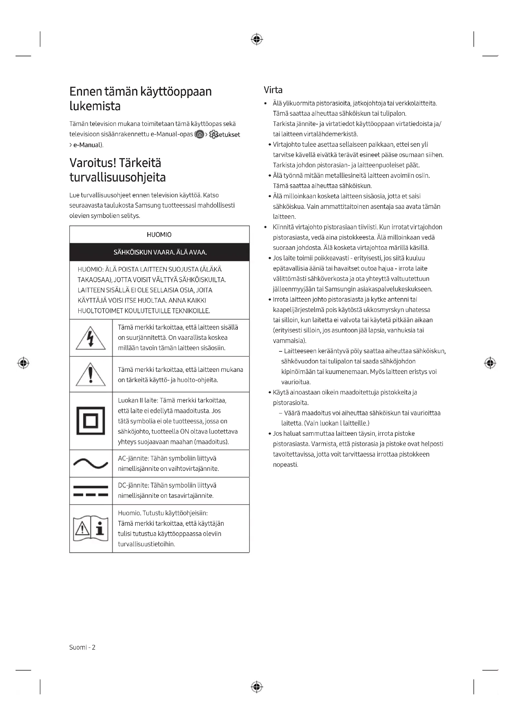 - Jos haluat sammuttaa laitteen täysin, irrota pistoke pistorasiasta. Varmista, että pistorasia ja pistoke ovat helposti tavoitettavissa, jotta voit tarvittaessa irrottaa pistokkeen nopeasti. Suomi Suomi - 2Asentaminen